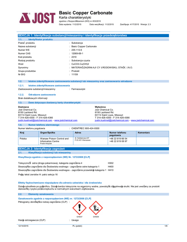 Basic Copper Carbonate Karta charakterystyki zgodnie z Rozporządzeniem (W E) nr 453/2010 Data wydania: 11/2/2015 Data weryfikacji: 11/2/2015 Zastępuje: 4/17/2015 Wersja: 2.3 SEKCJA 1: Identyfikacja substancji/mieszaniny i identyfikacja przedsiębiorstwa 1.1. Identyfikator produktu Postać produktu : Substancja Nazwa substancji : Basic Copper Carbonate Numer WE : 235-113-6 Numer CAS : 12069-69-1 Kod produktu : 2310 Rodzaj produktu : Substancja czysta Wzór : CuCO3.Cu(OH)2 Synonimy : MATERIAŁ ZAGRAŻAJĄCY ŚRODOWISKU, STAŁY, I.N.O. Grupa produktów : Produkt Nr BIG : 11159 1.2. Istotne zidentyfikowane zastosowania substancji lub mieszaniny oraz zastosowania odradzane 1.2.1. Istotne zidentyfikowane zastosowania Zastosowanie substancji/mieszaniny 1.2.2. : Farmaceutyki Odradzane zastosowanie Brak dodatkowych inform acji 1.3. Dane dotyczące dostawcy karty charakterystyki Dostawca Jost Chemical Co. 8150 Lackland Rd. 63114 Saint Louis, Missouri T 314-428-4300 - F 314-428-4366 [email protected] - www.jostchemical.com 1.4. Wytwórca Jost Chemical Co. 8150 Lackland Rd. 63114 Saint Louis, Missouri T 314-428-4300 - F 314-428-4366 [email protected] - www.jostchemical.com Numer telefonu alarmowego Numer telefonu pogotowia : CHEMTREC 800-424-9300 Kraj Organ/Spółka Adres Polska Warsaw Poison Control and Information Centre Al. Solidarnosci 67 P-03 401 Warszawa Numer telefonu pogotowia +48 22 619 66 54 +48 22 619 08 97 Komentarz Praski Hospital SEKCJA 2: Identyfikacja zagrożeń 2.1. Klasyfikacja substancji lub mieszaniny Klasyfikacja zgodnie z rozporządzeniem (WE) Nr. 1272/2008 [CLP]Mieszanina/Substancja: Karta SDS UE 2015: Zgodnie z Rozporządzeniem (UE) 2015/830 (Załącznik II Rozporządzenia REACH) Toksyczność ostra (droga pokarmowa), kategoria zagrożenia 4 H302 Stwarzające zagrożenie dla środowiska wodnego - zagrożenie ostre kategoria 1 H400 Stwarzające zagrożenie dla środowiska wodnegoo - zagrożenie przewlekłe kategoria 1 H410 Pełny tekst zwrotów H: patrz sekcja 16 Efekty fizykochemiczne niepożądane dla zdrowia człowieka i dla środowiska Działa szkodliwie po połknięciu. Działa bardzo toksycznie na organizmy wodne, powodując długotrwałe skutki. Nie jest uważany za produkt stanowiący ryzyko pożaru/wybuchu w normalnych warunkach użytkowania. 2.2. Elementy oznakowania Oznakowanie zgodnie z rozporządzeniem (WE) nr. 1272/2008 [CLP] Extra labelling to displayExtra classification(s) to display Piktogramy określające rodzaj zagrożenia (CLP) : GHS07 Hasło ostrzegawcze (CLP) 12/14/2015 GHS09 : Uwaga PL (polski) 1/8 Basic Copper Carbonate Karta charakterystyki zgodnie z Rozporządzeniem (WE) nr 453/2010 Zwroty wskazujące rodzaj zagrożenia (CLP) : H302 - Działa szkodliwie po połknięciu H410 - Działa bardzo toksycznie na organizmy wodne, powodując długotrwałe skutki Zwroty wskazujące środki ostrożności (CLP) : P264 - Dokładnie umyć ręce po użyciu P273 - Unikać uwolnienia do środowiska P301+P312 - W PRZYPADKU POŁKNIĘCIA: W przypadku złego samopoczucia skontaktować się z OŚRODKIEM ZATRUĆ lub z lekarzem 2.3. Inne zagrożenia Inne zagrożenia mające wpływ na klasyfikację : Żadne, zgodnie z posiadaną wiedzą. PBT: jeszcze nieocenione vPvB: jeszcze nieocenione SEKCJA 3: Skład/informacja o składnikach 3.1. Substancja Rodzaj substancji : Jednoskładnikowa Nazwa Identyfikator produktu % Basic Copper Carbonate (Numer CAS) 12069-69-1 (Numer WE) 235-113-6 100 Pełne brzmienie zwrotów H: patrz sekcja 16. 3.2. Mieszanina Nie dotyczy SEKCJA 4: Środki pierwszej pomocy 4.1. Opis środków pierwszej pomocy Pierwsza pomoc - środki ogólnie : Sprawdzić funkcje życiowe. W przypadku utraty przytomności: odpowiednio utrzymywać swobodny przepływ powietrza przez drogi oddechowe i oddychanie u ofiary. Zatrzymanie oddychania: sztuczne oddychanie lub tlen. Zatrzymanie akcji serca: przeprowadzić resuscytację. Poszkodowany przytomny, utrudnione oddychanie: pozycja półsiedząca. Poszkodowany w szoku: na plecach, nogi nieco uniesione. Wymioty: zapobiegać utracie przytomności i aspiracyjnemu zapaleniu płuc. Zapobiegać wychłodzeniu przykrywając poszkodowanego (nie ogrzewać). Obserwować poszkodowanego. Udzielić pomocy psychologicznej. Poszkodowany powinien pozostawać w spokoju, unikać wysiłku fizycznego. Zależnie od stanu poszkodowanego: lekarz/szpital. Pierwsza pomoc - środki po zainhalowaniu : Przenieść ofiarę na swieże powietrze. Przy problemach z oddychaniem: zasięgnąć porady lekarza/służ. Pierwsza pomoc - środki po kontakcie ze skórą : Spłukać wodą. Można użyć mydła. Nie stosować (chemicznych) orodków neutralizacyjnych. Udać się z ofiarą do lekarza, gdy podrażnienie utrzymuje się. Pierwsza pomoc - środki po kontakcie z oczami : Spłukać wodą. Nie stosować środków neutralizujących. Udać się z ofiarą do okulisty, gdy podrażnienie utrzymuje si. Pierwsza pomoc - środki po połknięciu : Przepłukać usta wodą. Porozumieć się z Centrum Informacji Toksykologicznej. W razie zesłabnięcia: zasięgnąć porady lekarza/służby zdrowia. Przy połknięciu dużych ilości: natychmiast do szpitala. 4.2. Najważniejsze ostre i opóźnione objawy oraz skutki narażenia Symptomy/urazy w przypadku inhalacji : Suche/bolące gardło. Podrażnienie dróg oddechowych/kaszel. Podrażnienie śluzówki nosa. Symptomy/urazy w przypadku kontaktu ze skórą : Efekty nieznane. Symptomy/urazy w przypadku kontaktu z oczami : Lekkie podrażnienie. Symptomy/urazy w przypadku połknięcia : Skargi na żołądek/jelita. Wymioty. Ból brzucha. Biegunka. Objawy przewlekłe : Wysypka/zapalenie. Zmiana w obrazie/składze krwi. Powiększenie/uszkodzenie wątroby. Osłabienie funkcji nerek. 4.3. Wskazania dotyczące wszelkiej natychmiastowej pomocy lekarskiej i szczególnego postępowania z poszkodowanym Leczenie objawowe. SEKCJA 5: Postępowanie w przypadku pożaru 5.1. Środki gaśnicze Odpowiednie środki gaśnicze : Dostosować środki 