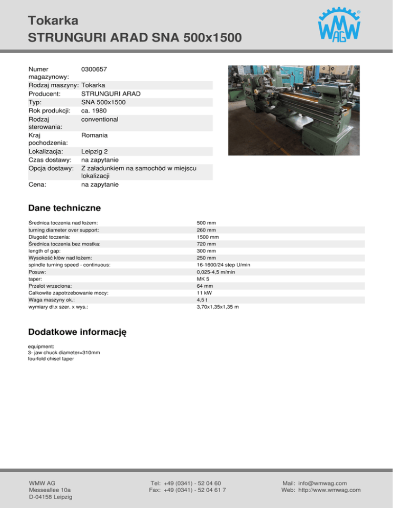 Tokarka STRUNGURI ARAD SNA 500x1500 Numer magazynowy: Rodzaj maszyny: Producent: Typ: Rok produkcji: Rodzaj sterowania: Kraj pochodzenia: Lokalizacja: Czas dostawy: Opcja dostawy: Cena: 0300657 Tokarka STRUNGURI ARAD SNA 500x1500 ca. 1980 conventional Romania Leipzig 2 na zapytanie Z załadunkiem na samochòd w miejscu lokalizacji na zapytanie Dane techniczne Średnica toczenia nad łożem: turning diameter over support: Długość toczenia: Średnica toczenia bez mostka: length of gap: Wysokość kłòw nad łożem: spindle turning speed - continuous: Posuw: taper: Przelot wrzeciona: Całkowite zapotrzebowanie mocy: Waga maszyny ok.: wymiary dł.x szer. x wys.: 500 mm 260 mm 1500 mm 720 mm 300 mm 250 mm 16-1600/24 step U/min 0,025-4,5 m/min MK 5 64 mm 11 kW 4,5 t 3,70x1,35x1,35 m Dodatkowe informację equipment: 3- jaw chuck diameter=310mm fourfold chisel taper WMW AG Messeallee 10a D-04158 Leipzig Powered by TCPDF (www.tcpdf.org) Tel: +49 (0341) - 52 04 60 Fax: +49 (0341) - 52 04 61 7 Mail: [email protected] Web: http://www.wmwag.com