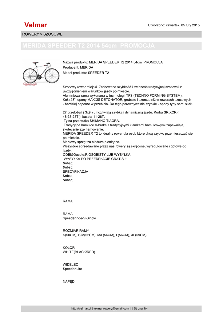 Velmar Utworzono: czwartek, 05 luty 2015 ROWERY > SZOSOWE MERIDA SPEEDER T2 2014 54cm PROMOCJA Nazwa produktu: MERIDA SPEEDER T2 2014 54cm PROMOCJA Producent: MERIDA Model produktu: SPEEDER T2 Szosowy rower miejski. Zachowana szybkość i zwinność tradycyjnej szosowki z uwzględnieniem warunkow jazdy po mieście. Aluminiowa rama wykonana w technologii TFS (TECHNO FORMING SYSTEM). Koła 28", opony MAXXIS DETONATOR, grubsze i szersze niż w rowerach szosowych - bardziej odporne w przebicia. Do tego porownywalnie szybkie - opony typy semi slick. 27 przełożeń ( 3x9 ) umożliwiają szybką i dynamiczną jazdę. Korba SR XCR ( 48-38-28T ), kaseta 11-28T. Tylna przerzutka SHIMANO TIAGRA. Tradycyjne hamulce V-brake z tradycyjnymi klamkami hamulcowymi zapewniają skuteczniejsze hamowanie. MERIDA SPEEDER T2 to idealny rower dla osob ktore chcą szybko przemieszczać się po mieście. Markowy sprzęt za nieduże pieniądze. Wszystkie sprzedawane przez nas rowery są skręcone, wyregulowane i gotowe do jazdy. ODBIÓR OSOBISTY LUB WYSYŁKA. WYSYŁKA PO PRZEDPŁACIE GRATIS !!! SPECYFIKACJA RAMA RAMA Speeder ride-V-Single ROZMIAR RAMY S(50CM), S/M(52CM), M/L(54CM), L(56CM), XL(59CM) KOLOR WHITE(BLACK/RED) WIDELEC Speeder Lite NAPĘD http://velmar.pl | [email protected] | | Strona 1/4 Velmar Utworzono: czwartek, 05 luty 2015 ROWERY > SZOSOWE MERIDA SPEEDER T2 2014 54cm PROMOCJA PRZEŁOŻENIA 27 PRZERZUTKA P Shimano M371 48 PRZERZUTKA T Shimano TIAGRA GS MANETKA P/T Shimano Altus rapidfire KORBA SR XCR 48A-38-28 CG KASETA Sunrace CS-R9 11-28 ŁAŃCUCH KMC X9 9s KOŁA ROZMIAR KÓŁ 700C PIASTA P/T Alloy QR/ Shimano 2200 OBRĘCZE Merida comp V-Pair SZPRYCHY Black stainless-P OPONA P/T Maxxis Detonator 32 60 KOMPONENTY HAMULEC P/T http://velmar.pl | [email protected] | | Strona 2/4 Velmar Utworzono: czwartek, 05 luty 2015 ROWERY > SZOSOWE MERIDA SPEEDER T2 2014 54cm PROMOCJA V-Brake Linear KIEROWNICA MERIDA comp OS 660 Flat MOSTEK Merida Comp OS 7° SIODŁO MERIDA Pro SI SZTYCA MERIDA comp SB12 31.6 PEDAŁY Lite Alloy DOBÓR RAMY (kliknij aby powiększyć) ZASTOSOWANE TECHNOLOGIE TFS TECHNO FORMING SYSTEM Produkcja giętych rur ze stopu RaceLite 6061 metodą mechanicznego tłoczenia rur na gorąco. SMOOTH WELDING Wygładzanie spawow za pomocą odpowiednich technik spawania - ulepszony wygląd bez pogorszenia struktury spawu. http://velmar.pl | [email protected] | | Strona 3/4 Velmar Utworzono: czwartek, 05 luty 2015 ROWERY > SZOSOWE MERIDA SPEEDER T2 2014 54cm PROMOCJA INTERNAL CABLE Linka tylnego hamulca biegnie wewnątrz rury gornej – w niektorych modelach linka przerzutki biegnie w rurze dolnej. To rozwiązanie nie tylko poprawia wygląd roweru, ale także chroni linki przed zabrudzeniem. RACELITE 6061 ALUMINIUM Niezwykle lekki i mocny stop używany także w przemyśle lotniczym. MERIDA poddaje go dodatkowemu hartowaniu, tworząc podwojnie cieniowane lekkie i sztywne rury. ____________________ Paragon albo faktura VAT GWARANCJA 2 LATA Cena: 2599.00zł Cena promocyjna: 2199.01zł Opcje dostępne dla MERIDA SPEEDER T2 2014 54cm PROMOCJA : rozmiar ramy 54. Dostępność: Ten produkt został dodany do sklepu w dniu piątek, 01 sierpień 2014 http://velmar.pl | [email protected] | | Strona 4/4