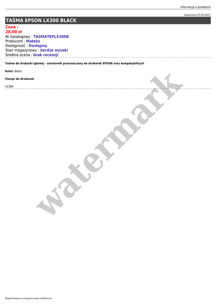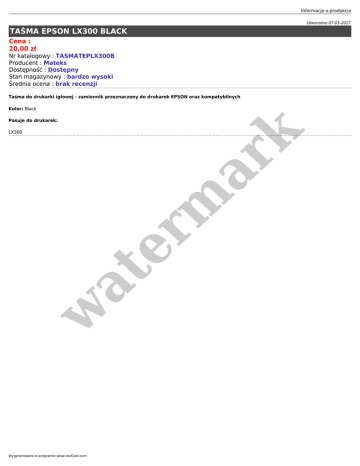 Informacje o produkcie Utworzono 07-03-2017 TAŚMA EPSON LX300 BLACK Cena : 20,00 zł Nr katalogowy : TASMATEPLX300B Producent : Mateks Dostępność : Dostępny Stan magazynowy : bardzo wysoki Średnia ocena : brak recenzji Taśma do drukarki igłowej - zamiennik przeznaczony do drukarek EPSON oraz kompatybilnych Kolor: Black Pasuje do drukarek: w at er m ar k LX300 Wygenerowano w programie www.oscGold.com