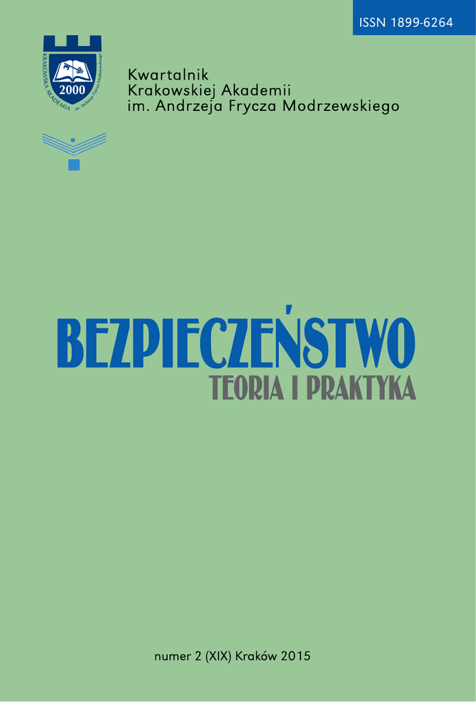 BEZPIECZEĠSTWO TEORIA I PRAKTYKA SECURITY THEORY AND PRACTICE number 2 (XIX), April–June, Krakow 2015 Kwartalnik Krakowskiej Akademii im. Andrzeja Frycza Modrzewskiego BEZPIECZEĠSTWO TEORIA I PRAKTYKA numer 2 (XIX), kwiecień–czerwiec, Kraków 2015 BEZPIECZEŃSTWO TEORIA I PRAKTYKA Kwartalnik Krakowskiej Akademii im. Andrzeja Frycza Modrzewskiego Adres redakcji ul. Gustawa Herlinga-Grudzińskiego 1C, lok. C224 30-705 Kraków tel. (12) 25 24 666 e-mail: [email protected] btip.ka.edu.pl Czasopismo punktowane w rankingu Ministerstwa Nauki i Szkolnictwa Wyższego oraz indeksowane w bazie naukowej IC Journal Master List. Rada Wydawnicza Krakowskiej Akademii im. Andrzeja Frycza Modrzewskiego Klemens Budzowski, Maria Kapiszewska, Zbigniew Maciąg, Jacek M. Majchrowski Rada Naukowa Mieczysław Bieniek (Polska), Anatolij Demianczuk (Ukraina), Taras Finikov (Ukraina) Marco Gestri (Włochy), Ján Buzalka (Słowacja), Magdolna Laczay (Węgry), Sławomir Mazur (Polska), Jan Widacki (Polska), Wiesław Wróblewski (Polska – przewodniczący), Stanisław Wydymus (Polska) Redaktor naczelny Klemens Budzowski Redaktorzy tematyczni Andrzej Chodyński Marcin Lasoń Beata Molo Redaktor statystyczny Piotr Stefanów Sekretarz redakcji Halina Baszak-Jaroń Redaktorzy językowi Kamil Jurewicz, Daria Podgórska Tłumaczenia i korekta abstraktów język rosyjski: Oleg Aleksejczuk język angielski: Studium Języków Obcych KA AFM Projekt okładki i stron tytułowych Joanna Sroka, Oleg Aleksejczuk Łamanie Oleg Aleksejczuk Copyright© by Krakowska Akademia im. Andrzeja Frycza Modrzewskiego Kraków 2015 ISSN 1899-6264 Druk MKpromo Nakład: 200 egz. Wersją pierwotną czasopisma jest wydanie papierowe. Redakcja nie zwraca materiałów niezamówionych. Decyzja o opublikowaniu tekstu uzależniona jest od opinii redakcji i recenzentów. Redakcja zastrzega sobie prawo modyfikowania tytułów i skracania tekstów przeznaczonych do druku. Artykuły powinny być przesyłane w dwóch egzemplarzach wraz z wersją elektroniczną. Na zlecenie Krakowskiej Akademii im. Andrzeja Frycza Modrzewskiego www.ka.edu.pl Wydawca Oficyna Wydawnicza AFM, Kraków 2015 Sprzedaż prowadzi Księgarnia „U Frycza” Kampus Krakowskiej Akademii im. Andrzeja Frycza Modrzewskiego ul. Gustawa Herlinga-Grudzińskiego 1A 30-705 Kraków tel./fax: (12) 252 45 93 e-mail: [email protected] 2015 nr 2014 nr 24 (XVII) BEZPIECZEĠSTWO • TEORIA I PRAKTYKA Spis treści ARTYKUŁY I MATERIAŁY Rafał Raczyński: Wpływ migracji międzynarodowych na bezpieczeństwo wewnętrzne państwa 13 Wojciech Jędrzejewski, Michał Romańczuk: Bezpieczeństwo Azji Centralnej w kontekście strategii współpracy USA i ChRL z państwami regionu 31 Ewa Wolska-Liśkiewicz: Dlaczego w polskiej armii nie ma kobiet-generałów? 47 Ryszard Lelito: Podejście procesowe w naukach o bezpieczeństwie i obronności 61 Z KART HISTORII Anna Kargol: Metafizyka i polityka. Andrzej Strug o charyzmie i micie Józefa Piłsudskiego 73 RECENZJE Robert Borkowski: Scotia J. Hicks, Bruce D. Sales, Profilowanie kryminalne przełożyła Anna Sawicka-Chrapkowicz, redakcja naukowa wydania polskiego Bogdan Lach 91 Janusz Ziarko: Współzarządzanie publiczne, redakcja Stanisław Mazur 95 Spis treści KOMUNIKATY, SPRAWOZDANIA, VARIA Erhard Cziomer: Komunikat nr 1/2015 dotyczący prac związanych z uruchomieniem projektu badawczego nr 00285/2015/KJ współfinansowanego przez Fundację Współpracy Polsko-Niemieckiej (FWPN) w Warszawie 103 STRESZCZENIA 107 INFORMACJE DLA AUTORÓW 115 2015 nr 2014 nr24 (XVII) SECURITY • THEORY AND PRACTICE Contents ARTICLES AND MATERIALS Rafał Raczyński: The impact of the interna onal migra ons on the state’s internal security 13 Wojciech Jędrzejewski, Michał Romańczuk: The security of Central Asia in the context of the USA and PRC coopera on strategies with the countries of the region 31 Ewa Wolska-Liśkiewicz: Why Are There No Female Generals in the Polish Army? 47 Ryszard Lelito: Process approach in security and defence sciences 61 FROM THE HISTORY Anna Kargol: Poli cs and metaphysics. Andrzej Strug about Józef Piłsudski’s myth and charisma 73 REVIEWS Robert Borkowski: Scotia J. Hicks, Bruce D. Sales, Profilowanie kryminalne przełożyła Anna Sawicka-Chrapkowicz, redakcja naukowa wydania polskiego Bogdan Lach 91 Janusz Ziarko: Współzarządzanie publiczne, redakcja Stanisław Mazur 95 Contents BULLETINS, REPORTS, VARIA Erhard Cziomer: Komunikat nr 1/2015 dotyczący prac związanych z uruchomieniem projektu badawczego nr 00285/2015/KJ współfinansowanego przez Fundację Współpracy Polsko-Niemieckiej (FWPN) w Warszawie 103 ABSTRACTS 107 INFORMATION FOR AUTHORS 115 2015 № 2 БЕЗОПАСНОСТЬ • TЕОРИЯ И ПРАКТИКА Содержание СТАТЬИ И МАТЕРИАЛЫ Rafał Raczyński: Влияние международной миграции на внутреннюю безопасность государства 13 Wojciech Jędrzejewski, Michał Romańczuk: Безопасность Центральной Азии в контексте стратегий сотрудничества США и КНР со странами региона 31 Ewa Wolska-Liśkiewicz: Почему в Вооружённых силах Польши нет женщин генералов? 47 Ryszard Lelito: Процессный подход в науках о безопасности и обороноспособности 61 СТРАНИЦЫ ИСТОРИИ Anna Kargol: Метафизика и политика. Анджей Струг о харизме и мифе Юзефа Пилсудского 73 РЕЦЕНЗИИ Robert Borkowski: Scotia J. Hicks, Bruce D. Sales, Profilowanie kryminalne przełożyła Anna Sawicka-Chrapkowicz, redakcja naukowa wydania polskiego Bogdan Lach 91 Janusz Ziarko: Współzarządzanie publiczne, redakcja Stanisław Mazur 95 Содержание СООБЩЕНИЯ, ОТЧЕТЫ, ВАРИА Erhard Cziomer: Коммюни