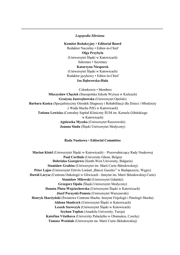 Logopedia Silesiana Komitet Redakcyjny • Editorial Board Redaktor Naczelny • Editor-in-Chief Olga Przybyla (Uniwersytet Śląski w Katowicach) Sekretarz • Secretary Katarzyna Niesporek (Uniwersytet Śląski w Katowicach) Redaktor językowy • Editor-in-Chief Iza Dąbrowska-Hula Członkowie • Members Mieczysław Chęciek (Staropolska Szkoła Wyższa w Kielcach) Grażyna Jastrzębowska (Uniwersytet Opolski) Barbara Kasica (Specjalistyczny Ośrodek Diagnozy i Rehabilitacji dla Dzieci i Młodzieży z Wada Słuchu PZG w Katowicach) Tatiana Lewicka (Centralny Szpital Kliniczny ŚUM im. Kornela Gibińskiego w Katowicach) Agnieszka Myszka (Uniwersytet Rzeszowski) Joanna Siuda (Śląski Uniwersytet Medyczny) Rada Naukowa • Editorial Committee Marian Kisiel (Uniwersytet Śląski w Katowicach) – Przewodniczący Rady Naukowej Paul Corthals (University Ghent, Belgia) Dobrinka Georgiewa (South-West University, Bułgaria) Stanisław Grabias (Uniwersytet im. Marii Curie-Skłodowskiej) Péter Lajos (Uniwersytet Eötvös Loránd „Bárczi Gusztáv” w Budapeszcie, Węgry) Dawid Larysz (Centrum Onkologii w Gliwicach - Instytut im. Marii Skłodowskiej-Curie) Stanisław Milewski (Uniwersytet Gdański) Grzegorz Opala (Śląski Uniwersytet Medyczny) Danuta Pluta-Wojciechowska (Uniwersytet Śląski w Katowicach) Józef Porayski-Pomsta (Uniwersytet Warszawski) Henryk Skarżyński (Światowe Centrum Słuchu. Instytut Fizjologii i Patologii Słuchu) Aldona Skudrzyk (Uniwersytet Śląski w Katowicach) Leszek Szewczyk (Uniwersytet Śląski w Katowicach) Seyhun Topbas (Anadolu University, Turcja) Kateřina Vitaškova (Univerzity Palackého w Ołomuńcu, Czechy) Tomasz Woźniak (Uniwersytet im. Marii Curie-Skłodowskiej) Rada Recenzyjna • Reviewers Committee Jacek Błeszyński (Uniwersytet im. Mikołaja Kopernika w Toruniu) Paul Corthals (University Ghent, Belgia) Ewa Czaplewska (Uniwersytet Gdański) Dobrinka Georgiewa (South-West University, Bułgaria) Grażyna Gunia (Uniwersytet Pedagogiczny im. KEN w Krakowie) Edward Łuczyński (Uniwersytet Gdański) Mirosław Michalik (Uniwersytet Pedagogiczny im. KEN w Krakowie) Kazimierz Ożóg (Uniwersytet Rzeszowski) Jolanta Panasiuk (Uniwersytet Marii Curie-Skłodowskiej) Małgorzata Rocławska-Daniluk (Uniwersytet Gdański)