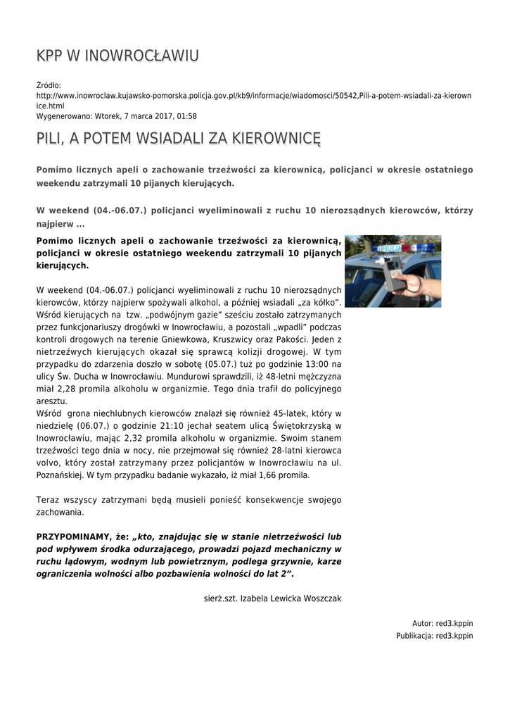 KPP W INOWROCŁAWIU Źródło: http://www.inowroclaw.kujawsko-pomorska.policja.gov.pl/kb9/informacje/wiadomosci/50542,Pili-a-potem-wsiadali-za-kierown ice.html Wygenerowano: Wtorek, 7 marca 2017, 01:58 PILI, A POTEM WSIADALI ZA KIEROWNICĘ Pomimo licznych apeli o zachowanie trzeźwości za kierownicą, policjanci w okresie ostatniego weekendu zatrzymali 10 pijanych kierujących. W weekend (04.-06.07.) policjanci wyeliminowali z ruchu 10 nierozsądnych kierowców, którzy najpierw ... Pomimo licznych apeli o zachowanie trzeźwości za kierownicą, policjanci w okresie ostatniego weekendu zatrzymali 10 pijanych kierujących. W weekend (04.-06.07.) policjanci wyeliminowali z ruchu 10 nierozsądnych kierowców, którzy najpierw spożywali alkohol, a później wsiadali „za kółko”. Wśród kierujących na tzw. „podwójnym gazie” sześciu zostało zatrzymanych przez funkcjonariuszy drogówki w Inowrocławiu, a pozostali „wpadli” podczas kontroli drogowych na terenie Gniewkowa, Kruszwicy oraz Pakości. Jeden z nietrzeźwych kierujących okazał się sprawcą kolizji drogowej. W tym przypadku do zdarzenia doszło w sobotę (05.07.) tuż po godzinie 13:00 na ulicy Św. Ducha w Inowrocławiu. Mundurowi sprawdzili, iż 48-letni mężczyzna miał 2,28 promila alkoholu w organizmie. Tego dnia trafił do policyjnego aresztu. Wśród grona niechlubnych kierowców znalazł się również 45-latek, który w niedzielę (06.07.) o godzinie 21:10 jechał seatem ulicą Świętokrzyską w Inowrocławiu, mając 2,32 promila alkoholu w organizmie. Swoim stanem trzeźwości tego dnia w nocy, nie przejmował się również 28-latni kierowca volvo, który został zatrzymany przez policjantów w Inowrocławiu na ul. Poznańskiej. W tym przypadku badanie wykazało, iż miał 1,66 promila. Teraz wszyscy zatrzymani będą musieli ponieść konsekwencje swojego zachowania. PRZYPOMINAMY, że: „kto, znajdując się w stanie nietrzeźwości lub pod wpływem środka odurzającego, prowadzi pojazd mechaniczny w ruchu lądowym, wodnym lub powietrznym, podlega grzywnie, karze ograniczenia wolności albo pozbawienia wolności do lat 2”. sierż.szt. Izabela Lewicka Woszczak Autor: red3.kppin Publikacja: red3.kppin Ocena: 0/5 (0) Tweetnij
