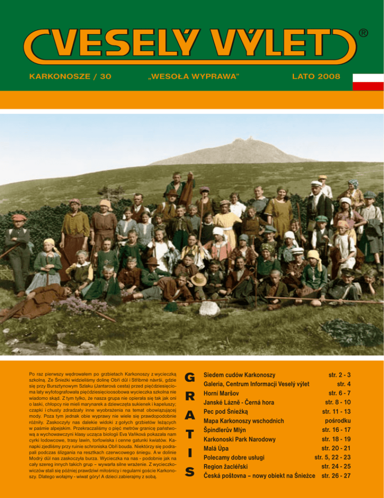 KARKONOSZE / 30 „WESOŁA WYPRAWA” Po raz pierwszy wędrowałem po grzbietach Karkonoszy z wycieczką szkolną. Ze Śnieżki widzieliśmy dolinę Obří důl i Stříbrné návrší, gdzie się przy Bursztynowym Szlaku (Jantarová cesta) przed pięćdziesięcioma laty wyfotografowała pięćdziesięcioosobowa wycieczka szkolna nie wiadomo skąd. Z tym tylko, że nasza grupa nie opierała się tak jak oni o laski, chłopcy nie mieli marynarek a dziewczęta sukienek i kapeluszy; czapki i chusty zdradzały inne wyobrażenia na temat obowiązującej mody. Poza tym jednak obie wyprawy nie wiele się prawdopodobnie różniły. Zaskoczyły nas dalekie widoki z gołych grzbietów leżących w paśmie alpejskim. Przekraczaliśmy o pięć metrów granicę państwową a wychowawczyni klasy ucząca biologii Eva Vaňková pokazała nam cyrki lodowcowe, trasy lawin, torfowiska i cenne gatunki kwiatów. Kanapki zjedliśmy przy ruinie schroniska Obří bouda. Niektórzy się podrapali podczas ślizgania na resztkach czerwcowego śniegu. A w dolinie Modrý důl nas zaskoczyła burza. Wycieczka na nas - podobnie jak na cały szereg innych takich grup – wywarła silne wrażenie. Z wycieczkowiczów stali się później prawdziwi miłośnicy i regularni goście Karkonoszy. Dlatego wołajmy - wiwat góry! A dzieci zabierajmy z sobą. G R A T I S LATO 2008 Siedem cudów Karkonoszy str. 2 - 3 str. 4 Galeria, Centrum Informacji Veselý výlet str. 6 - 7 Horní Maršov str. 8 - 10 Janské Lázně - Černá hora str. 11 - 13 Pec pod Śnieżką pośrodku Mapa Karkonoszy wschodnich str. 16 - 17 Špindlerův Mlýn str. 18 - 19 Karkonoski Park Narodowy str. 20 - 21 Malá Úpa str. 5, 22 - 23 Polecamy dobre usługi str. 24 - 25 Region žacléřski Česká poštovna – nowy obiekt na Śnieżce str. 26 - 27 SIEDEM CUDÓW 2 Siedem cudów Karkonoszy według Wesołej Wyprawy to obiekty, z którymi wiąże się dramatyczna historia ich ratowania. Cudem tak jest przede wszystkim powstanie z popiołów niemalże zanikłych zabytków. Dzięki wysiłkowi konkretnych ludzi udało się te obiekty poznać, zaproponować i przygotować rekonstrukcję, zorganizować pieniądze i stworzyć cele kuszące ciekawych i żądnych poznawania turystów. Najczęściej nie dostaną się tam samochodem więc poznawanie muszą połączyć ze spacerem w górskiej przyrodzie. Oryginalna świątynia norweska Wang w Karpaczu Górnym Pomnik Bertholda Aichelburga w Temnym dole Ścieżka w Klausovym dole w uzdrowisku Janské Lázně KARKONOSZY Zwiedzające historyczną kopalnię Kovárna w dolinie Obří důl Roku Pańskiego 1175 By poznać pierwszy i najstarszy z cudów karkonoskich należy przejść na północną, czyli polską stronę gór. W najwyższym miejscu centrum turystyki górskiej w Karpaczu Górnym stoi świątynia Wikingów z 1175 roku. W Norwegii powstało ponad tysiąc stavkyrkje, czyli kościołów kolumnowych, ale zachowało się ich zaledwie trzydzieści. Dla kraju leżącego na dalekiej północy są zabytkiem najwyższej klasy. Konstrukcja dachu nie spoczywa na ścianach obwodowych, ale jest zawieszona na wysokich drewnianych kolumnach wyciosanych z pni drzew pozostawionych na słońcu i deszczu przez okres dwunastu lat. Tak przygotowane słupy impregnowane jeszcze smołą z węgla drzewnego wytrzymały ponad osiemset lat. W wiosce Wang w Norwegii środkowej w 1835 roku zapadła decyzja o sprzedaży prastarego drewnianego kościoła, by w ten sposób zyskać środki na wybudowanie nowego, większego. Światły malarz i profesor drezdeńskiej akademii sztuk pięknych Jan Kristian Dahl zrozumiał nadarzającą się niepowtarzalną okazję i w 1841 roku kupił kościół bez dachu w licytacji w wiosce Wang. Przekonał króla pruskiego Fryderyka Wilhelma IV, aby pokrył koszty inwentaryzacji, rozbiórki, transportu i ponownego zmontowania na północnych zboczach Karkonoszy gdzie hrabia Christian L. Schaffgotsch ofiarował kawałek gruntu. W uroczystości wyświęcenia kościoła na nowym miejscu, która odbyła się 28 lipca 1844 roku, wziął udział mecenas Fryderyk. Protestancką świątynię nazwano według miejsca jej pochodzenia – Wang. W Karkonoszach corocznie ją zwiedzi ponad dwieście tysięcy turystów. Ponoć więcej niż wszystkie świątynie w Norwegii łącznie. Otwarta jest codziennie poza wyznaczonymi godzinami, kiedy odprawiane są msze od 9 do 18 godziny (więcej informacji w Wesołej Wyprawie nr 10/1997 oraz w WW 21/2003). Droga Krzyżowa na Starej Górze w Marszowie Górnym Roku Pańskiego 1534 Udostępnienie drugiego cudu Karkonoszy w dolinie Obří důl wymusili wiecznie umazani błotem członkowie Czeskiego Towarzystwa Speleologicznego - oddziału Albeřice. Na arenie międzynarodwej biorą udział w odkrywaniu największych podziemnych jaskiń, ale w domu geologiczna budowa Karkonoszy nadziei na wielkie odkrycia dużych szans nie daje. Dlatego pole swoich badań poszerzyli o prezentację starych kopalń. Do labiryntu korytarzy wygrzebanych w masywie Śnieżki z przerwami co najmniej od roku 1534 – do roku 1959. Po raz pierwszy spuścili się do tutejszych starych kopalń w 1988 roku. Udostępnienie kompleksu opuszczonych kopalń historycznych z zawalonymi wejściami było wówczas nieosiągalnym marzeniem. By marzenia mogły się spełnić musiał się załamać cały system polityczny. Z pracy pod ziemią speleolodzy zrobili zawód, wytrwali w trzyletniej bitwie z urzędami o mnóstwo zezwoleń. Za pieniądze zarobione gdzie indziej odkopali i wzmocnili zawalone wejście, zabezpieczyli dwa pierwsze piętra podestami, drabinami i balustradami. Ze ścian chodników i kominów zmyli kurz i pył, by odkryć piękno skał. Po szesnastu latach od początku badań wprowadzili 2 lipca 2004 roku pierwszych turystów, by im pokazać wydrążone wnętrze Śnieżki. Zabytkowa kopalnia Kovárna jest czynna tylko w lipcu i sierpniu od czwartku do niedzieli (więcej WW 23/2004 oraz pod adresem www.veselyvylet.cz)