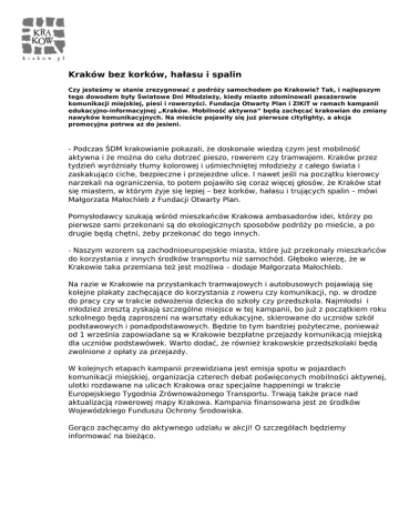 Kraków bez korków, hałasu i spalin Czy jesteśmy w stanie zrezygnować z podróży samochodem po Krakowie? Tak, i najlepszym tego dowodem były Światowe Dni Młodzieży, kiedy miasto zdominowali pasażerowie komunikacji miejskiej, piesi i rowerzyści. Fundacja Otwarty Plan i ZIKiT w ramach kampanii edukacyjno-informacyjnej „Kraków. Mobilność aktywna” będą zachęcać krakowian do zmiany nawyków komunikacyjnych. Na mieście pojawiły się już pierwsze citylighty, a akcja promocyjna potrwa aż do jesieni. - Podczas ŚDM krakowianie pokazali, że doskonale wiedzą czym jest mobilność aktywna i że można do celu dotrzeć pieszo, rowerem czy tramwajem. Kraków przez tydzień wyróżniały tłumy kolorowej i uśmiechniętej młodzieży z całego świata i zaskakująco ciche, bezpieczne i przejezdne ulice. I nawet jeśli na początku kierowcy narzekali na ograniczenia, to potem pojawiło się coraz więcej głosów, że Kraków stał się miastem, w którym żyje się lepiej – bez korków, hałasu i trujących spalin – mówi Małgorzata Małochleb z Fundacji Otwarty Plan. Pomysłodawcy szukają wśród mieszkańców Krakowa ambasadorów idei, którzy po pierwsze sami przekonani są do ekologicznych sposobów podróży po mieście, a po drugie będą chętni, żeby przekonać do tego innych. - Naszym wzorem są zachodnioeuropejskie miasta, które już przekonały mieszkańców do korzystania z innych środków transportu niż samochód. Głęboko wierzę, że w Krakowie taka przemiana też jest możliwa – dodaje Małgorzata Małochleb. Na razie w Krakowie na przystankach tramwajowych i autobusowych pojawiają się kolejne plakaty zachęcające do korzystania z roweru czy komunikacji, np. w drodze do pracy czy w trakcie odwożenia dziecka do szkoły czy przedszkola. Najmłodsi i młodzież zresztą zyskają szczególne miejsce w tej kampanii, bo już z początkiem roku szkolnego będą zaproszeni na warsztaty edukacyjne, skierowane do uczniów szkół podstawowych i ponadpodstawowych. Będzie to tym bardziej pożyteczne, ponieważ od 1 września zapowiadane są w Krakowie bezpłatne przejazdy komunikacją miejską dla uczniów podstawówek. Warto dodać, że również krakowskie przedszkolaki będą zwolnione z opłaty za przejazdy. W kolejnych etapach kampanii przewidziana jest emisja spotu w pojazdach komunikacji miejskiej, organizacja czterech debat poświęconych mobilności aktywnej, ulotki rozdawane na ulicach Krakowa oraz specjalne happeningi w trakcie Europejskiego Tygodnia Zrównoważonego Transportu. Trwają także prace nad aktualizacją rowerowej mapy Krakowa. Kampania finansowana jest ze środków Wojewódzkiego Funduszu Ochrony Środowiska. Gorąco zachęcamy do aktywnego udziału w akcji! O szczegółach będziemy informować na bieżąco. Powered by TCPDF (www.tcpdf.org)