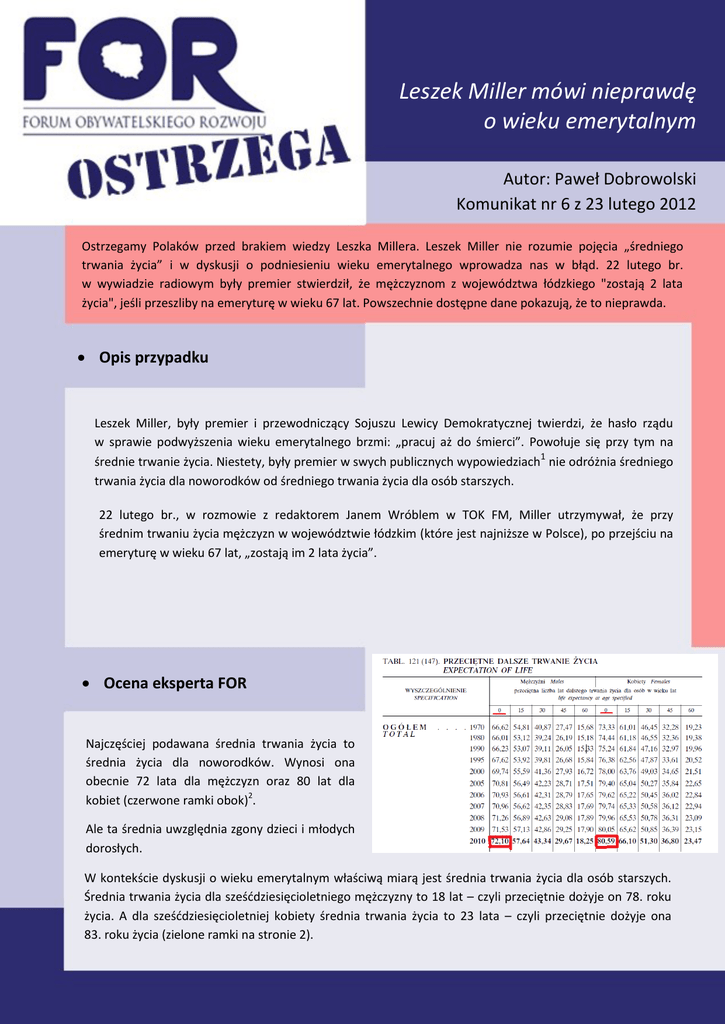 Leszek Miller mówi nieprawdę o wieku emerytalnym Autor: Paweł Dobrowolski Komunikat nr 6 z 23 lutego 2012 Ostrzegamy Polaków przed brakiem wiedzy Leszka Millera. Leszek Miller nie rozumie pojęcia „średniego trwania życia” i w dyskusji o podniesieniu wieku emerytalnego wprowadza nas w błąd. 22 lutego br. w wywiadzie radiowym były premier stwierdził, że mężczyznom z województwa łódzkiego "zostają 2 lata życia", jeśli przeszliby na emeryturę w wieku 67 lat. Powszechnie dostępne dane pokazują, że to nieprawda. Opis przypadku Leszek Miller, były premier i przewodniczący Sojuszu Lewicy Demokratycznej twierdzi, że hasło rządu w sprawie podwyższenia wieku emerytalnego brzmi: „pracuj aż do śmierci”. Powołuje się przy tym na średnie trwanie życia. Niestety, były premier w swych publicznych wypowiedziach1 nie odróżnia średniego trwania życia dla noworodków od średniego trwania życia dla osób starszych. 22 lutego br., w rozmowie z redaktorem Janem Wróblem w TOK FM, Miller utrzymywał, że przy średnim trwaniu życia mężczyzn w województwie łódzkim (które jest najniższe w Polsce), po przejściu na emeryturę w wieku 67 lat, „zostają im 2 lata życia”. Ocena eksperta FOR Najczęściej podawana średnia trwania życia to średnia życia dla noworodków. Wynosi ona obecnie 72 lata dla mężczyzn oraz 80 lat dla kobiet (czerwone ramki obok)2. Ale ta średnia uwzględnia zgony dzieci i młodych dorosłych. W kontekście dyskusji o wieku emerytalnym właściwą miarą jest średnia trwania życia dla osób starszych. Średnia trwania życia dla sześddziesięcioletniego mężczyzny to 18 lat – czyli przeciętnie dożyje on 78. roku życia. A dla sześddziesięcioletniej kobiety średnia trwania życia to 23 lata – czyli przeciętnie dożyje ona 83. roku życia (zielone ramki na stronie 2). Co to oznacza? Załóżmy, że podwyższenie wieku emerytalnego wprowadzamy już dziś, od razu, a nie rozkładamy na wiele lat, jak planuje rząd. Dzisiejszy sześddziesięcioletni mężczyzna, który przeszedłby na emeryturę w wieku 67 lat, przeciętnie będzie żył na tej emeryturze ponad 11 lat. Analogicznie, dzisiejsza sześddziesięciolatka, która przeszłaby na emeryturę w wieku 67 lat, może oczekiwad średnio 16 lat życia na emeryturze. W tej sytuacji Leszek Miller popełnia nadużycie i mówi nieprawdę, gdy określa propozycję rządu jako: „pracuj aż do śmierci”, nawet, gdyby przyjąd, że rząd wprowadza natychmiastowe podwyższenie wieku emerytalnego do 67. roku życia. A pamiętajmy, że propozycja rządu zupełnie niepotrzebnie rozkłada podwyższenie wieku emerytalnego na wiele lat, proponując jego powolne podwyższanie o 3 miesiące każdego roku. 22 lutego br., w rozmowie z redaktorem Janem Wróblem w TOK FM, były premier utrzymywał, że przy średnim trwaniu życia mężczyzn w województwie łódzkim (które jest najniższe w Polsce), po przejściu na emeryturę w wieku 67 lat, „zostają im 2 lata życia”. Nieprawda Panie Miller! Dzisiejszy 60-latek z województwa łódzkiego ma przed sobą przeciętnie 17 lat życia (zielone podkreślenie w tabeli obok). Czyli, jeśli przejdzie na emeryturę w wieku 67 lat, to średnio ma przed sobą jeszcze 10 lat życia. Panie Przewodniczący, prosimy nie wprowadzad Polaków w błąd i nauczyd się, co to jest średnie dalsze trwanie życia. 1 Radio TOK FM, Wywiad z Leszkiem Millerem z 22 lutego 2012, http://wiadomosci.gazeta.pl/wiadomosci/1,114871,11203647,Miller_o_emeryturach__Pomysl_rzadu_jest_prymitywny.html 2 Tabele pochodzą z: Rocznik Demograficzny 2011, http://www.stat.gov.pl/cps/rde/xbcr/gus/PUBL_rs_rocznik_demograficzny_2011.pdf Kontakt do autora Paweł Dobrowolski e-mail: [email protected] Forum Obywatelskiego Rozwoju Al. J. Ch. Szucha 2/4 lok. 20, 00-582 Warszawa tel. +48 22 628 85 11, fax +48 22 213 37 85 e-mail: [email protected] www.for.org.pl