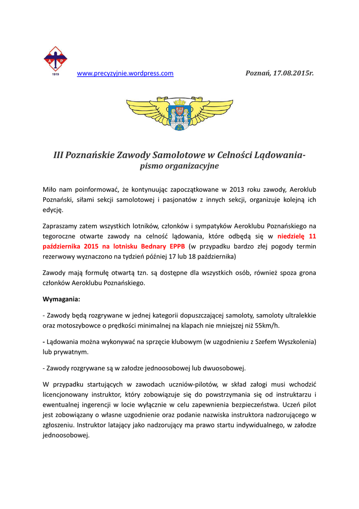 www.precyzyjnie.wordpress.com Poznań, 17.08.2015r. III Poznańskie Zawody Samolotowe w Celności Lądowaniapismo organizacyjne Miło nam poinformować, że kontynuując zapoczątkowane w 2013 roku zawody, Aeroklub Poznański, siłami sekcji samolotowej i pasjonatów z innych sekcji, organizuje kolejną ich edycję. Zapraszamy zatem wszystkich lotników, członków i sympatyków Aeroklubu Poznańskiego na tegoroczne otwarte zawody na celność lądowania, które odbędą się w niedzielę 11 października 2015 na lotnisku Bednary EPPB (w przypadku bardzo złej pogody termin rezerwowy wyznaczono na tydzień później 17 lub 18 października) Zawody mają formułę otwartą tzn. są dostępne dla wszystkich osób, również spoza grona członków Aeroklubu Poznańskiego. Wymagania: - Zawody będą rozgrywane w jednej kategorii dopuszczającej samoloty, samoloty ultralekkie oraz motoszybowce o prędkości minimalnej na klapach nie mniejszej niż 55km/h. - Lądowania można wykonywać na sprzęcie klubowym (w uzgodnieniu z Szefem Wyszkolenia) lub prywatnym. - Zawody rozgrywane są w załodze jednoosobowej lub dwuosobowej. W przypadku startujących w zawodach uczniów-pilotów, w skład załogi musi wchodzić licencjonowany instruktor, który zobowiązuje się do powstrzymania się od instruktarzu i ewentualnej ingerencji w locie wyłącznie w celu zapewnienia bezpieczeństwa. Uczeń pilot jest zobowiązany o własne uzgodnienie oraz podanie nazwiska instruktora nadzorującego w zgłoszeniu. Instruktor latający jako nadzorujący ma prawo startu indywidualnego, w załodze jednoosobowej. Uczestnik zawodów nie może wykonywać lotów jako pasażer w innych lotach niż swoje własne. - W konkurencji na celność lądowania mogą brać udział piloci z ważnymi uprawnieniami do wykonywania lotów (zgłoszenie na zawody będzie równoznaczne z deklaracją pilota o posiadaniu wymaganych prawem uprawnień – licencja, badania lekarskie, KTP, KWT, itp.). - Dowódca samolotu jest odpowiedzialny za posiadanie zgodnych z prawem dokumentów i ubezpieczeń własnych oraz samolotu, dostępnych na pokładzie. Organizator zastrzega sobie prawo weryfikacji dokumentów zawodników. - uczestnicy zobowiązani są do bezwzględnego przestrzegania zaleceń Kierownika Lotów dotyczących lądowania, kołowania, miejsc postojowych w czasie całego czasu trwania imprezy Zasady podstawowe zawodów: Zawody polegają na jak najbardziej precyzyjnym wylądowaniu (przyziemieniu) w wyznaczonym punkcie, „linii zerowej” na pasie startowym. Wyniki lądowań obliczane będą na podstawie punktacji zamieszczonej w szczegółowym regulaminie sportowym zawodów stanowiącym załącznik do pisma organizacyjnego, który startujący zawodnik jest zobowiązany jest do zapoznania się. Przewidywane jest rozegranie czterech różnych prób lądowań: lądowanie normalne, lądowanie znad przeszkody, ze zdławiona mocą silnika , ze zdławiona mocą silnika bez użycia klap. Liczba lądowań z każdego rodzaju zostanie ustalona przez organizatora w zależności od liczby zgłoszonych uczestników i limitów czasowych. Ze względu na łatwiejszą identyfikację lądowań uczestnicy proszeni są o pomalowanie kół (choćby w tymczasowy sposób) – przyziemienie jest wtedy znacznie wyraźniej widoczne – brak pomalowanych kół wyklucza protesty zawodników. Sposób malowań można znaleźć na wielu fotkach z zawodów na www.precyzyjnie.wordpress.com Zgłoszenia przyjmowane będą mailowo na adres: [email protected] Termin zgłoszeń na zawody: do 4 października 2015 W związku z zapewnieniem logistyki imprezy oraz zaplanowaniem lotów prosimy wcześniejsze zgłoszenia. W przypadku bardzo złej pogody zawody odbędą się tydzień później – zgłoszone osoby będą informowane indywidulanie. Przy zgłoszeniu prosimy podać: - typ statku powietrznego - znaki samolotu - nazwisko pilota - numer telefonu komórkowego pilota - rozmiar koszulki Organizator zastrzega sobie prawo ograniczenia liczby uczestników ze względów logistycznych i bezpieczeństwa. Nie czekajcie zatem z decyzją na zgłoszenie ☺ UWAGA: Ze względu na intensywne wykorzystywanie obiektów naziemnych, w tym pasa lądowań, przez czynniki motoryzacyjne właściciela obiektu, trening poza wyznaczoną datą nie jest możliwy. Również w dniu zawodów nieopodal będą się odbywały skoki spadochronowe. Dlatego dopełnienie wymogu wcześniejszego zgłoszenia przylotu jest NIEZBĘDNE ! Ramowy program imprezy: Niedziela 11 października: 8.30-9.00 – doloty na Bednary 9.00 – odprawa na Bednarach 9.30 - ... starty do lądowań zawodniczych wg listy przygotowanej po zakończeniu zbierania zgłoszeń 16:00 – zakończenie zawodów 16:30 – uroczyste ogłoszenie zwycięzców 17:00 - … rozlot zawodników W dniu zawodów organizatorzy zapraszają do „Strefy Kibica”. Poczęstunek i dobra zabawa gwarantowana☺! Jednocześnie informujemy, że program może ulec zmianie. O zmianach będziemy informować mailowo te osoby, które zgłosiły się do udziału w Zawodach. Wszelkie informacje będą na bieżąco umieszczane na: www.aeroklub.poznan.pl oraz www.precyzyjnie.wordpress.com Z lotniczym pozdrowieniem, Organizatorzy III Poznańskich Zawodów Samolotowych w Celności Lądowania