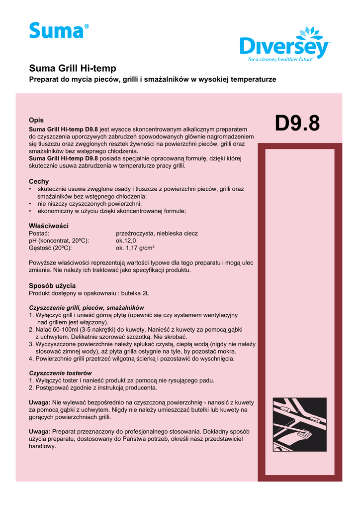 Suma Grill Hi-temp Preparat do mycia pieców, grilli i smażalników w wysokiej temperaturze Opis Suma Grill Hi-temp D9.8 jest wysoce skoncentrowanym alkalicznym preparatem do czyszczenia uporczywych zabrudzeń spowodowanych głównie nagromadzeniem się tłuszczu oraz zwęglonych resztek żywności na powierzchni pieców, grilli oraz smażalników bez wstępnego chłodzenia. Suma Grill Hi-temp D9.8 posiada specjalnie opracowaną formułę, dzięki której skutecznie usuwa zabrudzenia w temperaturze pracy grilli. Cechy • • • skutecznie usuwa zwęglone osady i tłuszcze z powierzchni pieców, grilli oraz smażalników bez wstępnego chłodzenia; nie niszczy czyszczonych powierzchni; ekonomiczny w użyciu dzięki skoncentrowanej formule; Właściwości Postać: pH (koncentrat, 20ºC): Gęstość (20ºC): przeźroczysta, niebieska ciecz ok.12,0 ok. 1,17 g/cm³ Powyższe właściwości reprezentują wartości typowe dla tego preparatu i mogą ulec zmianie. Nie należy ich traktować jako specyfikacji produktu. Sposób użycia Produkt dostępny w opakownaiu : butelka 2L Czyszczenie grilli, pieców, smażalników 1. Wyłączyć grill i unieść górną płytę (upewnić się czy systemem wentylacyjny nad grillem jest włączony). 2. Nalać 60-100ml (3-5 nakrętki) do kuwety. Nanieść z kuwety za pomocą gąbki z uchwytem. Delikatnie szorować szczotką. Nie skrobać. 3. Wyczyszczone powierzchnie należy spłukać czystą, ciepłą wodą (nigdy nie należy stosować zimnej wody), aż płyta grilla ostygnie na tyle, by pozostać mokra. 4. Powierzchnie grilli przetrzeć wilgotną ścierką i pozostawić do wyschnięcia. Czyszczenie tosterów 1. Wyłączyć toster i nanieść produkt za pomocą nie rysującego padu. 2. Postępować zgodnie z instrukcją producenta. Uwaga: Nie wylewać bezpośrednio na czyszczoną powierzchnię - nanosić z kuwety za pomocą gąbki z uchwytem. Nigdy nie należy umieszczać butelki lub kuwety na gorących powierzchniach grilli. Uwaga: Preparat przeznaczony do profesjonalnego stosowania. Dokładny sposób użycia preparatu, dostosowany do Państwa potrzeb, określi nasz przedstawiciel handlowy. D9.8 Suma Grill Hi-temp D9.8 Postępowanie z odpadami Zapobiegać przedostawaniu się nierozcieńczonego produktu do ściekow, wód powierzchniowych i wód gruntowych. Produkt zużyć w całości. Niewielkie ilości niewykorzystanego produktu rozcieńczyć wodą do stężenia najwyżej 1%, odprowadzić do kanalizacji. Większe ilości przekazywać do utylizacji specjalistycznej firmie. Opróżnione opakowania przepłukać dwukrotnie wodą i przeznaczyć do recyklingu. Warunki przechowywania Produkt przechowywać wyłącznie w oryginalnych, szczelnie zamkniętych i właściwie oznakowanych opakowaniach, w suchych i odpowiednio wentylowanych pomieszczeniach. Nie przechowywac poniżej 5ºC i w wysokich temperaturach. Przechowywać z dala od źrodeł ciepła, nie wystawiać na bezpośrednie działanie promieni słonecznych. Okres trwałości 24 miesiące od daty produkcji (na opakowaniu). Środki ostrożności Dodatkowe informacje odnośnie środkow ostrożności wymaganych przy pracy z preparatem Suma Grill Hi-temp D9.8, ubocznych skutków stosowania, zasad udzielania pierwszej pomocy, bezpiecznego postępowania z odpadami produktu i opakowaniem znajdują się w karcie charakterystyki. Diversey Polska Sp. z o.o. ul. Fabryczna 5 00-446 Warszawa Tel.: 22 328 10 00 Fax: 22 328 10 01 www.diversey.com © Copyright 2012 Diversey 2