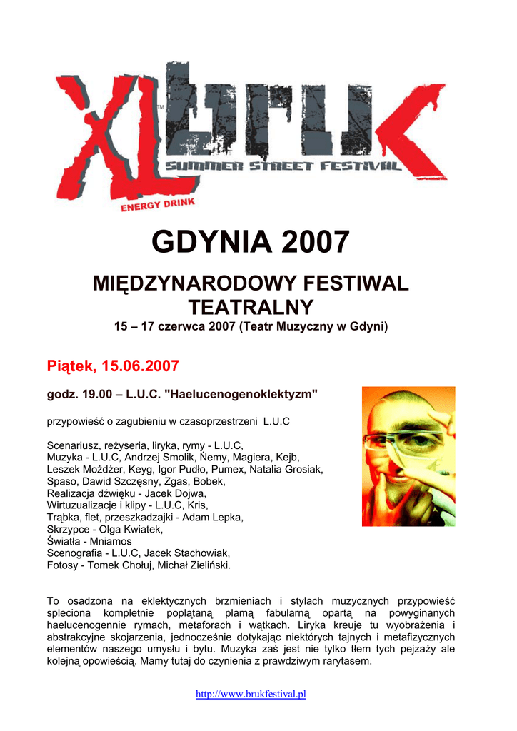 GDYNIA 2007 MIĘDZYNARODOWY FESTIWAL TEATRALNY 15 – 17 czerwca 2007 (Teatr Muzyczny w Gdyni) Piątek, 15.06.2007 godz. 19.00 – L.U.C. "Haelucenogenoklektyzm" przypowieść o zagubieniu w czasoprzestrzeni L.U.C Scenariusz, reżyseria, liryka, rymy - L.U.C, Muzyka - L.U.C, Andrzej Smolik, Ńemy, Magiera, Kejb, Leszek Możdżer, Keyg, Igor Pudło, Pumex, Natalia Grosiak, Spaso, Dawid Szczęsny, Zgas, Bobek, Realizacja dźwięku - Jacek Dojwa, Wirtuzualizacje i klipy - L.U.C, Kris, Trąbka, flet, przeszkadzajki - Adam Lepka, Skrzypce - Olga Kwiatek, Światła - Mniamos Scenografia - L.U.C, Jacek Stachowiak, Fotosy - Tomek Chołuj, Michał Zieliński. To osadzona na eklektycznych brzmieniach i stylach muzycznych przypowieść spleciona kompletnie poplątaną plamą fabularną opartą na powyginanych haelucenogennie rymach, metaforach i wątkach. Liryka kreuje tu wyobrażenia i abstrakcyjne skojarzenia, jednocześnie dotykając niektórych tajnych i metafizycznych elementów naszego umysłu i bytu. Muzyka zaś jest nie tylko tłem tych pejzaży ale kolejną opowieścią. Mamy tutaj do czynienia z prawdziwym rarytasem. http://www.brukfestival.pl L.U.C'owi udało się namówić do współpracy czołówkę rodzimej, nowo brzmieniowej sceny: Igora Pudło ze Skalpela, Rahim'a, Smolika, Natalię Grosiak, czy Leszka Możdżera. Efekt jest piorunujący. Hip-hop co rusz miesza się z jazzem, jazz z szybkim 2stepem, a 2step momentalnie przechodzi w ostre uderzenie niemal z pogranicza rocka, by za chwilę zamknąć dany utwór kojącym dźwiękiem trąbki. Sobota, 16.06.2007 godz. 19.00 – WIECZNA WIOSNA OLD SCHOOL'OWCA CZYLI PO-LOCK-OWAĆ Reżyseria i choreografia - Piotr Bańkowski BANIAK , Współpraca choreograficzna: Kat, Biały Reanimacja muzyczna: d.j. NPoT Historia o tym jak bawiła się młodzież na przestrzeni 40 lat. Gorące noce ulicznych tancerzy lat 70 i 80 , bboying, czyli break dance ,hiphop'u. czy kolorowe eksperymenty naszych czasów, to tylko niektóre propozycje tego zakręconego widowiska. Wyodrębnienie tak różnej muzyki i tańca pozwala na wzajemne przenikanie się form tworząc niezwykłe show. Godz. 20:00 – FREESTYLE PHANATIX - Busta Break Reżyseria: Kim Boytler Choreografia: Elena Franzn, Karsten Mathiesen & Kim Boytler Muzyka: Karsten Mathiesen Bust Da Breakz to ekwilibrystyka w swojej najczystszej formie. Marka Freestyle Phanatix to wysoki poziom techniczny, prezentowany z humorem i w niezwykłym kontakcie z publicznością. Podczas tego show publiczność odbywa podróż od poetyckich chwil pantomimy w zwolnionym tempie do karkołomnych akrobatycznych układów na najwyższych obrotach. Oryginalne choreografie są wymieszane z trudnymi, improwizowanymi układami. Siedmiu profesjonalnych tancerzy przedstawia ładunek energii breakdance … http://www.brukfestival.pl Niedziela, 17.06.2007 godz. 19.00 – Rosa Mei Droomspel R.E.M. Wystąpią: Cie 13 w składzie: Champion Bakomba, Izumi Fujii, Patrick „Liquidz” Martin,oraz polscy tancerze: Arkadiusz Franczak, Radosław Peciak (Tao), Angela Łaboszczak i wokalista Oskar Mienandi Droomspel R.E.M. "We śnie wszystko może się zdarzyć, wszystko jest możliwe i prawdopodobne. Czas i przestrzeń nie istnieją… wyobraźnia wiruje i wyplata nowe wzory; mieszanka wspomnień, doświadczeń, czystych wynalazków, absurdów i improwizacji." - August Strindberg Wyobraź sobie krainę nieustannej, błogiej, torturującej wyobraźni. Najnowsza kreacja taneczna Rosy Mei, analityczne studium ruchu oparte na twórczości Strindberga, jest grą w sen w 88 sekcjach. W tym dziwacznym świecie paradoksalnego snu, tancerze poruszają się jak postaci w sekwencjach animacji poklatkowych. Światła migoczą w przypadkowych przestrzeniach aby odkryć nowe skupisko obrazów - mistrz kwarantanny, brzydka Edyta, balerina, niewidomy poeta, mini bajki - podczas gdy sonaty duchów, toccaty Bacha, zaplątane fugi pobrzmiewają jak echo w tle nowojorskiego artysty Jacoba Robinette. http://www.brukfestival.pl