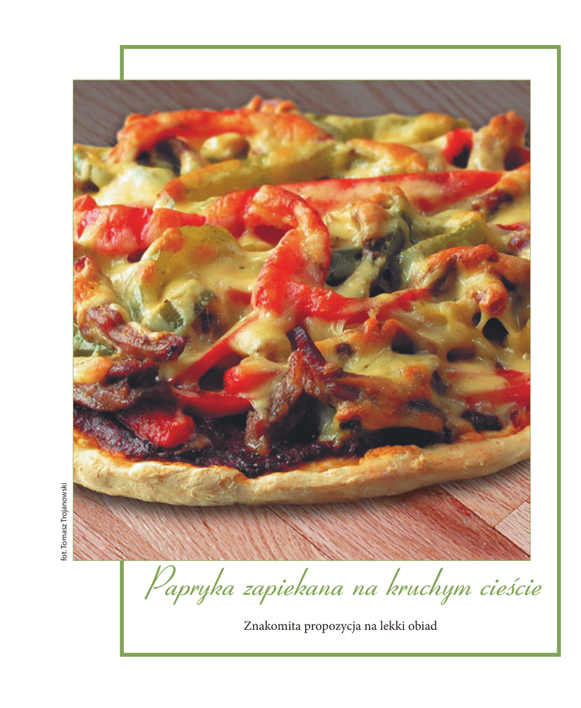 fot. Tomasz Trojanowski Papryka zapiekana na kruchym cieście Znakomita propozycja na lekki obiad Papryka zapiekana na kruchym cieście Czas przygotowania: 1 godzina i 50 minut Składniki dla 6 osób: czerwona papryka (100 g) zielona papryka (100 g) żółta lub biała papryka (100 g) 300 g piersi z kaczki 150 g żółtego sera cebula (50 g) 30 g masła 150 g mąki 80 g masła 3.Ciasto rozwałkować na okrągłą formę o średnicy 24 cm, podnieść brzegi. Następnie na ciasto wyłożyć warzywa i mięso, przyprawić ziołami i posypać żółtym serem. Zapiekać około 20 minut w piekarniku nagrzanym do 180oC. 2 żółtka Gotowej potrawy: 390 g Przyprawy: 2 ząbki czosnku, sól, Rada: pieprz czarny wymieszany z pieprzem cayenne, ½ łyżeczki suszonego tymianku, ½ łyżeczki suszonego Do potrawy można wykorzystać każdy inny rodzaj mięsa lub wędlinę. rozmarynu 1.Z mąki, masła i żółtek zagnieść Zawartość w 100 g potrawy: ciasto. Papryki umyć, oczyścić Białko 11,4 g z gniazd nasiennych i pokroić Tłuszcz 24,2 g Węglowodany 12,4 g B:T:W 1:2,1:1,1 kcal 323,4 w słupki. Cebulę obrać, pokroić w piórka; czosnek zmiażdżyć. 2.Ser zetrzeć na tarce o dużych otworach. Piersi z kaczki pokroić w paski i przysmażyć na oliwie z oliwek. Gdy kaczka lekko optymalnik 30 g oliwy z oliwek się zrumieni, wyciągnąć ją z naczynia. Do pozostałego tłuszczu dołożyć masło i wrzucić pokrojone papryki i cebulę; dusić do miękkości.