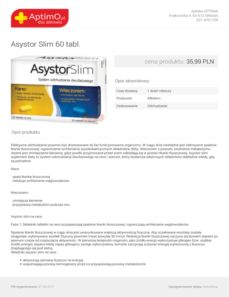 Apteka OPTIMA Krakowska 4, 63-510 Mikstat 531-470-109 Asystor Slim 60 tabl. cena produktu: 35,99 PLN Opis słownikowy Czas dostawy 1 dzień roboczy Producent Aflofarm Zastosowanie Odchudzanie Opis produktu Efektywne odchudzanie powinno być dostosowane do faz funkcjonowania organizmu. W ciągu dnia niezbędne jest intensywne spalanie tkanki tłuszczowej i ograniczenie wchłaniania wysokokalorycznych składników diety. Wieczorem z powodu zwolnienia metabolizmu istotne jest zmniejszenie łaknienia, gdyż posiłki przyjmowane przed snem odkładają się w postaci tkanki tłuszczowej. Asystor slim suplement diety to system odchudzania dwufazowego na rano i wieczór, który dostarcza właściwych składników dokładnie wtedy, gdy są potrzebne. Rano: spala tkankę tłuszczową redukuje wchłanianie węglowodanów Wieczorem: zmniejsza łaknienie przyspiesza metabolizm podczas snu Asystor slim na rano Faza 1: Składniki tabletki na rano przyspieszają spalanie tkanki tłuszczowej i ograniczają wchłanianie węglowodanów. Spalanie tkanki tłuszczowej w ciągu dnia jest uwarunkowane większą aktywnością fizyczną. Aby oczekiwane rezultaty zostały osiągnięte, wykonywany wysiłek fizyczny powinien trwać powyżej 30 minut. Redukcja tkanki tłuszczowej zaczyna się bowiem dopiero po pewnym czasie od rozpoczęcia aktywności. W pierwszej kolejności organizm, jako źródło energii wykorzystuje glikogen (tzw. szybkie źródło energii), dopiero kiedy zapas glikogenu zastaje wykorzystany, komórki zaczynają zużywać energię wytworzoną z tłuszczu znajdującego się pod skórą. Składniki asystor slim na rano : aktywizują zamianę tłuszczu na energię wspomagają procesy termogenezy przez co przyspieszają procesy metaboliczne Plik wygenerowano: 07-03-2017 Oprogramowanie sklepu: AptusShop Apteka OPTIMA Krakowska 4, 63-510 Mikstat 531-470-109 wzmagają procesy utleniania tłuszczu, przez co zwiększają ilość spalanych kalorii Głównymi sprawcami otyłości są węglowodany, a nie, jakby się mogło wydawać, tłuszcze. To właśnie makaron, pieczywo, ziemniaki, pierogi obciążają codzienną dietę i stają się pierwszym materiałem zamieniamy na tkankę tłuszczową. Podczas odchudzania należy więc ograniczyć ich podaż - szczególnie podaż węglowodanów prostych. Składniki asystor slim na rano: biorą udział w metabolizmie węglowodanów i tłuszczy hamują trawienie skrobi znajdującej się w produktach spożywczych zmniejszają wchłanianie cukrów Asystor slim suplement diety na rano pomaga szybciej spalić tkankę tłuszczową i wstrzymuje absorpcję węglowodanów. Tabletka rano SKŁAD: 1 tabletka Wyciąg z białej fasoli 200 mg L-karnityna 200 mg Wyciąg z zielonej herbaty 100 mg Ocet jabłkowy 100 mg Kofeina 50 mg Asystor slim na wieczór Faza 2: Składniki tabletki na wieczór ograniczają apetyt i zwiększają metabolizm w nocy. Wieczór i noc to czas odpoczynku także wewnętrznych systemów funkcjonowania. Podczas snu regeneruje się większość organów, spada ciepłota ciała, a także wolniej przebiega metabolizm. Posiłki spożywane wieczorem szybciej odkładają się w postaci tkanki tłuszczowej, gdyż organizm w nocy mniej efektywnie zamienia je na energię. Problem także nasila wieczorne podjadanie, związane głównie z rozkładem codziennej aktywności. Przyczyny wieczornego podjadania: rozkład dnia W ciągu dnia jesteśmy zaangażowani w różne czynności – pracę, szkołę, dom – i czas upływa szybko. Dlatego też znacznie łatwiej powstrzymać się od jedzenia rano i po południu niż wieczorem gdzie czas płynie znacznie wolniej. napięcia i stresy W ciągu dnia podwyższony poziom adrenaliny pozwala nam ograniczyć spożywanie posiłków, natomiast wieczorem, gdy emocje opadają, organizm zwiększa łaknienie i w ten sposób dopomina się uzupełnienie niezbędnych do funkcjonowania składników. nuda Wieczorem angażujemy się w znacznie mniej aktywności, co powoduje , że chętniej sięgamy do lodówki. -wieczorni goście Przyczyna może leżeć także w częstym goszczeniu znajomych i przyjaciół. Trudno przecież zaprosić gości i nie zastawić stołu. nawyki żywieniowe Przyczyną podjadanie może być także powszechnie znany model – telewizja plus chipsy/popcorn. Połączenie braku ruchu i pustych kalorii powoduje, że bardzo szybko przybieramy na wadze. Składniki Asystor slim na wieczór: Plik wygenerowano: 07-03-2017 Oprogramowanie sklepu: AptusShop Apteka OPTIMA Krakowska 4, 63-510 Mikstat 531-470-109 przyspieszają procesy metaboliczne podczas snu redukują wieczorny apetyt Tabletka wieczór SKŁAD: 1 tabletka Wyciąg z liści ostrokrzewu paragwajskiego (Mate) 200 mg Spirulina 200 mg Wyciąg z gorzkiej pomarańczy (6% p-synefryny) 100 mg Wyciąg z ostryżu długiego 50 mg Chrom 40 µg (100%)* Skład: Składniki suplementu diety Asystor slim: Fasolamina znajdująca się w wyciągu z białej fasoli, hamuje trawienie skrobi znajdującej się w produktach spożywczych (ziemniaki, pieczywo, makaron, pierogi). L-karnityna odgrywa ważną rolę w przemianie materii, uczestniczy w zamianie tłuszczu w energię. Wyciąg z gorzkiej pomarańczy zmniejsza apetyt, przyspiesza przemianę materii. Dodatkowo zawarta w wyciągu synefryna nasila proces lipolizy (rozpadu) tłuszczów. Ocet jabłkowy reguluje trawienie, pobudza procesy metaboliczne oraz zmniejsza wchłanianie cukrów. Kofeina wspomaga proces termogenezy, przez co przyspiesza procesy metaboliczne. Wzmaga procesy utleniania tłuszczu, przez co zwiększa ilość spalanych kalorii. Witamina B6 jest niezbędna w przemianach aminokwasów, bierze udział w metabolizmie węglowodanów i lipidów. Mate pochodząca z liści ostrokrzewu paragwajskiego (Ilex paraguariensis) ma dobroczynny wpływ na przemianę materii. Przyczynia się do rozkładu lipidów i pomaga w utrzymaniu prawidłowej masy ciała. Spirulina dostarcza łatwo przyswajalnych składników mineralnych i witamin oraz ch