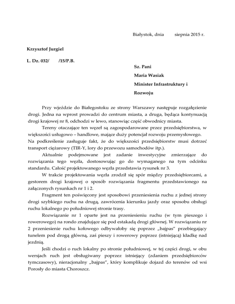 Białystok, dnia siepnia 2015 r. Krzysztof Jurgiel L. Dz. 032/ /15/P.B. Sz. Pani Maria Wasiak Minister Infrastruktury i Rozwoju Przy wjeździe do Białegostoku ze strony Warszawy następuje rozgałęzienie drogi. Jedna na wprost prowadzi do centrum miasta, a druga, będąca kontynuacją drogi krajowej nr 8, odchodzi w lewo, stanowiąc część obwodnicy miasta. Tereny otaczające ten węzeł są zagospodarowane przez przedsiębiorstwa, w większości usługowo – handlowe, mające duży potencjał rozwoju przemysłowego. Na podkreślenie zasługuje fakt, że do większości przedsiębiorstw musi dotrzeć transport ciężarowy (TIR-Y, lory do przewozu samochodów itp.). Aktualnie podejmowane jest zadanie inwestycyjne zmierzające do rozwiązania tego węzła, dostosowując go do wymaganego na tym odcinku standardu. Całość projektowanego węzła przedstawia rysunek nr 3. W trakcie projektowania węzła zrodził się spór między przedsiębiorcami, a gestorem drogi krajowej o sposób rozwiązania fragmentu przedstawionego na załączonych rysunkach nr 1 i 2. Fragment ten poświęcony jest sposobowi przeniesienia ruchu z jednej strony drogi szybkiego ruchu na drugą, zawrócenia kierunku jazdy oraz sposobu obsługi ruchu lokalnego po południowej stronie trasy. Rozwiązanie nr 1 oparte jest na przeniesieniu ruchu (w tym pieszego i rowerowego) na rondo znajdujące się pod estakadą drogi głównej. W rozwiązaniu nr 2 przeniesienie ruchu kołowego odbywałoby się poprzez „bajpas” przebiegający tunelem pod drogą główną, zaś pieszy i rowerowy poprzez (istniejącą) kładkę nad jezdnią. Jeśli chodzi o ruch lokalny po stronie południowej, w tej części drogi, w obu wersjach ruch jest obsługiwany poprzez istniejący (zdaniem przedsiębiorców tymczasowy), nieracjonalny „bajpas”, który komplikuje dojazd do terenów od wsi Porosły do miasta Choroszcz. Przedsiębiorcy i mieszkańcy uważają, że rozwiązanie nr 2 z budową tunelu będzie tak niefunkcjonalne, że będzie mogło służyć za wzór zagmatwania komunikacyjnego i absurdu w połączeniu z istniejącą kładką. Przedsiębiorcy optują za rozwiązaniem nr 1 z uzupełnieniem drogi serwisowej, po południowej stronie, bezpośrednio przy jezdni głównej na całym odcinku (z pominięciem istniejącego „bajpasa”), uzasadniając to następująco: - rozwiązanie to w istotnym stopniu jest bardziej intuicyjne dla przyszłych użytkowników dróg lokalnych, a szczególnie ich klientów i obsługi transportu, - daje możliwość włączenia się do drogi szybkiego ruchu dla wyjeżdżających z miasta w obrębie spornego fragmentu węzła, a w przypadku rozwiązania według rysunku nr 2 dopiero po przejechaniu ok. 16 km drogą lokalną lub po cofnięciu się do miasta, - daje możliwość racjonalnego rozwiązania ruchu lokalnego, po stronie południowej, w tym lub przyszłym zadaniu inwestycyjnym, - zmniejszy, w istotnym stopniu, uciążliwość ruchu pieszego i rowerowego, - podniesie bezpieczeństwo ruchu poprzez uproszczenie rozwiązań co daje możliwość intuicyjnego poruszania się po węźle, - w istotny sposób obniży koszty transportu, co dotyka przedsiębiorców i to nie jednorazowo a przez dziesiątki lat eksploatacji węzła. Gestor drogi krajowej optuje za rozwiązaniem z rysunku nr 2, argumentując kosztami inwestycyjnymi wykonania estakady. Zaproszono mnie na spotkanie w którym uczestniczył również Burmistrz Choroszczy. Po wysłuchaniu argumentów obu stron oraz po przeanalizowaniu obu rozwiązań, przyznaje rację przedsiębiorcom szczególnie, że: - nie ma wyjazdu w kierunku Warszawy i źle komunikuje tereny po obu stronach drogi S-8 (utrudnia dojazdy i wyjazdy przez dużą ilość skrzyżowań i zakrętów), - gestor drogi krajowej przedstawiając koszty estakady nie pomniejsza ich o koszt wykonania „bajpasa” i tunelu, w którym ma przebiegać, - nie uwzględnia zwiększonych kosztów eksploatacji węzła, w preferowanym rozwiązaniu, przez jego użytkowników i to przez długie lata jego eksploatacji, - nie uwzględnia obniżenia walorów inwestycyjnych otaczających terenów oraz wstrzymuje ich rozwój, a w tym wpływów do Skarbu Państwa jak i budżetu gminy oraz strat przedsiębiorców wynikających z utrudnionego dojazdu (większość firm zlokalizowanych w tym rejonie to firmy o profilu handlowo-usługowym). Innymi słowy, odniosłem wrażenie, że przedstawiony w dyskusji przez gestora rachunek ekonomiczny jest nie- pełny i mało wiarygodny. Uwzględnia jedynie fragmentaryczne koszty inwestora. W moim przekonaniu powinien uwzględniać również wszelkie koszty społeczne i dobrze komunikować firmy. W tej sytuacji proszę o wsparcie stanowiska przedsiębiorców do którego dołączam się z pełnym przekonaniem. Mając na uwadze powyższe, działając na podstawie art. 20 ustawy o wykonywaniu mandatu posła i senatora zwracam się do Pani Mister z prośbą o analizę przytoczonej sprawy, oraz przyjęcie rozwiązań popieranych przez gm. Choroszcz, mieszkańców i lokalnych przedsiębiorców. Krzysztof Jurgiel Poseł na Sejm RP Załączniki: 1. rysunek nr 1; 2. rysunek nr 2; 3. rysunek nr 3; Do wiadomości 1. Pan Robert Wardziński - Burmistrz Choroszczy 2. Pan Stanisław Topczewski Adres Biura Poselskiego Krzysztofa Jurgiela: ul. Zwycięstwa 26C, 15-703 Białystok, tel./fax. 85 742 30 37 www.jurgiel.pl, e-mail: [email protected]
