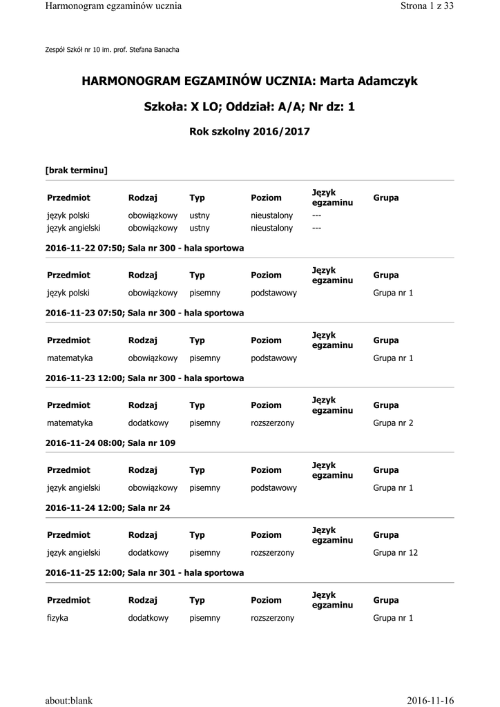 Harmonogram egzaminów ucznia Strona 1 z 33 Zespół Szkół nr 10 im. prof. Stefana Banacha HARMONOGRAM EGZAMINÓW UCZNIA: Marta Adamczyk Szkoła: X LO; Oddział: A/A; Nr dz: 1 Rok szkolny 2016/2017 [brak terminu] Przedmiot Rodzaj Typ Poziom Język egzaminu język polski obowiązkowy ustny nieustalony --- język angielski obowiązkowy ustny nieustalony --- Język egzaminu Grupa 2016-11-22 07:50; Sala nr 300 - hala sportowa Przedmiot Rodzaj Typ Poziom język polski obowiązkowy pisemny podstawowy Grupa Grupa nr 1 2016-11-23 07:50; Sala nr 300 - hala sportowa Przedmiot Rodzaj Typ Poziom matematyka obowiązkowy pisemny podstawowy Język egzaminu Grupa Grupa nr 1 2016-11-23 12:00; Sala nr 300 - hala sportowa Przedmiot Rodzaj Typ Poziom matematyka dodatkowy pisemny rozszerzony Język egzaminu Grupa Grupa nr 2 2016-11-24 08:00; Sala nr 109 Przedmiot Rodzaj Typ Poziom język angielski obowiązkowy pisemny podstawowy Język egzaminu Grupa Grupa nr 1 2016-11-24 12:00; Sala nr 24 Przedmiot Rodzaj Typ Poziom język angielski dodatkowy pisemny rozszerzony Język egzaminu Grupa Grupa nr 12 2016-11-25 12:00; Sala nr 301 - hala sportowa Przedmiot Rodzaj Typ Poziom fizyka dodatkowy pisemny rozszerzony about:blank Język egzaminu Grupa Grupa nr 1 2016-11-16 Harmonogram egzaminów ucznia Strona 2 z 33 Zespół Szkół nr 10 im. prof. Stefana Banacha HARMONOGRAM EGZAMINÓW UCZNIA: Maria Błaszkiewicz Szkoła: X LO; Oddział: A/A; Nr dz: 2 Rok szkolny 2016/2017 [brak terminu] Przedmiot Rodzaj Typ Poziom Język egzaminu język angielski obowiązkowy ustny nieustalony --- język polski obowiązkowy ustny nieustalony --- Język egzaminu Grupa 2016-11-22 07:50; Sala nr 300 - hala sportowa Przedmiot Rodzaj Typ Poziom język polski obowiązkowy pisemny podstawowy Grupa Grupa nr 1 2016-11-23 07:50; Sala nr 300 - hala sportowa Przedmiot Rodzaj Typ Poziom matematyka obowiązkowy pisemny podstawowy Język egzaminu Grupa Grupa nr 1 2016-11-23 12:00; Sala nr 300 - hala sportowa Przedmiot Rodzaj Typ Poziom matematyka dodatkowy pisemny rozszerzony Język egzaminu Grupa Grupa nr 2 2016-11-24 08:00; Sala nr 109 Przedmiot Rodzaj Typ Poziom język angielski obowiązkowy pisemny podstawowy Język egzaminu Grupa Grupa nr 1 2016-11-24 12:00; Sala nr 24 Przedmiot Rodzaj Typ Poziom język angielski dodatkowy pisemny rozszerzony Język egzaminu Grupa Grupa nr 12 2016-11-25 12:00; Sala nr 301 - hala sportowa Przedmiot Rodzaj Typ Poziom fizyka dodatkowy pisemny rozszerzony about:blank Język egzaminu Grupa Grupa nr 1 2016-11-16 Harmonogram egzaminów ucznia Strona 3 z 33 Zespół Szkół nr 10 im. prof. Stefana Banacha HARMONOGRAM EGZAMINÓW UCZNIA: Maciej Chrzanowski Szkoła: X LO; Oddział: A/A; Nr dz: 3 Rok szkolny 2016/2017 [brak terminu] Przedmiot Rodzaj Typ Poziom Język egzaminu język polski obowiązkowy ustny nieustalony --- język angielski obowiązkowy ustny nieustalony --- Język egzaminu Grupa 2016-11-22 07:50; Sala nr 300 - hala sportowa Przedmiot Rodzaj Typ Poziom język polski obowiązkowy pisemny podstawowy Grupa Grupa nr 1 2016-11-23 07:50; Sala nr 300 - hala sportowa Przedmiot Rodzaj Typ Poziom matematyka obowiązkowy pisemny podstawowy Język egzaminu Grupa Grupa nr 1 2016-11-23 12:00; Sala nr 300 - hala sportowa Przedmiot Rodzaj Typ Poziom matematyka dodatkowy pisemny rozszerzony Język egzaminu Grupa Grupa nr 2 2016-11-24 08:00; Sala nr 110 Przedmiot Rodzaj Typ Poziom język angielski obowiązkowy pisemny podstawowy Język egzaminu Grupa Grupa nr 2 2016-11-24 12:00; Sala nr 24 Przedmiot Rodzaj Typ Poziom język angielski dodatkowy pisemny rozszerzony Język egzaminu Grupa Grupa nr 12 2016-11-25 12:00; Sala nr 301 - hala sportowa Przedmiot Rodzaj Typ Poziom fizyka dodatkowy pisemny rozszerzony about:blank Język egzaminu Grupa Grupa nr 1 2016-11-16 Harmonogram egzaminów ucznia Strona 4 z 33 Zespół Szkół nr 10 im. prof. Stefana Banacha HARMONOGRAM EGZAMINÓW UCZNIA: Paula Cieślak Szkoła: X LO; Oddział: A/A; Nr dz: 4 Rok szkolny 2016/2017 [brak terminu] Przedmiot Rodzaj Typ Poziom Język egzaminu język angielski obowiązkowy ustny nieustalony --- język polski obowiązkowy ustny nieustalony --- Język egzaminu Grupa 2016-11-22 07:50; Sala nr 300 - hala sportowa Przedmiot Rodzaj Typ Poziom język polski obowiązkowy pisemny podstawowy Grupa Grupa nr 1 2016-11-23 07:50; Sala nr 300 - hala sportowa Przedmiot Rodzaj Typ Poziom matematyka obowiązkowy pisemny podstawowy Język egzaminu Grupa Grupa nr 1 2016-11-23 12:00; Sala nr 300 - hala sportowa Przedmiot Rodzaj Typ Poziom matematyka dodatkowy pisemny rozszerzony Język egzaminu Grupa Grupa nr 2 2016-11-24 08:00; Sala nr 110 Przedmiot Rodzaj Typ Poziom język angielski obowiązkowy pisemny podstawowy Język egzaminu Grupa Grupa nr 2 2016-11-24 12:00; Sala nr 27 Przedmiot Rodzaj Typ Poziom język angielski dodatkowy pisemny rozszerzony Język egzaminu Grupa Grupa nr 13 2016-11-25 12:00; Sala nr 301 - hala sportowa Przedmiot Rodzaj Typ Poziom fizyka dodatkowy pisemny rozszerzony about:blank Język egzaminu Grupa Grupa nr 1 2016-11-16 Harmonogram egzaminów ucznia Strona 5 z 33 Zespół Szkół nr 10 im. prof. Stefana Banacha HARMONOGRAM EGZAMINÓW UCZNIA: Miłosz Gaj Szkoła: X LO; Oddział: A/A; Nr dz: 5 Rok szkolny 2016/2017 [brak terminu] Przedmiot Rodzaj Typ Poziom Język egzaminu informatyka dodatkowy pisemny rozszerzony język polski obowiązkowy ustny nieustalony --- język angielski obowiązkowy ustny nieustalony --- Język egzaminu Grupa Grupa nr 1 2016-11-22 07:50; Sala nr 300 - hala sportowa Przedmiot Rodzaj Typ Poziom język polski obowiązkowy pisemny podstawowy Grupa Grupa nr 1 2016-11-23 07:50; Sala nr 300 - hala sportowa Przedmiot Rodzaj Typ Poziom matematyka obowiązkowy pisemny podstawowy Język egzaminu Grupa Grupa nr 1 2016-11-24 08:00; Sala nr 111 Przedmiot Rodzaj Typ Poziom język angielski obowiązkowy pisemny podstawowy about:blank Język egzaminu Grupa Grupa nr 3 2016-11-16 Harmonogram egzaminów ucznia Strona 6 z 33 Zespół Szkół 