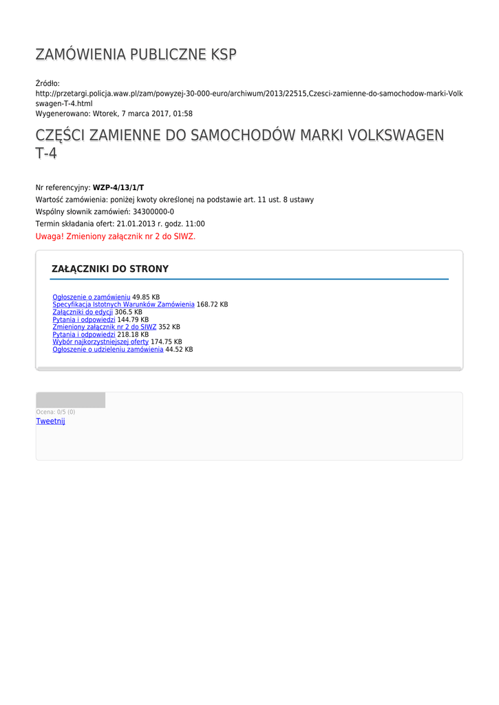 ZAMÓWIENIA PUBLICZNE KSP Źródło: http://przetargi.policja.waw.pl/zam/powyzej-30-000-euro/archiwum/2013/22515,Czesci-zamienne-do-samochodow-marki-Volk swagen-T-4.html Wygenerowano: Wtorek, 7 marca 2017, 01:58 CZĘŚCI ZAMIENNE DO SAMOCHODÓW MARKI VOLKSWAGEN T-4 Nr referencyjny: WZP-4/13/1/T Wartość zamówienia: poniżej kwoty określonej na podstawie art. 11 ust. 8 ustawy Wspólny słownik zamówień: 34300000-0 Termin składania ofert: 21.01.2013 r. godz. 11:00 Uwaga! Zmieniony załącznik nr 2 do SIWZ. ZAŁĄCZNIKI DO STRONY Ogłoszenie o zamówieniu 49.85 KB Specyfikacja Istotnych Warunków Zamówienia 168.72 KB Załączniki do edycji 306.5 KB Pytania i odpowiedzi 144.79 KB Zmieniony załącznik nr 2 do SIWZ 352 KB Pytania i odpowiedzi 218.18 KB Wybór najkorzystniejszej oferty 174.75 KB Ogłoszenie o udzieleniu zamówienia 44.52 KB Ocena: 0/5 (0) Tweetnij