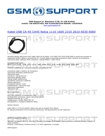 GSM-Support ul. Bitschana 2/38, 31-420 Kraków mobile +48 608107455, NIP PL9451852164 REGON: 120203925 www.gsmsupport.pl Kabel USB CA-45 CA45 Nokia 1110 1600 2310 2610 6030 6060 Wysokiej jakości fabrycznie nowy kabel CA45 CA-45 Nokia 1110 1600 2310 2610 6030 6060 w wersji box pozwala na połączenie telefonu Nokia z komputerem PC. Funkcje kabla umożliwiają przesyłanie zdjęć z telefonu do komputera, wgrywanie tapet, aplikacji JAVA, wysyłanie / edycję SMSów i wiele innych. Kompatybilność kabla: Nokia 1110, 1110b, 1110i, 1112, 1112b, 1600, 1600b, 2310, 2610, 2610b, 2626, 6030, 6060, 6061 Przewód współpracuje z oprogramowaniem pozwalającym na: przesyłanie zdjęć z telefonu do komputera wgrywanie dzwonków polifonicznych wgrywanie tapet wysyłanie i edycję sms-ów wgrywanie aplikacji JAVA edycję książki telefonicznej odczytanie informacji o telefonie edycję organizera przesyłanie faksów i maili projektowanie i wgrywanie logo wgrywanie wygaszaczy wgrywanie gier Dane techniczne: port USB (zgodność ze standardem USB 1.1 i 2.0) profesjonalne wykonanie, złącza najwyższej jakości długość przewodu ok. 1,3 m. współpracuje z win98/ 2000/ ME/ XP kompatybilny z modelami telefonów Nokia Zestaw zawiera: kabel USB (1.1/2.0) do telefonu Nokia (nie jest to produkt firmy Nokia) Po zakupie przesyłamy link do pobrania sterownika. Oprogramowanie nie jest załączone ©2012 www.gsmsupport.pl Opis ten nie stanowi oferty w rozumieniu Kodeksu Cywilnego. GSM-Support zastrzega sobie prawo do możliwych błędów w opisie produktu. Prosimy o weryfikację z Państwa strony, a w razie wątpliwości o kontakt. GSM-Support ul. Bitschana 2/38 31-420 Kraków POLSKA tel. 608107455 e-mail: [email protected] Powered by TCPDF (www.tcpdf.org)