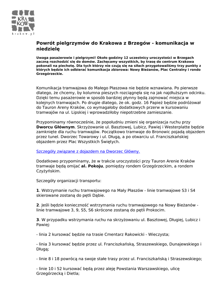 Powrót pielgrzymów do Krakowa z Brzegów - komunikacja w niedzielę Uwaga pasażerowie i pielgrzymi! Około godziny 12 uczestnicy uroczystości w Brzegach zaczną rozchodzić się do domów. Zachęcamy wszystkich, by trasę do centrum Krakowa pokonali na piechotę. Dla tych którzy nie czują się na siłach przygotowaliśmy trzy punkty z których będzie ich odbierać komunikacja zbiorowa: Nowy Bieżanów, Plac Centralny i rondo Grzegórzeckie. Komunikacja tramwajowa do Małego Płaszowa nie będzie wznawiana. Po pierwsze dlatego, że chcemy, by kolumna pieszych rozciągnęła się na jak najdłuższym odcinku. Dzięki temu pasażerowie w sposób bardziej płynny będą zajmować miejsca w kolejnych tramwajach. Po drugie dlatego, że ok. godz. 16 Papież będzie podróżował do Tauron Areny Kraków, co wymagałoby dodatkowych przerw w kursowaniu tramwajów na ul. Lipskiej i wprowadziłoby niepotrzebne zamieszanie. Przypominamy równocześnie, że popołudniu zmieni się organizacja ruchu przy Dworcu Głównym. Skrzyżowanie ul. Basztowej, Lubicz, Pawiej i Westerplatte będzie zamknięte dla ruchu tramwajów. Początkowo tramwaje do Bronowic pojadą objazdem przez tunel. Dworzec Towarowy i ul. Długą, a po otwarciu ul. Franciszkańskiej objazdem przez Plac Wszystkich Świętych. Szczegóły związane z dojazdem na Dworzec Główny. Dodatkowo przypominamy, że w trakcie uroczystości przy Tauron Arenie Kraków tramwaje będą omijać al. Pokoju, pomiędzy rondem Grzegórzeckim, a rondem Czyżyńskim. Szczegóły organizacji transportu: 1. Wstrzymanie ruchu tramwajowego na Mały Płaszów - linie tramwajowe S3 i S4 skierowane zostaną do pętli Dąbie. 2. Jeśli będzie konieczność wstrzymania ruchu tramwajowego na Nowy Bieżanów linie tramwajowe 3, 9, S5, S6 skrócone zostaną do pętli Prokocim. 3. W przypadku wstrzymania ruchu na skrzyżowaniu ul. Basztowej, Długiej, Lubicz i Pawiej: - linia 2 kursować będzie na trasie Cmentarz Rakowicki - Wieczysta; - linia 3 kursować będzie przez ul. Franciszkańską, Straszewskiego, Dunajewskiego i Długą; - linie 8 i 18 powrócą na swoje stałe trasy przez ul. Franciszkańską i Straszewskiego; - linie 10 i 52 kursować będą przez aleję Powstania Warszawskiego, ulicę Grzegórzecką i Dietla; - linie 14 i S4 kursować będą przez tunel tramwajowy i ulicę Długą; - linia S7 kursować będzie przez aleję Powstania Warszawskiego, ulicę Grzegórzecką, Starowiślną, Franciszkańską i Straszewskiego. 4. W przypadku wstrzymania ruchu w ciągu al. Pokoju: - linie 1, 14 i 22 kursować będą przez al. Jana Pawła II; - uruchomiona zostanie zastępcza linia autobusowa 714 kursująca po następującej trasie: Fabryczna - al. Pokoju, al. Powstania Warszawskiego - Rondo Mogilskie; - linia S3 zostanie skierowana z Dąbia do pętli Wieczysta; - linia S4 zostanie skierowana z Dąbia do Placu Centralnego im. R. Reagana. 5. W przypadku wstrzymania ruchu w ciągu ul. Ptaszyckiego: - linie tramwajowe 10 i 16 skierowane zostaną przez al. Solidarności do Kopca Wandy; - linie S7 i S15 kursować będą przez al. Solidarności; - uruchomiona zostanie zastępcza linia autobusowa Za Tramwaj kursująca po następującej trasie: Pleszów - Igołomska - Bardosa - Ujastek Mogilski - Kombinat. Przepraszamy za utrudnienia i apelujemy o dokładne śledzenie komunikatów! Powered by TCPDF (www.tcpdf.org)