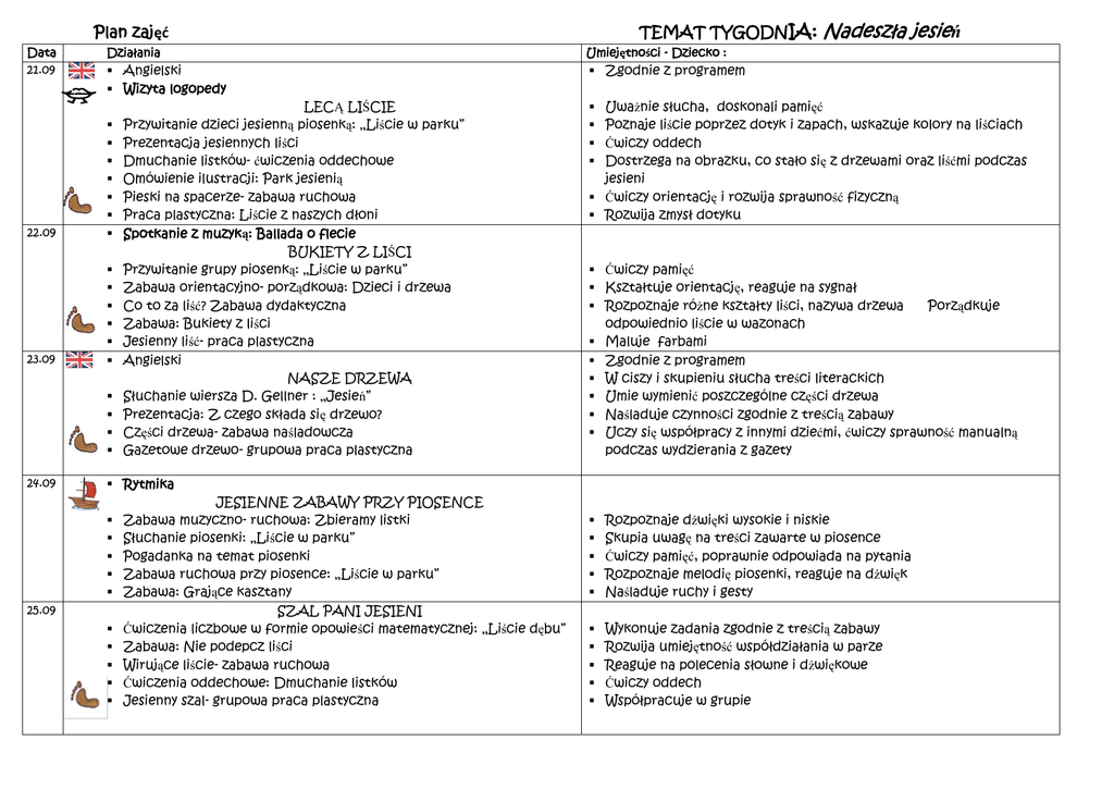 TEMAT TYGODNIA: Plan zajęć Data 21.09 Działania Umiejętności - Dziecko : Angielski Wizyta logopedy Zgodnie z programem 22.09 23.09 24.09 LECĄ LIŚCIE Przywitanie dzieci jesienną piosenką: „Liście w parku” Prezentacja jesiennych liści Dmuchanie listków- ćwiczenia oddechowe Omówienie ilustracji: Park jesienią Pieski na spacerze- zabawa ruchowa Praca plastyczna: Liście z naszych dłoni Spotkanie z muzyką: Ballada o flecie BUKIETY Z LIŚCI Przywitanie grupy piosenką: „Liście w parku” Zabawa orientacyjno- porządkowa: Dzieci i drzewa Co to za liść? Zabawa dydaktyczna Zabawa: Bukiety z liści Jesienny liść- praca plastyczna Angielski NASZE DRZEWA Słuchanie wiersza D. Gellner : „Jesień” Prezentacja: Z czego składa się drzewo? Części drzewa- zabawa naśladowcza Gazetowe drzewo- grupowa praca plastyczna Nadeszła jesień Uważnie słucha, doskonali pamięć Poznaje liście poprzez dotyk i zapach, wskazuje kolory na liściach Ćwiczy oddech Dostrzega na obrazku, co stało się z drzewami oraz liśćmi podczas jesieni Ćwiczy orientację i rozwija sprawność fizyczną Rozwija zmysł dotyku Ćwiczy pamięć Kształtuje orientację, reaguje na sygnał Rozpoznaje różne kształty liści, nazywa drzewa Porządkuje odpowiednio liście w wazonach Maluje farbami Zgodnie z programem W ciszy i skupieniu słucha treści literackich Umie wymienić poszczególne części drzewa Naśladuje czynności zgodnie z treścią zabawy Uczy się współpracy z innymi dziećmi, ćwiczy sprawność manualną podczas wydzierania z gazety Rytmika 25.09 JESIENNE ZABAWY PRZY PIOSENCE Zabawa muzyczno- ruchowa: Zbieramy listki Słuchanie piosenki: „Liście w parku” Pogadanka na temat piosenki Zabawa ruchowa przy piosence: „Liście w parku” Zabawa: Grające kasztany SZAL PANI JESIENI Ćwiczenia liczbowe w formie opowieści matematycznej: „Liście dębu” Zabawa: Nie podepcz liści Wirujące liście- zabawa ruchowa Ćwiczenia oddechowe: Dmuchanie listków Jesienny szal- grupowa praca plastyczna Rozpoznaje dźwięki wysokie i niskie Skupia uwagę na treści zawarte w piosence Ćwiczy pamięć, poprawnie odpowiada na pytania Rozpoznaje melodię piosenki, reaguje na dźwięk Naśladuje ruchy i gesty Wykonuje zadania zgodnie z treścią zabawy Rozwija umiejętność współdziałania w parze Reaguje na polecenia słowne i dźwiękowe Ćwiczy oddech Współpracuje w grupie