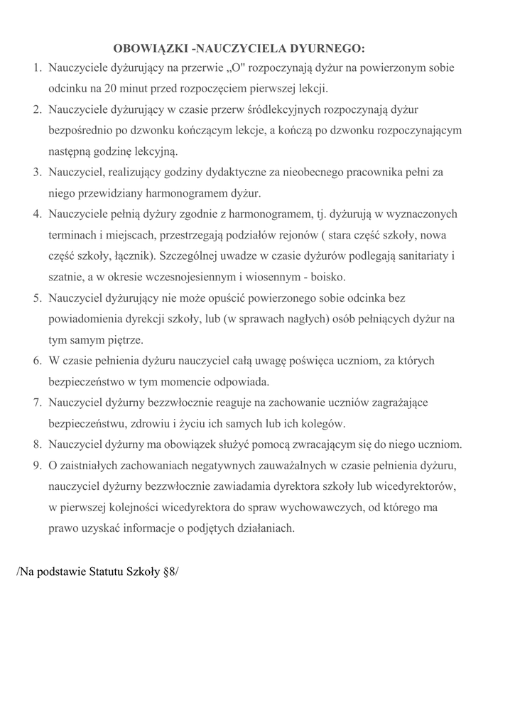 OBOWIĄZKI -NAUCZYCIELA DYURNEGO: 1. Nauczyciele dyżurujący na przerwie „O" rozpoczynają dyżur na powierzonym sobie odcinku na 20 minut przed rozpoczęciem pierwszej lekcji. 2. Nauczyciele dyżurujący w czasie przerw śródlekcyjnych rozpoczynają dyżur bezpośrednio po dzwonku kończącym lekcje, a kończą po dzwonku rozpoczynającym następną godzinę lekcyjną. 3. Nauczyciel, realizujący godziny dydaktyczne za nieobecnego pracownika pełni za niego przewidziany harmonogramem dyżur. 4. Nauczyciele pełnią dyżury zgodnie z harmonogramem, tj. dyżurują w wyznaczonych terminach i miejscach, przestrzegają podziałów rejonów ( stara część szkoły, nowa część szkoły, łącznik). Szczególnej uwadze w czasie dyżurów podlegają sanitariaty i szatnie, a w okresie wczesnojesiennym i wiosennym - boisko. 5. Nauczyciel dyżurujący nie może opuścić powierzonego sobie odcinka bez powiadomienia dyrekcji szkoły, lub (w sprawach nagłych) osób pełniących dyżur na tym samym piętrze. 6. W czasie pełnienia dyżuru nauczyciel całą uwagę poświęca uczniom, za których bezpieczeństwo w tym momencie odpowiada. 7. Nauczyciel dyżurny bezzwłocznie reaguje na zachowanie uczniów zagrażające bezpieczeństwu, zdrowiu i życiu ich samych lub ich kolegów. 8. Nauczyciel dyżurny ma obowiązek służyć pomocą zwracającym się do niego uczniom. 9. O zaistniałych zachowaniach negatywnych zauważalnych w czasie pełnienia dyżuru, nauczyciel dyżurny bezzwłocznie zawiadamia dyrektora szkoły lub wicedyrektorów, w pierwszej kolejności wicedyrektora do spraw wychowawczych, od którego ma prawo uzyskać informacje o podjętych działaniach. /Na podstawie Statutu Szkoły §8/