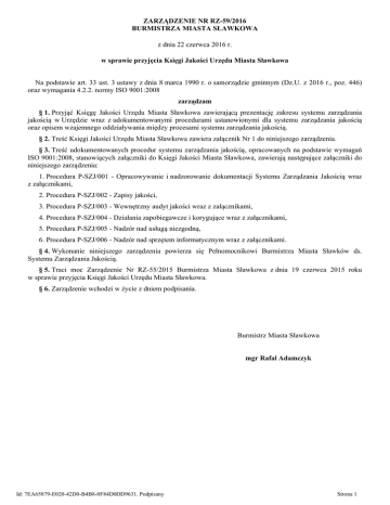 ZARZĄDZENIE NR RZ-59/2016 BURMISTRZA MIASTA SŁAWKOWA z dnia 22 czerwca 2016 r. w sprawie przyjęcia Księgi Jakości Urzędu Miasta Sławkowa Na podstawie art. 33 ust. 3 ustawy z dnia 8 marca 1990 r. o samorządzie gminnym (Dz.U. z 2016 r., poz. 446) oraz wymagania 4.2.2. normy ISO 9001:2008 zarządzam § 1. Przyjąć Księgę Jakości Urzędu Miasta Sławkowa zawierającą prezentację zakresu systemu zarządzania jakością w Urzędzie wraz z udokumentowanymi procedurami ustanowionymi dla systemu zarządzania jakością oraz opisem wzajemnego oddziaływania między procesami systemu zarządzania jakością. § 2. Treść Księgi Jakości Urzędu Miasta Sławkowa zawiera załącznik Nr 1 do niniejszego zarządzenia. § 3. Treść udokumentowanych procedur systemu zarządzania jakością, opracowanych na podstawie wymagań ISO 9001:2008, stanowiących załączniki do Księgi Jakości Miasta Sławkowa, zawierają następujące załączniki do niniejszego zarządzenia: 1. Procedura P-SZJ/001 - Opracowywanie i nadzorowanie dokumentacji Systemu Zarządzania Jakością wraz z załącznikami, 2. Procedura P-SZJ/002 - Zapisy jakości, 3. Procedura P-SZJ/003 - Wewnętrzny audyt jakości wraz z załącznikami, 4. Procedura P-SZJ/004 - Działania zapobiegawcze i korygujące wraz z załącznikami, 5. Procedura P-SZJ/005 - Nadzór nad usługą niezgodną, 6. Procedura P-SZJ/006 - Nadzór nad sprzętem informatycznym wraz z załącznikami. § 4. Wykonanie niniejszego zarządzenia powierza się Pełnomocnikowi Burmistrza Miasta Sławków ds. Systemu Zarządzania Jakością. § 5. Traci moc Zarządzenie Nr RZ-55/2015 Burmistrza Miasta Sławkowa z dnia 19 czerwca 2015 roku w sprawie przyjęcia Księgi Jakości Urzędu Miasta Sławkowa. § 6. Zarządzenie wchodzi w życie z dniem podpisania. Burmistrz Miasta Sławkowa mgr Rafał Adamczyk Id: 7EA65879-E020-42D0-B4B8-0F84D0DD9631. Podpisany Strona 1 URZĄD MIASTA SŁAWKOWA 41–260 Sławków, Rynek 1 telefon: +48 (32) 2 931 552, fax. +48 (32) 2 931 233 e-mail: [email protected], http://www.slawkow.pl Obowiązuje od 2016.06.22 Księga Jakości Urzędu Miasta Sławkowa Strona 1 z 60 Wydanie 07 KSIĘGA JAKOŚCI URZĘDU MIASTA SŁAWKOWA wg normy ISO 9001:2008 Opracował: Zatwierdził: data, podpis data, podpis Niniejszy dokument opracowano na potrzeby systemu zarządzania jakością w Urzędzie Miasta Sławkowa wg wymagania 4.2.1.b i 4.2.2. ISO 9001:2008 Załącznik Nr 1 do Zarządzenia Burmistrza Miasta Sławkowa Nr RZ-59/2016 z dnia 22 czerwca 2016 roku Id: 7EA65879-E020-42D0-B4B8-0F84D0DD9631. Podpisany Strona 2 URZĄD MIASTA SŁAWKOWA 41–260 Sławków, Rynek 1 telefon: +48 (32) 2 931 552, fax. +48 (32) 2 931 233 e-mail: [email protected], http://www.slawkow.pl Obowiązuje od 2016.06.22 Księga Jakości Urzędu Miasta Sławkowa Strona 2 z 60 Wydanie 07 Niniejszy dokument opracowano na potrzeby systemu zarządzania jakością w Urzędzie Miasta Sławkowa wg wymagania 4.2.1.b i 4.2.2. ISO 9001:2008 Załącznik Nr 1 do Zarządzenia Burmistrza Miasta Sławkowa Nr RZ-59/2016 z dnia 22 czerwca 2016 roku Id: 7EA65879-E020-42D0-B4B8-0F84D0DD9631. Podpisany Strona 3 URZĄD MIASTA SŁAWKOWA 41–260 Sławków, Rynek 1 telefon: +48 (32) 2 931 552, fax. +48 (32) 2 931 233 e-mail: [email protected], http://www.slawkow.pl Obowiązuje od 2016.06.22 Księga Jakości Urzędu Miasta Sławkowa Strona 3 z 60 Wydanie 07 I. WPROWADZENIE ..............................................................................................5 1. PREZENTACJA MIASTA SŁAWKOWA .....................................................................5 2. PREZENTACJA URZĘDU MIASTA SŁAWKOWA.........................................................8 3. STRUKTURA ORGANIZACYJNA UM SŁAWKÓW UWZGLĘDNIAJĄCA ZAKRES SZJ ........11 II. WYMAGANIA SYSYTEMU ZARZĄDZANIA JAKOŚCIĄ...............................................12 1. ZAKRES I CEL KSIĘGI JAKOŚCI URZĘDU ............................................................12 1.1. ZAKRES KSIĘGI JAKOŚCI .................................................................................12 1.2. CEL KSIĘGI JAKOŚCI .......................................................................................12 2. DOKUMENTY POWOŁANE ..................................................................................13 3. TERMINOLOGIA...............................................................................................13 3.1. TERMINOLOGIA ZWIĄZANA Z ADMINISTRACJĄ ...................................................13 3.2. TERMINOLOGIA ZWIĄZANA Z JAKOŚCIĄ ............................................................14 4. SYSTEM ZARZĄDZANIA JAKOŚCIĄ W URZĘDZIE ..................................................15 4.1. UWAGI OGÓLNE ..............................................................................................15 4.2. WYMAGANIA DOTYCZĄCE DOKUMENTACJI..........................................................18 4.2.1. POSTANOWIENIA OGÓLNE........................................................................18 4.2.2. KSIĘGA JAKOŚCI .....................................................................................18 4.2.3. NADZÓR NAD DOKUMENTAMI ...................................................................19 4.2.4. NADZÓR NAD ZAPISAMI ...........................................................................19 5. ODPOWIEDZIALNOŚĆ KIEROWNICTWA ..............................................................20 5.1. ZAANGAŻOWANIE KIEROWNICTWA ...................................................................20 5.1.1. OPIS PROCESU OPERACYJNEGO ZARZĄDZANIA URZĘDEM ............................21 5.2. ORIENTACJA NA KLIENTA .................................................................................21 5.3. POLITYKA JAKOŚCI..........................................................................................22 5.4. PLANOWANIE.............................................................................................