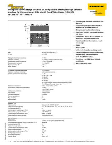 Wieloprotokołowa stacja sieciowa BL compact dla przemysłowego Ethernet Interface for Connection of 2 BL ident® Read/Write Heads (HF/UHF) BLCEN-2M12MT-2RFID-S ■ Kompaktowe, sieciowe moduły I/O OnMachine™ ■ Urządzenie podrzędne EtherNet/IP™, Modbus® TCP lub PROFINET® ■ Zintegrowany switch ethernetowy ■ Obsługa prędkości transmisji 10 Mbps / 100 Mbps ■ Dwa męskie złącza M12, 4-pinowe, kodowanie D, do podłączenia sieci ■ 2 przełączniki obrotowe adresu węzła sieciowego ■ IP69K ■ M12 I/O ports ■ LEDs indicate status and diagnostic Typ Nr kat. BLCEN-2M12MT-2RFID-S 6811450 Napięcie nominalne systemu Zasilanie systemu Podłączenie napięcia zasilania Dopuszczalny zakres Vi Prąd nominalny Vi Maks. prąd Vi 24 VDC za pomocą napięcia pomocniczego 2 x M12, 5-pinów 18…30VDC 150 mA 1A Prędkość transmisji sieciowej Nastawa prędkości transmisji Zakres adresowania sieciowego Wykrywanie protokołu web serwer Interfejs serwisowy Numer sprzedawcy Typ produktu Kod produktu 10/100 Mbps automatyczna detekcja 1…92 0 (192.168.1.254) 93 (BootP) 94 (DHCP) 95 (PGM) 96 (PGM-DHCP) *Rekomendowane dla PROFINET 97…99 (specyfikacja producenta) 2 dec. rotary coding switch 2 x M12 4-pin, M12 D-coded automatycznie zintegrowane Ethernet 48 12 11450 Modbus TCP Adresowanie Obsługiwane kody funkcji Liczba połączeń TCP Liczba danych wejściowych (PAE) Adres startowy rejestru wejścia Liczba danych wyjściowych (PAA) Adres startowy rejestru wyjścia Statyczne IP, BOOTP, DHCP FC1, FC2, FC3, FC4, FC5, FC6, FC15, FC16, FC23 6 maks. 14 rejestr 0 (0x0000 hex) maks. 12 rejestr 2048 (0x0800 hex) EtherNet/IP™ Adresowanie Topologia pierścieniowa Device Level Ring (DLR) Liczba połączeń CIP Adres instancji wejścia Liczba danych wejściowych (PAE) Adres instancji wyjścia Liczba danych wyjściowych (PAA) Konfiguracja instancji Rozmiar konfiguracji Format ramki zgodnie ze specyfikacją EtherNet/IP™ wsparcie 6 103 15 INT 104 12 INT 106 0 Data - INT Edition • 2016-10-02T01:16:22+02:00 Adresowanie sieciowe Technologia podłączenia sieciowego 1/6 ■ Electronics galvanically isolated from the field level via optocouplers ■ Einfaches RFID Interface ■ Anschluss von 2 BL Ident SchreibLeseköpfen ■ Max. Kabellänge 50 m Hans Turck GmbH & Co.KG ñ D-45472 Mülheim an der Ruhr ñ Witzlebenstraße 7 ñ Tel. 0208 4952-0 ñ Fax 0208 4952-264 ñ [email protected] ñ www.turck.com Wieloprotokołowa stacja sieciowa BL compact dla przemysłowego Ethernet Interface for Connection of 2 BL ident® Read/Write Heads (HF/UHF) BLCEN-2M12MT-2RFID-S PROFINET Adresowanie Klasa zgodności Min. czas cyklu Diagnostyka Detekcja topologii Automatyczne adresowanie Protokół redundancji medium (Media Redundancy Protocol - MRP) Liczba danych wejściowych (PAE) Liczba danych wyjściowych (PAA) Technology Signal type Number of channels Sensor supply Simultaneity factor Transmission rate Cable length Izolacja elektryczna Wymiary Temperatura pracy Temperatura składowania Wilgotność względna Test wibracyjny Zwiększona odporność na wibracje - do 20 g (przy 10 do 150 Hz) Test przeciążeniowy/wstrząsowy Kompatybilność elektromagnetyczna Klasa ochrony maks. 24 Bajt maks. 24 Bajt Simple RFID interface 2 0,5 A pro Kanal, kurzschlussfest 1 115,2 kbps 50 Meter Trennung von Elektronik und Feldebene via Optokoppler 113 x 71 x 32.5 mm -40…+70 ºC -40…+85 ºC 15 to 95% (non-condensing) zgodnie z IEC 61131-2 For mounting on base plate or machinery zgodnie z IEC 61131-2 zgodnie z IEC 61131-2 IP67 IP69K Nylon glasfaserverstärkt, Stecker nickelbeschichtet czarny Lexan niklowany mosiądz Polyester with Polycarbonate overlay Nickel-plated brass 360 ± 20 g CE, cULus Edition • 2016-10-02T01:16:22+02:00 materiał obudowy Kolor obudowy Window material Materiał śrub Materiał etykiety Ground tab material Waga Certyfikaty i dopuszczenia DCP B (RT) 1 ms zgodnie z PROFINET Alarm Handling wsparcie wsparcie wsparcie 2/6 Hans Turck GmbH & Co.KG ñ D-45472 Mülheim an der Ruhr ñ Witzlebenstraße 7 ñ Tel. 0208 4952-0 ñ Fax 0208 4952-264 ñ [email protected] ñ www.turck.com Wieloprotokołowa stacja sieciowa BL compact dla przemysłowego Ethernet Interface for Connection of 2 BL ident® Read/Write Heads (HF/UHF) BLCEN-2M12MT-2RFID-S Ethernet Przewód sieciowy (przykład): RSSD RSSD 441-2M nr kat. U-02482 lub RSSD-RSSD-441-2M/S2174 nr kat. 6914218 RFID Channels Złącze …/S2503 Przewód łączący (przykład): RK 4.5T-2-RS 4.5T/S2501 nr kat. U3-01243 lub RK4.5T-2-RS4.5T/S2500 nr kat. 6699200 Złącza …/S2501 Zasilanie pomocnicze Konfiguracja pinów Przewód łączący (przykład): RKC 4.4T-2-RSC 4.4T nr kat. U5264 Edition • 2016-10-02T01:16:22+02:00 lub RKC4.4T-2-RSC4.4T/TEL nr kat. 6625208 3/6 Hans Turck GmbH & Co.KG ñ D-45472 Mülheim an der Ruhr ñ Witzlebenstraße 7 ñ Tel. 0208 4952-0 ñ Fax 0208 4952-264 ñ [email protected] ñ www.turck.com Wieloprotokołowa stacja sieciowa BL compact dla przemysłowego Ethernet Interface for Connection of 2 BL ident® Read/Write Heads (HF/UHF) BLCEN-2M12MT-2RFID-S Status: Station LED LED Color Status Description wył. Zasilanie wyłączone CZERWONY zał. Niewystarczający poziom zasilania CZERWONY MIGANIE (1Hz) Niewłaściwa konfiguracja stacji CZERWONY MIGANIE (4 Hz) Brak modułu komunikacji sieciowej ZIELONY zał. Stacja OK ZIELONY MIGANIE Aktywny tryb wymuszenia wył. Zasilanie wyłączone ZIELONY zał. Połączono z urządzeniem nadrzędnym ZIELONY MIGANIE Gotowy CZERWONY zał. Błąd CZERWONY MIGANIE WINK ŻÓŁTY zał. Wyszukiwanie DHCP/BOOTP GREEN ON I/O slots OK GREEN FLASHING (1Hz) At least one I/O slot in idle state RED ON At least one faulty I/O slot RED FLASHING At least one I/O slot in faulty state Color Status Description wył. Wyłączona diagnostyka CZERWONY zał. Błąd komunikacyjny stacji / sieci CZERWONY MIGANIE (0,5Hz) Skrócona diagnostyka OFF No tag, diagnostic disabled GREEN ON Tag available GREEN FLASHING (2 Hz) Data exchange with tag ena