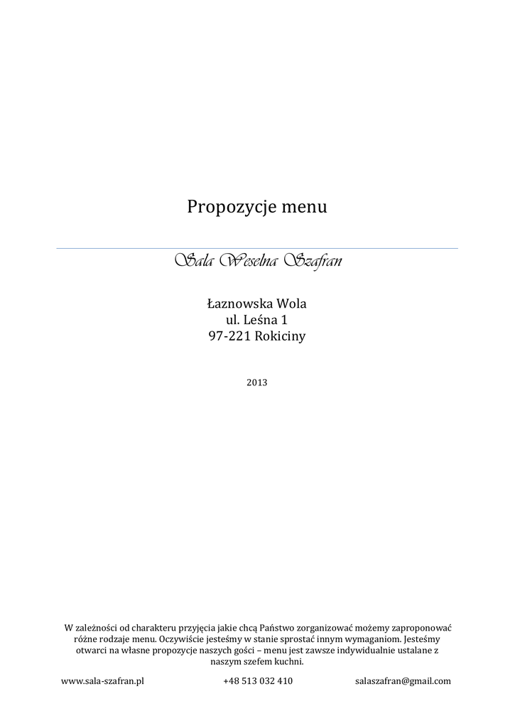 Propozycje menu Sala Weselna Szafran Łaznowska Wola ul. Leśna 1 97-221 Rokiciny 2013 W zależności od charakteru przyjęcia jakie chcą Państwo zorganizować możemy zaproponować różne rodzaje menu. Oczywiście jesteśmy w stanie sprostać innym wymaganiom. Jesteśmy otwarci na własne propozycje naszych gości – menu jest zawsze indywidualnie ustalane z naszym szefem kuchni. www.sala-szafran.pl +48 513 032 410 [email protected] Szafran Sala weselna MENU Zupy: 1) Domowy rosół z makaronem lub kołdunami 2) Pikantna zupa gulaszowa 3) Forszmak- zupa gulaszowa+ ogórki konserwowe 4) Krem pomidorowy z pesto bazyliowym 5) Zupa grzybowa z łazankami 6) Staropolski żur z jajkiem i białą kiełbasą (opcjonalnie: podawany w chlebie) 7) Krem pieczarkowy z groszkiem ptysiowym lub czosnkowymi grzankami 8) Flaczki staropolskie 9) Zupa meksykańska z mięsnymi pulpecikami 10) Barszcz czerwony z uszkami/ krokietem/ pasztecikami 11) Kwaśnica na żebrach Na gorące dni polecamy: 1) 2) 3) 4) Chłodnik bałkański (z ogórków) Chłodnik owocowy Chłodnik hiszpański- Gazpacho (z pomidorów, ogórka, papryki) Chłodnik z buraków Dania główne: 1) Schab pieczony w sosie własnym 2) Polędwiczki wieprzowe w sosie grzybowym 3) Roladka z kurczaka zapiekany z serem żółtym i ananasem / pieczarkami 4) Kotlet schabowy 5) Żeberka w sosie BBQ 6) Rolada z kurczaka z żółtym serem i ananasem 7) Roladka z kurczaka z żółtym serem i pieczarkami 8) Karp/ miruna/ dorsz w panierce 9) De Volaille z prawdziwym masłem ziołowym 10) Faszerowane skrzydełka farszem mięsnym, grzybowym lub jarzynowym 11) Szaszłyk ze schabu lub kurczaka z cukinią, papryką, cebulą i pieczarką 12) Pieczone udko z kurczaka 13) Gołąbki w sosie pomidorowym 14) Pierogi z farszem mięsnym / grzybowym / ruskie 15) Kotlet mielony ze śliwka w panierce Danie podawane do wyboru z: 1) 2) 3) 4) 5) 6) Ziemniaki z wody z koperkiem Ziemniaki zapiekane po polsku (posypywane czosnkiem, majerankiem, solą i pieprzem) Frytki Ryż z warzywami Kluski śląskie Kopytka www.sala-szafran.pl +48 513 032 410 [email protected] Szafran Sala weselna Ciepły dodatek typu: 1) 2) 3) 4) 5) Zasmażana kapusta Zasmażane buraczki Marchewka z groszkiem lub ananasem Warzywa na parze (brokuł, marchewka, kalafior) Fasolka szparagowa z zasmażką z bułki i masła Surówki: 1) 2) 3) 4) 5) 6) 7) 8) Z marchwi z oliwą lub chrzanem Z selera ze śmietanką Z białej kapusty z dressingiem jogurtowo- majonezowym lub oliwy z oliwek Z czerwonej kapusty Z czerwonych buraków z szalotką i kolendą Mizeria z dressingiem śmietanowym Wiosenna sałatka z kapusty pekińskiej i sezonowych warzyw Z kiszonego ogórka i cebuli Przekąski: 1) Półmisek wędlin (schab pieczony ze śliwką, faszerowany boczek, wędliny) 2) Schab po warszawsku (z gotowanym jajkiem, majonezem, chrzanem i szczypiorkiem) 3) Szynka faszerowana chrzanem 4) Faszerowane jajka 5) Caprese 6) Deska serów 7) Pikle (papryka, cebulka, grzybki, ogórki) 8) Panierowane krewetki tygrysie z sosem koktajlowym 9) Roladka z łososiem i szpinakiem 10) Nuggets z sosem czosnkowym 11) Zimne nóżki 12) Koreczki 13) Ryba po grecku Sałatki: 1) Grecka 2) Z grillowanym kurczakiem 3) Z tuńczykiem i grzankami 4) Z selera z kurczakiem, ananasem, kukurydzą i żółtym serem 5) Mix sałat z dressingiem 6) Z szynką, żółtym serem i ananasem 7) Z gyrosa 8) Tradycyjna jarzynowa 9) Z brokułami 10) Z makaronem tortellini 11) Z pieczarkami www.sala-szafran.pl +48 513 032 410 [email protected] Szafran Sala weselna Śledzie: 1) 2) 3) 4) 5) Śledź na kolorowo z dressingiem jarzynowo- majonezowym i cytryną Rolmopsy W śmietanie Śledź pod pierzynką Śledź z zielonym groszkiem Desery: 1) Lody z sosem i /lub owocami 2) Szarlotka na ciepło z lodami 3) Sernik z sosem waniliowym Napoje: 1) 2) 3) 4) Kawa Herbata Woda z miętą i cytryną Soki Sala Weselna Szafran również ma do zaoferowania: 1) Fontannę czekolady z owocami 2) Stół wiejski 3) Patery z ciastami Z powyższych propozycji możecie Państwo skomponować własne menu albo skontaktować się z nami i skorzystać z naszej pomocy. www.sala-szafran.pl +48 513 032 410 [email protected] Szafran Sala weselna MENU NA KONSOLACJĘ (30-35zł) Zupa (do wyboru): 1) Domowy rosół z makaronem lub kołdunami 2) Zupa lub krem pieczarkowy z groszkiem ptysiowym Danie główne (do wyboru): 1) Kotlet schabowy 2) Pieczone udko z kurczaka 3) Żeberko w sosie BBQ lub miodowo- musztardowym Podawane z: 1) Zasmażana kapusta 2) Ziemniaczki po polsku 3) Kluski śląskie Surówki (do wyboru): 1) 2) 3) 4) Z białej kapusty z dressingiem jogurtowo- majonezowym lub oliwy z oliwek Z selera ze śmietanką Z kiszonego ogórka i cebulki Z czerwonej kapusty Deser (do wyboru): 1) Szarlotka na ciepło z lodami 2) Sernik z sosem waniliowym Napoje: 1) 2) 3) 4) Kawa Herbata Woda Soki www.sala-szafran.pl +48 513 032 410 [email protected] Szafran Sala weselna MENU NA KOMUNIĘ/CHRZCINY (80zł) Zupa (do wyboru): 1) Domowy rosół z makaronem lub kołdunami 2) Krem pieczarkowy z groszkiem ptysiowym 3) Barszcz czerwony z uszkami/ krokietem/ pasztecikami 7) Wiosenna sałatka z kapusty pekińskiej i sezonowych warzyw 8) Z kiszonego ogórka i cebuli Deser (do wyboru): 1) Lody z owocami i sosem 2) Szarlotka na ciepło z lodami Napoje: Danie główne (do wyboru): 1) Faszerowane skrzydełka farszem mięsnym, grzybowym lub jarzynowym 2) De Volaille z prawdziwym masłem ziołowym 3) Filet z kurczaka zapiekany z serem żółtym i ananasem 4) Kotlet mielony ze śliwka w panierce 1) 2) 3) 4) Dodatkowo: Podawane z: 1) 2) 3) 4) Kluski śląskie Ziemniaki z wody z koperkiem Ziemniaki opiekane Frytki Surówki (2 do wyboru): 1) Z marchwi z oliwą lub chrzanem 2) Z selera ze śmietanką 3) Z białej kapusty z dressingiem jogurtowo- majonezowym lub oliwy z oliwek 4) Z czerwonej kapusty 5) Z czerwonych buraków z szalotką i Kolendą 6) Mizeria z dressingiem śmietanowym www.sala-szafran.pl Kawa Herbata Soki Woda z cytryną i