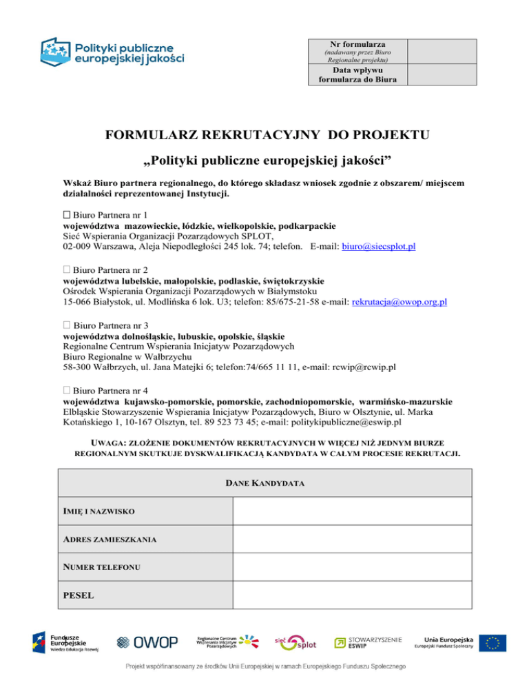 Nr formularza (nadawany przez Biuro Regionalne projektu) Data wpływu formularza do Biura FORMULARZ REKRUTACYJNY DO PROJEKTU „Polityki publiczne europejskiej jakości” Wskaż Biuro partnera regionalnego, do którego składasz wniosek zgodnie z obszarem/ miejscem działalności reprezentowanej Instytucji. Biuro Partnera nr 1 województwa mazowieckie, łódzkie, wielkopolskie, podkarpackie Sieć Wspierania Organizacji Pozarządowych SPLOT, 02-009 Warszawa, Aleja Niepodległości 245 lok. 74; telefon. E-mail: [email protected] Biuro Partnera nr 2 województwa lubelskie, małopolskie, podlaskie, świętokrzyskie Ośrodek Wspierania Organizacji Pozarządowych w Białymstoku 15-066 Białystok, ul. Modlińska 6 lok. U3; telefon: 85/675-21-58 e-mail: [email protected] Biuro Partnera nr 3 województwa dolnośląskie, lubuskie, opolskie, śląskie Regionalne Centrum Wspierania Inicjatyw Pozarządowych Biuro Regionalne w Wałbrzychu 58-300 Wałbrzych, ul. Jana Matejki 6; telefon:74/665 11 11, e-mail: [email protected] Biuro Partnera nr 4 województwa kujawsko-pomorskie, pomorskie, zachodniopomorskie, warmińsko-mazurskie Elbląskie Stowarzyszenie Wspierania Inicjatyw Pozarządowych, Biuro w Olsztynie, ul. Marka Kotańskiego 1, 10-167 Olsztyn, tel. 89 523 73 45; e-mail: [email protected] UWAGA: ZŁOŻENIE DOKUMENTÓW REKRUTACYJNYCH W WIĘCEJ NIŻ JEDNYM BIURZE REGIONALNYM SKUTKUJE DYSKWALIFIKACJĄ KANDYDATA W CAŁYM PROCESIE REKRUTACJI. DANE KANDYDATA IMIĘ I NAZWISKO ADRES ZAMIESZKANIA NUMER TELEFONU PESEL 1 ADRES E-MAIL Dane reprezentowanej Instytucji (zwanej dalej Instytucją Wysyłającą) NAZWA INSTYTUCJI DANE ADRESOWE INSTYTUCJI LUB ODDZIAŁU, TELEFON NIP ADRES E-MAIL, STRONA WWW KRYTERIA REKRUTACJI: KRYTERIA FORMALNE Status Instytucji Wysyłającej Forma powiązania kandydata z Instytucją Wysyłającą w sposób ciągły od min. 2 lat (w przypadku JST umowa o pracę na czas nieokreślony) Doświadczenie Instytucji Wysyłającej związane z politykami publicznymi organizacja pozarządowa jednostka samorządu terytorialnego lub jej organizacyjna lub komunalna osoba prawna organizacja pracodawców/związek zawodowy, pracownik/współpracownik członek wolontariusz Obszar polityk publicznych, będący w zainteresowaniu Instytucji Wysyłającej: współpraca administracji publiczną z organizacjami pozarządowymi wsparcie przedsiębiorczości społecznej prowadzenie konsultacji społecznych inny, jaki?.................................................................... Umiejętności językowe kandydata 2 jednostka Oświadczam, iż znam język na poziomie minimum B2 angielski niemiecki włoski grecki inny, jaki? .................................................................. Zgoda Kierownika Instytucji Wysyłającej na wyjazd Załączam kopię certyfikatu/zaświadczenia potwierdzającego znajomość ww. języka na poziomie min. B2 lub Deklaruję poddanie się ocenie znajomości ww. języka na poziomie min. B2 Oświadczam, iż posiadam pisemna zgodę Kierownika Instytucji Wysyłającej na wyjazd w ramach projektu (wzór zał. nr 1 do Regulaminu Rekrutacji). KRYTERIA MERYTORYCZNE Opisz doświadczenia swojej instytucji/organizacji w kształtowaniu polityk publicznych (Max. 2000 znaków) Opisz swoje doświadczenia w kształtowaniu polityk publicznych (Max. 2000 znaków) Opisz celu wyjazdu i oczekiwane efektów (kryterium 6.1 Regulaminu rekrutacji (Max. 2000 znaków) Opisz dlaczego chcesz wziąć udział w projekcie, wskaż potrzeby własne/ Instytucji Wysyłającej (kryterium 6.2 Regulaminu rekrutacji) (Max. 2000 znaków) 3 Opisz cechy i kluczowe kompetencje, które pomogą Ci w efektywnym udziale w projekcie (kryterium 6.3 Regulaminu rekrutacji) (Max. 2000 znaków) Opisz w jaki sposób planujesz wykorzystać zdobytą wiedzę i doświadczenie (kryterium 6.4 Regulaminu rekrutacji) (Max. 2000 znaków) KRYTERIA MERYTORYCZNE Opisz doświadczenia swojej instytucji/organizacji w kształtowaniu polityk publicznych (Max. 2000 znaków) KRYTERIA PREMIUJĄCE Kryteria premiujące (proszę, o zaznaczenie w przypadku występowania danej sytuacji) ………………………… (data) 4 sprawuję stanowisko kierownicze/zarządcze/decyzyjne w Instytucji Wysyłającej jakie?............................................................. kobieta na stanowisku zarządczym/decyzyjnym osoba z niepełnosprawnością osoba z miejscowości do 250 tys. mieszkańców …………………………… (podpis kandydata/tki) Oświadczenia OŚWIADCZENIA CZYTELNE PODPISY KANDYDATA/TKI 1. Oświadczam, że jestem powiązany formalnie i/lub zatrudniony w Instytucji Wysyłającej od minimum 2 lat. (w przypadku JST umowa o pracę na czas nieokreślony) 2. Oświadczam, że Instytucja Wysyłająca, którą reprezentuję jest zaangażowana w praktyce w proces wdrażania lub kreowania polityk publicznych, głównie w zakresie współpracy administracji z NGO, wsparciem przedsiębiorczości społecznej lub prowadzeniem konsultacji społecznych. 3. Zobowiązanie do nierezygnowania z zatrudnienia/związania z Instytucją Wysyłającą przez przynajmniej 1 rok od dnia powrotu z mobilności 4. Oświadczam, iż podane w formularzu rekrutacyjnym informacje są zgodne z prawdą. 5. Oświadczam, że zapoznałem się z „Regulaminem rekrutacji i uczestnictwa w Projekcie „Polityki publiczne europejskiej jakości” i akceptuję jego postanowienia. 6. Wyrażam zgodę na przetwarzanie moich danych osobowych zawartych w formularzu rekrutacyjnym dla potrzeb rekrutacji, zgodnie z ustawą z dnia 29.08.1997 r. o Ochronie danych Osobowych (Dz.U.Nr. 133 poz.883). Załączniki: zgoda Instytucji Wysyłającej na wyjazd kandydata (zał. Nr 1 do Regulaminu Rekrutacji) kopia certyfikatu /zaświadczenia potwierdzającego umiejętności językowe (jeśli dotyczy) 5