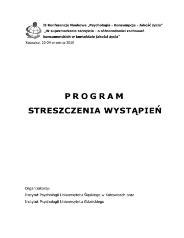 II Konferencja Naukowa „Psychologia - Konsumpcja - Jakość życia” „W supermarkecie szczęścia - o różnorodności zachowań konsumenckich w kontekście jakości życia” Katowice, 22-24 września 2010 PROGRAM STRESZCZENIA WYSTĄPIEŃ Organizatorzy: Instytut Psychologii Uniwersytetu Śląskiego w Katowicach oraz Instytut Psychologii Uniwersytetu Gdańskiego Konferencję patronatem honorowym objęli: JM Rektor Uniwersytetu Śląskiego Prof. zw. dr hab. Wiesław Banyś JM Rektor Uniwersytetu Gdańskiego Prof. dr hab. Bernard Lampek Dziekan Wydz. Pedagogiki i Psychologii Dr hab. Zbigniew Spendel Dziekan Wydziału Nauk Społecznych UG Prof. UG dr hab. Beata Pastwa-Wojciechowska Prezydent Miasta Katowic Piotr Uszok Akademickie Stowarzyszenie Psychologów Ekonomicznych SPIS TREŚCI Komitet Naukowy i Komitet Organizacyjny Konferencji 4 Program Ramowy 5 Szczegółowy program konferencji 6 Streszczenia wystąpień 11 Indeks autorów 71 3 II Konferencja Naukowa „Psychologia – Konsumpcja – Jakość życia” „W supermarkecie szczęścia – o różnorodności zachowań konsumenckich w kontekście jakości życia” Katowice, 22-24 września 2010 KOMITET NAUKOWY: prof. UŚ dr hab. Małgorzata Górnik-Durose (Uniwersytet Śląski w Katowicach) – przewodnicząca prof. dr hab. Tadeusz Tyszka (Akademia Leona Koźmińskiego) prof. dr hab. Teresa Słaby (Szkoła Główna Handlowa) prof. dr hab. Barbara Kożusznik (Uniwersytet Śląski w Katowicach) prof. UG dr hab. Mariola Bidzan (Uniwersytet Gdański) prof. UG dr hab. Hanna Brycz (Uniwersytet Gdański) prof. UG dr hab. Anna Maria Zawadzka (Uniwersytet Gdański) prof. SGH dr hab. Bogdan Mróz (Szkoła Główna Handlowa) dr hab. Zbigniew Spendel (Uniwersytet Śląski w Katowicach) KOMITET ORGANIZACYJNY dr Teresa Sikora – przewodnicząca dr Anita Gałuszka dr Maciej Januszek mgr Łukasz Jach 4 PROGRAM RAMOWY Środa, 22 września 2010 12.00 - 14.00 Rejestracja uczestników 13.00 - 14.00 Obiad 14.00 - 14.15 Otwarcie konferencji 14.15 - 15.15 Wykład 1 15.30 - 15.50 Przerwa na kawę 15.50 - 17.10 Sesja I: Pieniądze a jakość życia 17.15 Wycieczka po Nikiszowcu i Giszowcu 19.00 Kolacja w „Dworku pod Lipami” Czwartek, 23 września 2010 9.00 - 10.00 Wykład 2 10.00 - 10.20 Przerwa na kawę i herbatę 10.20 - 12.00 Sesja II: Aktualne obrzeża konsumpcji 12.00 - 13.30 Obiad 13.30 - 15.30 Sesja III: Konsumowanie pracy 15.30 Przerwa na kawę i herbatę 16.00 Wyjazd do zabytkowej kopalni Guido w Zabrzu 19.00 Kolacja Piątek, 24 września 2010 9.00 - 10.00 Wykład 3 10.00 - 10.20 Przerwa na kawę i herbatę 10.20 - 11.40 Sesja IV: Osobowe i osobowościowe wyznaczniki konsumpcji 11.45 - 12.45 Sesja V: Przyczynki konsumenckie 12.45 - 13.45 Dyskusja panelowa 13.45 Zamknięcie konferencji 14.00 Obiad 5 SZCZEGÓŁOWY PROGRAM KONFERENCJI Środa, 22 września 2010 12.00 - 14.00 Rejestracja uczestników (budynek Wydziału Pedagogiki i Psychologii, przy ul. Grażyńskiego 53 w Katowicach). 13.00 - 14.00 Obiad 14.00 - 14.15 OTWARCIE KONFERENCJI 14.15 - 15.15 WYKŁAD INAUGURACYJNY: Tadeusz Tyszka (Akademia Leona Koźmińskiego) Wybory konsumenckie w sytuacji skrajnej niewiedzy 15.30 - 15.50 15.50 - 17.10 15.50 - 16.10 16.10 - 16.30 16.30 - 16.50 16.50 - 17.10 6 Przerwa na kawę Sesja I: PIENIĄDZE A JAKOŚĆ ŻYCIA Dominika Maison, Joanna Rudzińska Kto jest szczęśliwy – ten kto ma, czy ten, któremu tylko tak się wydaje? Agata Gąsiorowska Style zakupów nierefleksyjnych a postawy wobec pieniędzy Magdalena Marczak, Grażyna Wąsowicz-Kiryło Żyjąc z dnia na dzień lub myśląc o przyszłości. O finansowej orientacji temporalnej w świecie pieniędzy Grażyna Wąsowicz-Kiryło, Katarzyna Sekścińska Materializm a ogólna satysfakcja z życia i postawy wobec pieniędzy 17.15 Wycieczka po Nikiszowcu i Giszowcu 19.00 Kolacja w „Dworku pod Lipami” Czwartek, 23 września 2010 9.00 - 10.00 WYKŁAD: Helga Dittmar (University of Sussex, Wielka Brytania) What is the price of consumer culture? The psychological impact of the 'material good life' ideal on well-being 10.00 - 10.20 10.20 - 12.00 10.20 - 10.40 10.40 - 11.00 11.00 - 11.20 11.20 - 11.40 11.40 - 12.00 12.00 - 13.30 Przerwa na kawę i herbatę Sesja II: AKTUALNE OBRZEŻA KONSUMPCJI Małgorzata Bombol Design a jakość życia - marzenia i realia Mariusz Jędrzejko Młodzi w szale zakupów i nowego stylu życia - studium socjopedagogiczne Jarosław Polak Konsumpcjonizm a religijność Agata Neale Bawełniana torba, szklana butelka, certyfikat bio – czyli o alternatywnych wzorach konsumpcji Łukasz Jach Prorocy Syjonu w konsumpcyjnym Babilonie – muzyka reggae jako wyraz sprzeciwu wobec współczesnej hegemonii pieniądza Obiad W SESJI PLAKATOWEJ: Michał Cebula, Piotr Kucharski Antykonsumpcja jako wyraz dbałości o jakość życia Piotr Buras, Miłosz Dzenis, Agata Hublewska, Mariusz Niderla, Natalia Potrykus, Magda Skwierawska Jak świętować aby być zadowolonym z życia? 7 Czwartek, 23 września 2010 (c.d.) 13.30 - 15.30 13.30 - 13.50 13.50 - 14.10 14.10 - 14.30 14.30 - 14.50 14.50 - 15.10 15.10 - 15.30 15.30 Sesja III: KONSUMOWANIE PRACY Damian Grabowski Praca a konsumpcja i odraczanie gratyfikacji. Pasjonująca praca jako forma konsumpcji Mariola Paruzel Dwa światy – o jakości życia, poczuciu sukcesu i materialistycznomerkantylnej orientacji w sektorze prywatnym i państwowym Katarzyna Janiec, Dawid Stanik Wartości i cele życiowe określające jakość życia, a poczucie niezależności osób pracujących w organizacjach działających na wysoko konkurencyjnym rynku farmaceutycznym Magdalena Nilidzińska Szkoła przestrzenią kreatywnej destrukcji i pozytywnych przeżyć jako marketing przedsiębiorczości Tomasz Wirga Rodzaj indukowanych emocji i poziom poczucia jakości życia a skuteczność rozwiązywania zadań wykorzystujących procesy Anna Szabowska-Walaszczyk, Martyna Wojtaś Pracownik jako konsument wizerunku pracodawcy: o zaangażowaniu w pracę i jakości życia 