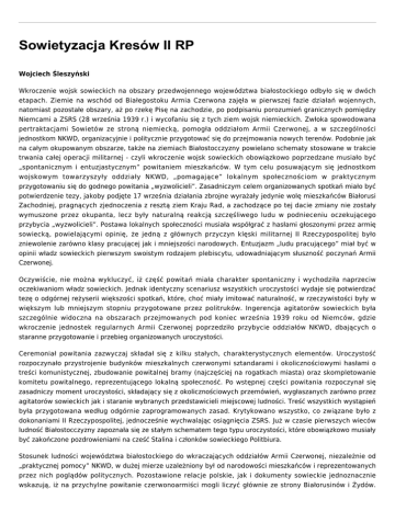 Sowietyzacja Kresów II RP Wojciech Śleszyński Wkroczenie wojsk sowieckich na obszary przedwojennego województwa białostockiego odbyło się w dwóch etapach. Ziemie na wschód od Białegostoku Armia Czerwona zajęła w pierwszej fazie działań wojennych, natomiast pozostałe obszary, aż po rzekę Pisę na zachodzie, po podpisaniu porozumień granicznych pomiędzy Niemcami a ZSRS (28 września 1939 r.) i wycofaniu się z tych ziem wojsk niemieckich. Zwłoka spowodowana pertraktacjami Sowietów ze stroną niemiecką, pomogła oddziałom Armii Czerwonej, a w szczególności jednostkom NKWD, organizacyjnie i politycznie przygotować się do przejmowania nowych terenów. Podobnie jak na całym okupowanym obszarze, także na ziemiach Białostocczyzny powielano schematy stosowane w trakcie trwania całej operacji militarnej - czyli wkroczenie wojsk sowieckich obowiązkowo poprzedzane musiało być „spontanicznym i entuzjastycznym” powitaniem mieszkańców. W tym celu posuwającym się jednostkom wojskowym towarzyszyły oddziały NKWD, „pomagające” lokalnym społecznościom w praktycznym przygotowaniu się do godnego powitania „wyzwolicieli”. Zasadniczym celem organizowanych spotkań miało być potwierdzenie tezy, jakoby podjęte 17 września działania zbrojne wyrażały jedynie wolę mieszkańców Białorusi Zachodniej, pragnących zjednoczenia z resztą ziem Kraju Rad, a zachodzące po tej dacie zmiany nie zostały wymuszone przez okupanta, lecz były naturalną reakcją szczęśliwego ludu w podnieceniu oczekującego przybycia „wyzwolicieli”. Postawa lokalnych społeczności musiała współgrać z hasłami głoszonymi przez armię sowiecką, powielającymi opinię, że jedną z głównych przyczyn klęski militarnej II Rzeczypospolitej było zniewolenie zarówno klasy pracującej jak i mniejszości narodowych. Entuzjazm „ludu pracującego” miał być w opinii władz sowieckich pierwszym swoistym rodzajem plebiscytu, udowadniającym słuszność poczynań Armii Czerwonej. Oczywiście, nie można wykluczyć, iż część powitań miała charakter spontaniczny i wychodziła naprzeciw oczekiwaniom władz sowieckich. Jednak identyczny scenariusz wszystkich uroczystości wydaje się potwierdzać tezę o odgórnej reżyserii większości spotkań, które, choć miały imitować naturalność, w rzeczywistości były w większym lub mniejszym stopniu przygotowane przez politruków. Ingerencja agitatorów sowieckich była szczególnie widoczna na obszarach przejmowanych pod koniec września 1939 roku od Niemców, gdzie wkroczenie jednostek regularnych Armii Czerwonej poprzedziło przybycie oddziałów NKWD, dbających o staranne przygotowanie i przebieg organizowanych uroczystości. Ceremoniał powitania zazwyczaj składał się z kilku stałych, charakterystycznych elementów. Uroczystość rozpoczynało przystrojenie budynków mieszkalnych czerwonymi sztandarami i okolicznościowymi hasłami o treści komunistycznej, zbudowanie powitalnej bramy (najczęściej na rogatkach miasta) oraz skompletowanie komitetu powitalnego, reprezentującego lokalną społeczność. Po wstępnej części powitania rozpoczynał się zasadniczy moment uroczystości, składający się z okolicznościowych przemówień, wygłaszanych zarówno przez agitatorów sowieckich jak i staranie wybranych przedstawicieli miejscowej ludności. Treść wszystkich wystąpień była przygotowana według odgórnie zaprogramowanych zasad. Krytykowano wszystko, co związane było z dokonaniami II Rzeczypospolitej, jednocześnie wychwalając osiągnięcia ZSRS. Już w czasie pierwszych wieców ludność Białostocczyzny zapoznała się ze stałym schematem tego typu uroczystości, które obowiązkowo musiały być zakończone pozdrowieniami na cześć Stalina i członków sowieckiego Politbiura. Stosunek ludności województwa białostockiego do wkraczających oddziałów Armii Czerwonej, niezależnie od „praktycznej pomocy” NKWD, w dużej mierze uzależniony był od narodowości mieszkańców i reprezentowanych przez nich poglądów politycznych. Pozostawione relacje polskie, jak i dokumenty sowieckie jednoznacznie wskazują, iż na przychylne powitanie czerwonoarmiści mogli liczyć głównie ze strony Białorusinów i Żydów. Byłoby jednak błędem na podstawie przedstawionych relacji uogólniać postawy i rozciągać je na wszystkich przedstawicieli obu narodowości. W szczególności z dużą rezerwą do wkraczających wojsk Armii Czerwonej odnosiła się bogata ludność żydowska, obawiająca się przede wszystkim o posiadaną własność. Jednak ich zachowawcza i pełna obaw postawa nie była tak eksponowana, jak radość grup witających przybywające oddziały. Entuzjazm dużej części ludności białoruskiej i żydowskiej wynikał przede wszystkim z wiary w poprawę politycznych i ekonomicznych warunków życia. Hasła głoszone przez wkraczające oddziały sowieckie, obiecujące równość klasową, narodowościową i stworzenie nowych szans w dostępie do edukacji i urzędów państwowych, w zderzeniu z rzeczywistością II Rzeczypospolitej brzmiały zachęcająco. Niechęć do przedwojennej polityki rządu dodatkowo potęgowały doświadczenia ostatnich klęsk militarnych II Rzeczypospolitej, która wbrew buńczucznym zapowiedziom, łatwo uległa wojskom sąsiadów. Władze okupacyjne umiejętnie wykorzystywały panujące nastroje, roztaczając przed wiejską białoruską biedotą i żydowskim lumpenproletariatem wizje łatwej kariery politycznej i zawodowej. Chłop białoruski liczył przede wszystkim na rozwiązanie problemu „głodu ziemi”, podczas gdy ludność żydowska tradycyjnie poszukiwała swoich szans w miastach i wiązała duże nadzieje z przyszłymi posadami w nowej administracji. Obie grupy społeczne, zajmujące w przedwojennej Polsce najniższe szczeble w hierarchii społecznej, w myśl ideologii komunistycznej, stawały się elementem najwartościowszym, nieskażonym g
