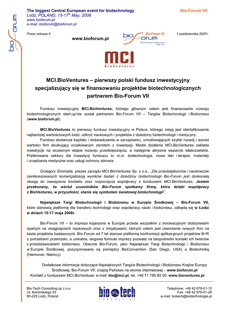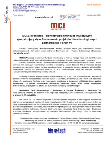 The biggest Central European event for biotechnology Lodz, POLAND, 15-17th May, 2008 Bio-Forum VII www.bioforum.pl e-mail: [email protected] Press release 4 1 października 2007r. www.bioforum.pl MCI.BioVentures – pierwszy polski fundusz inwestycyjny specjalizujący się w finansowaniu projektów biotechnologicznych partnerem Bio-Forum VII Fundusz inwestycyjny MCI.BioVentures, którego głównym celem jest finansowanie rozwoju biotechnologicznych start-up’ów został partnerem Bio-Forum VII – Targów Biotechnologii i Biobiznesu (www.bioforum.pl). MCI.BioVentures to pierwszy fundusz inwestycyjny w Polsce, którego misją jest identyfikowanie najbardziej wartościowych ludzi, odkryć naukowych i projektów z dziedziny biotechnologii i medycyny. Fundusz dostarcza kapitału i doświadczenia w zarządzaniu, umoŜliwiających szybki rozwój i wzrost wartości firm skutkujący oczekiwanym zwrotem z inwestycji. Model działania MCI.BioVentures zakłada inwestycje na wczesnym etapie rozwoju przedsięwzięcia, a następnie aktywne wsparcie właścicielskie. Preferowane sektory dla inwestycji funduszu to m.in. biotechnologia, nowe leki i terapie, materiały i urządzenia medyczne oraz usługi ochrony zdrowia. Grzegorz Gromada, prezes zarządu MCI.BioVentures Sp. z o.o.: „Dla przedsiębiorców i naukowców zainteresowanych komercjalizacją wyników badań z dziedziny biotechnologii Bio-Forum jest doskonałą okazją do nawiązania kontaktu oraz rozpoczęcia współpracy z funduszem MCI.BioVentures. Jestem przekonany, Ŝe wśród uczestników Bio-Forum spotkamy firmę, która dzięki współpracy z BioVentures, w przyszłości, stanie się symbolem światowej biotechnologii”. Największe Targi Biotechnologii i Biobiznesu w Europie Środkowej – Bio-Forum VII, które stanowią platformę dla transferu technologii oraz współpracy nauki i biobiznesu, odbędą się w Łodzi w dniach 15-17 maja 2008r. Bio-Forum VII – to impreza kojarzona w Europie przede wszystkim z innowacyjnym biobiznesem opartym na osiągnięciach naukowych oraz z inicjatywami, których celem jest utworzenie nowych firm na bazie projektów badawczych. Bio-Forum od 7 lat stanowi platformę konfrontacji aplikacyjnych projektów B+R z potrzebami przemysłu, a unikalna, targowa formuła imprezy pozwala na bezpośredni kontakt ich twórców z przedstawicielami biobiznesu. Obecnie Bio-Forum, jako Największe Targi Biotechnologii i Biobiznesu w Europie Środkowej, pozycjonowane są pomiędzy BioConvention (San Diego, USA) a Biotechniką (Hannover, Niemcy). Dodatkowe informacje dotyczące Największych Targów Biotechnologii i Biobiznesu Krajów Europy Środkowej, Bio-Forum VII, znajdą Państwo na stronie internetowej – www.bioforum.pl Kontakt z funduszem MCI.BioVentues: e-mail: [email protected], tel. +48 71 785 85 00, www.bioventures.pl. Bio-Tech Consulting sp z o.o. Ul. Kaminskiego 23 90-229 Lodz, Poland Telephone: +48 42 678-01-12 Fax: +48 42 678-01-28 e-mail: [email protected]