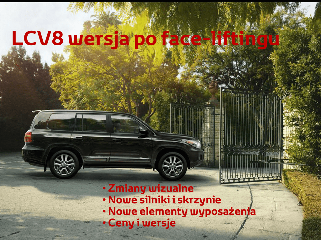 LCV8 wersja po face-liftingu • Zmiany wizualne • Nowe silniki i skrzynie • Nowe elementy wyposażenia • Ceny i wersje Zmiany wizualne STARY -przód NOWY Kierunkowskazy Nowy grill Felgi LED Nowy zderzak Chromowana ramka Zmiany wizualne - przód Zmiany wizualne - tył Nowy lampy NOWY STARY Zmiany wizualne - tył Zmiany wizualne STARY - wnętrze NOWY Nowa kolorystyka Toyota Touch PRO Lakier fortepianowy Zmiany wizualne - wnętrze WYŚWIETLACZ MIĘDZY ZEGARAMI Cyfrowy prędkościomierz Kąt skrętu kół tak jak w LC150 Wskazania nawigacji MTS tak jak w LC150 Zmiany wizualne - wnętrze Skórzane perforowane siedzenia Przednie fotele wentylowane Skóra beżowa Skóra czarna Zmiany wizualne - wnętrze Konsola centralna w kolorze lakieru fortepianowego Kamera cofania z liniami Wykończenie wnętrza Nowe elementy wyposażenia OFF-ROAD • crawl control (5 stopniowy) z systemem zmniejszającym kąt skrętu (OTA - off road turn assist ) • Multi Terrain Select (5 trybów pracy) •Multi Terrain Monitor (system 4 kamer tak jak w LC150) Nowe elementy wyposażenia KOMFORT / BEZPIECZEŃSTWO • lampy bi-ksenonowe • światła do jazdy dziennej LED • elektryczna klapa bagażnika (obsługa z pilota; pakiet X 5-miejscowy) • podgrzewana kierownica • wentylowane fotele • lodówka w podłokietniku • gniazdo 220V w tylnej części samochodu Nowe silniki Silnik Generacja Pojemność Skrzynia MOC Przyspiesz enie Benz V8 Stary 4.7 5AT 288 9,2 Benz V8 Nowy (MC’12) 4.6 6AT 318 8,6 Diesel V8 Stary 4.5 6AT 286 8,2 Diesel V8 Nowy (MC’12) 4.6 6AT 272 8,9 •Oba nowe silniki spełniają normę EURO5 •Silnik 1VD-FTV został zmodyfikowany o wtryskiwacze piezoelektryczne