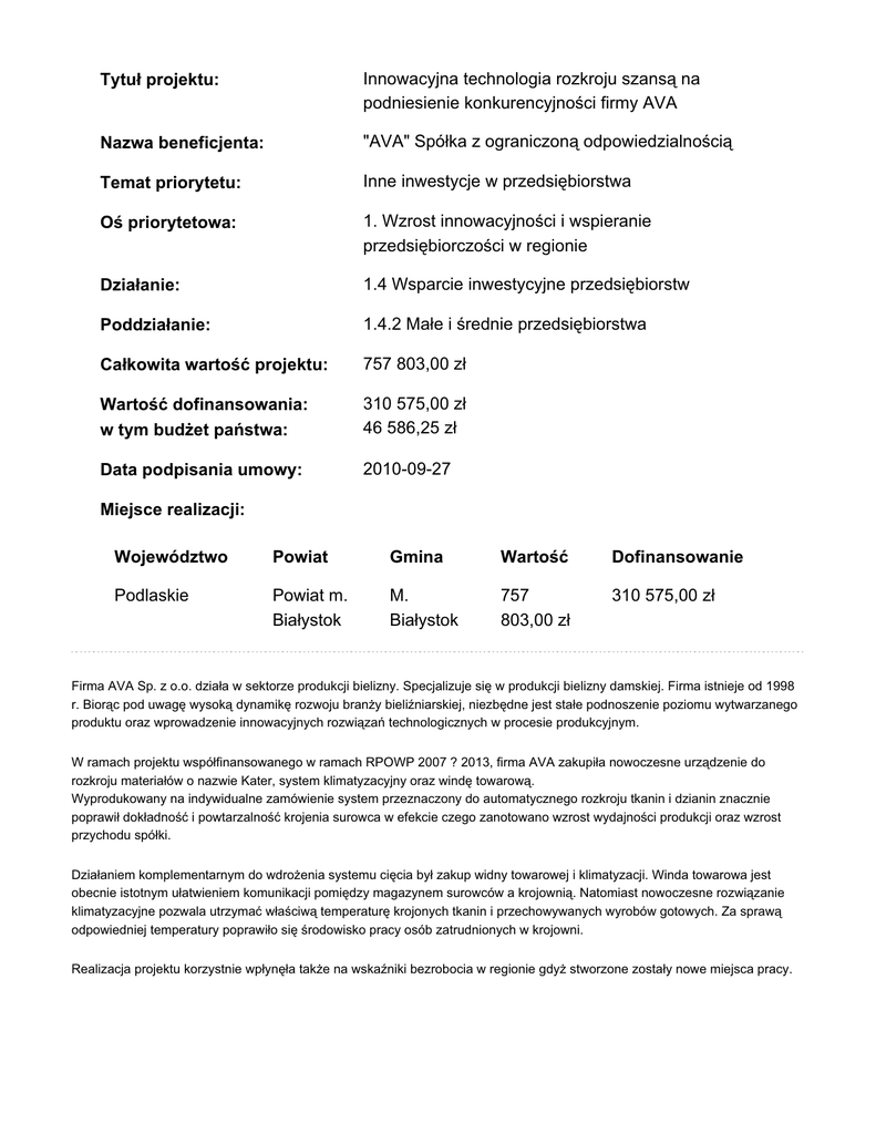 Tytuł projektu: Innowacyjna technologia rozkroju szansą na podniesienie konkurencyjności firmy AVA Nazwa beneficjenta: "AVA" Spółka z ograniczoną odpowiedzialnością Temat priorytetu: Inne inwestycje w przedsiębiorstwa Oś priorytetowa: 1. Wzrost innowacyjności i wspieranie przedsiębiorczości w regionie Działanie: 1.4 Wsparcie inwestycyjne przedsiębiorstw Poddziałanie: 1.4.2 Małe i średnie przedsiębiorstwa Całkowita wartość projektu: 757 803,00 zł Wartość dofinansowania: w tym budżet państwa: 310 575,00 zł 46 586,25 zł Data podpisania umowy: 2010-09-27 Miejsce realizacji: Województwo Powiat Gmina Wartość Dofinansowanie Podlaskie Powiat m. Białystok M. Białystok 757 803,00 zł 310 575,00 zł Firma AVA Sp. z o.o. działa w sektorze produkcji bielizny. Specjalizuje się w produkcji bielizny damskiej. Firma istnieje od 1998 r. Biorąc pod uwagę wysoką dynamikę rozwoju branży bieliźniarskiej, niezbędne jest stałe podnoszenie poziomu wytwarzanego produktu oraz wprowadzenie innowacyjnych rozwiązań technologicznych w procesie produkcyjnym. W ramach projektu współfinansowanego w ramach RPOWP 2007 ? 2013, firma AVA zakupiła nowoczesne urządzenie do rozkroju materiałów o nazwie Kater, system klimatyzacyjny oraz windę towarową. Wyprodukowany na indywidualne zamówienie system przeznaczony do automatycznego rozkroju tkanin i dzianin znacznie poprawił dokładność i powtarzalność krojenia surowca w efekcie czego zanotowano wzrost wydajności produkcji oraz wzrost przychodu spółki. Działaniem komplementarnym do wdrożenia systemu cięcia był zakup widny towarowej i klimatyzacji. Winda towarowa jest obecnie istotnym ułatwieniem komunikacji pomiędzy magazynem surowców a krojownią. Natomiast nowoczesne rozwiązanie klimatyzacyjne pozwala utrzymać właściwą temperaturę krojonych tkanin i przechowywanych wyrobów gotowych. Za sprawą odpowiedniej temperatury poprawiło się środowisko pracy osób zatrudnionych w krojowni. Realizacja projektu korzystnie wpłynęła także na wskaźniki bezrobocia w regionie gdyż stworzone zostały nowe miejsca pracy.
