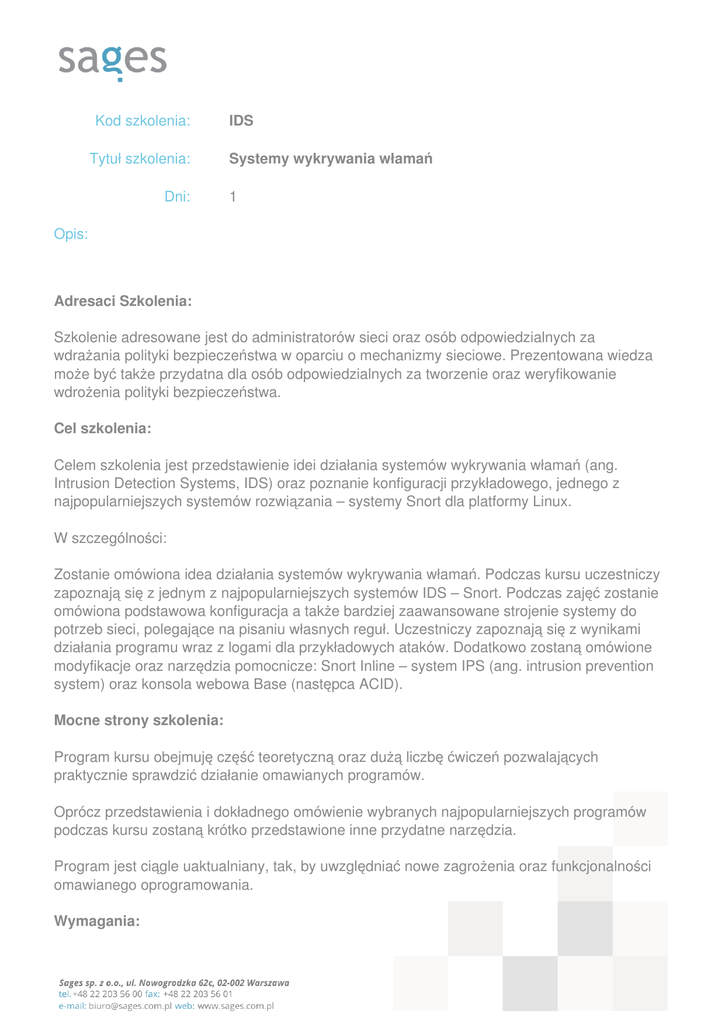 Kod szkolenia: Tytuł szkolenia: Dni: IDS Systemy wykrywania włamań 1 Opis: Adresaci Szkolenia: Szkolenie adresowane jest do administratorów sieci oraz osób odpowiedzialnych za wdrażania polityki bezpieczeństwa w oparciu o mechanizmy sieciowe. Prezentowana wiedza może być także przydatna dla osób odpowiedzialnych za tworzenie oraz weryfikowanie wdrożenia polityki bezpieczeństwa. Cel szkolenia: Celem szkolenia jest przedstawienie idei działania systemów wykrywania włamań (ang. Intrusion Detection Systems, IDS) oraz poznanie konfiguracji przykładowego, jednego z najpopularniejszych systemów rozwiązania – systemy Snort dla platformy Linux. W szczególności: Zostanie omówiona idea działania systemów wykrywania włamań. Podczas kursu uczestniczy zapoznają się z jednym z najpopularniejszych systemów IDS – Snort. Podczas zajęć zostanie omówiona podstawowa konfiguracja a także bardziej zaawansowane strojenie systemy do potrzeb sieci, polegające na pisaniu własnych reguł. Uczestniczy zapoznają się z wynikami działania programu wraz z logami dla przykładowych ataków. Dodatkowo zostaną omówione modyfikacje oraz narzędzia pomocnicze: Snort Inline – system IPS (ang. intrusion prevention system) oraz konsola webowa Base (następca ACID). Mocne strony szkolenia: Program kursu obejmuję część teoretyczną oraz dużą liczbę ćwiczeń pozwalających praktycznie sprawdzić działanie omawianych programów. Oprócz przedstawienia i dokładnego omówienie wybranych najpopularniejszych programów podczas kursu zostaną krótko przedstawione inne przydatne narzędzia. Program jest ciągle uaktualniany, tak, by uwzględniać nowe zagrożenia oraz funkcjonalności omawianego oprogramowania. Wymagania: Od uczestników szkolenia wymagana jest znajomość podstawowych zagadnień związanych z sieciami komputerowymi (podstawowe protokoły i mechanizmy sieciowe, adresacji itp.) oraz podstawowa znajomość konfiguracji aplikacji oraz systemu Linux. Parametry szkolenia: 8 godzin (7 godzin netto) wykładów i ćwiczeń. Wielkość grupy: maks. 8-10 osób. Program szkolenia: 1. Wprowadzenie do zagrożeń sieciowych Podatność/exploit/atak Rodzaje ataków Rekonesans DoS/DDoS Przejęcie kontroli 2. Systemy wykrywania włamań Historia rozwoju systemów wykrywania włamań Omówienie różnego typu zapór ogniowych Porównanie zalet i wad systemów NIDS i HIDS 3. Konfiguracja systemu wykrywania włamań Snort Omówienie podstawowej konfiguracji Zapoznanie się z mechanizmem logowania Wstępny tuning reguł i systemu Mechanizm zmiennych konfiguracyjnych 4. Konfiguracje zaawansowane Omówienie języka reguł systemu Snort Przygotowanie własnych reguł Konfiguracja mechanizmu rozłączenia niebezpiecznych połączeń Powered by TCPDF (www.tcpdf.org)