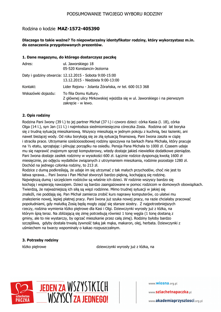 PODSUMOWANIE TWOJEGO WYBORU RODZINY Rodzina o kodzie MAZ-1572-405390 Dlaczego to takie ważne? To niepowtarzalny identyfikator rodziny, który wykorzystasz m.in. do oznaczenia przygotowanych prezentów. 1. Dane magazynu, do którego dostarczysz paczkę Adres: ul. Jaworskiego 18 05-520 Konstancin-Jeziorna Daty i godziny otwarcia: 12.12.2015 - Sobota 9:00-15:00 13.12.2015 - Niedziela 9:00-13:00 Kontakt: Lider Rejonu - Jolanta Żórańska, nr tel. 600 013 368 Wskazówki dojazdu: To filia Domu Kultury. Z głównej ulicy Mirkowskiej wjeżdża się w ul. Jaworskiego i na pierwszym zakręcie - w lewo. 2. Opis rodziny Rodzina Pani Iwony (39 l.) to jej partner Michał (37 l.) i czworo dzieci: córka Kasia (l. 18), córka Olga (14 l.), syn Jan (11 l.) i najmłodsza siedmiomiesięczna córeczka Zosia. Rodzina od lat boryka się z trudną sytuacją mieszkaniową. Wszyscy mieszkają w jednym pokoju z kuchnią, bez łazienki, ani nawet bieżącej wody. Od roku borykają się ze złą sytuacją finansową. Pani Iwona zaszła w ciążę i straciła prace. Utrzymanie sześcioosobowej rodziny spoczywa na barkach Pana Michała, który pracuje na ½ etatu, sprzątając i pilnując porządku na osiedlu. Pensja Pana Michała to 1000 zł. Czasem udaje mu się naprawić znajomym sprzęt komputerowy, wtedy dostaje jakieś niewielkie dodatkowe pieniądze. Pani Iwona dostaje zasiłek rodzinny w wysokości 600 zł. Łącznie rodzice dysponują kwotą 1600 zł miesięcznie, po odjęciu wydatków związanych z utrzymaniem mieszkania, rodzinie pozostaje 1280 zł. Dochód na jednego członka rodziny, to 213 zł. Rodzice z dumą podkreślają, że udaje im się utrzymać z tak małych przychodów, choć nie jest to łatwa sprawa... Pani Iwona i Pan Michał stworzyli bardzo piękną, kochającą się rodzinę. Największą dumą i szczęściem rodziców są właśnie ich dzieci. W rodzinie wszyscy bardzo się kochają i wspierają nawzajem. Dzieci są bardzo zaangażowane w pomoc rodzicom w domowych obowiązkach. Twierdzą, że najważniejszą ich siłą są więzi rodzinne. Mimo trudnej sytuacji w jakiej się znaleźli, nie poddają się. Pan Michał zamierza zrobić kurs naprawy komputerów, co ułatwi mu znalezienie nowej, lepiej płatnej pracy. Pani Iwona już szuka nowej pracy, na razie chciałaby pracować popołudniami, gdy malutką Zosią będą mogły zająć się starsze siostry. Z najpotrzebniejszych rzeczy, rodzina wymienia łóżko piętrowe dla Kasi i Olgi. Dziewczynki wyrosły już z łóżka, na którym śpią teraz. Na zbliżającą się zimę potrzebują również 1 tonę węgla (1 tonę dostaną z gminy, ale to nie wystarczy, by ogrzać mieszkanie przez całą zimę). Rodziny byłoby bardzo szczęśliwa, gdyby dostała trwałą żywność taką jak mąka, makaron, olej, herbata. Dziewczynki z uśmiechem na twarzy wspominały o kakao rozpuszczalnym. 3. Potrzeby rodziny łóżko piętrowe dziewczynki wyrosły już z łóżka, na PODSUMOWANIE TWOJEGO WYBORU RODZINY Rodzina o kodzie MAZ-1572-405390 którym śpią dotychczas PODSUMOWANIE TWOJEGO WYBORU RODZINY Rodzina o kodzie MAZ-1572-405390 węgiel potrzebna jest jeszcze 1 tona, 1 tonę dostaje rodzina z OPS, ale to nie wystarcza na całą zimę żywność szczególnie artykuły o długim terminie przydatności do spożycia - Żywność trwała: Jakich produktów żywnościowych potrzebuje rodzina: Herbata, Kasza, Cukier, Konserwy mięsne, Kawa, Makaron, Olej, Konserwy rybne, Ryż, Mąka, Dżem, Warzywa w puszkach Produkty dla niemowląt: Mleko BEBIKO 2 Inne produkty żywnościowe: Kakao rozpuszczalne - Środki czystości Jakich środków czystości potrzebuje rodzina: Proszek do prania, Płyn do mycia naczyń, Mydło/żel myjący, Pasta do zębów, Płyny czyszczące, Szampon, Szczoteczka do zębów Artykuły dziecięce: Pieluszki jednorazowe 4-9 kg i większe, chusteczki nawilżone - Odzież Olga Rodzaj odzieży: zimowe Kategoria: kurtka Rozmiar: 164/S Sylwetka: b. szczupła Uwagi: długa kurtka, kolor khaki Jan Rodzaj odzieży: przejściowe Kategoria: spodnie Rozmiar: 156 Sylwetka: b. szczupły Uwagi: spodnie dresowe ze ściągaczami przy nogawkach i w pasie Kasia Rodzaj odzieży: przejściowe Kategoria: bluza PODSUMOWANIE TWOJEGO WYBORU RODZINY Rodzina o kodzie MAZ-1572-405390 Rozmiar: S/M Sylwetka: szczupła Uwagi: kolor czarny z napisami - Obuwie Jan Rodzaj obuwia: zimowe Kategoria: buty sportowe za kostkę Rozmiar: 38 Uwagi: ciemne, bez pasków Jan Rodzaj obuwia: przejściowe Kategoria: tenisówki Rozmiar: 38 Uwagi: obuwie do szkoły Kasia Rodzaj obuwia: przejściowe Kategoria: buty sportowe Rozmiar: 40 Uwagi: pastelowe kolory Olga Rodzaj obuwia: przejściowe Kategoria: buty sportowe Rozmiar: 39 Uwagi: jasne kolory Iwona Rodzaj obuwia: zimowe Kategoria: kozaki Rozmiar: 40 Uwagi: czarne Michał PODSUMOWANIE TWOJEGO WYBORU RODZINY Rodzina o kodzie MAZ-1572-405390 Rodzaj obuwia: przejściowe Kategoria: buty sportowe Rozmiar: 46 Uwagi: ciemne - Pomoce szkolne Jakich pomocy szkolnych potrzebuje rodzina? Zeszyty, Przybory do pisania - Wyposażenie mieszkania Jakiego wyposażenia mieszkania potrzebuje rodzina: Pościel, Poduszka Inne: Rozmiar pościeli 160 x 200 Brakujące sprzęty: Łóżko piętrowe wraz z materacami dla starszych córek (może być używane), napełniona butla gazowa 11 kg. - Inne potrzeby Opał (węgiel) 1 tona. - Specjalne upominki Mama prosi o chodzik dla najmłodszego dziecka , Janek bardzo chciałby dostać grę komputerową H1Z1, Olga marzy na bluzkę ze strony www.Vinted.pl (art. nr 8131337), Kasia chciałaby głośnik do telefonu, mama marzy o słodkich perfumach, a tata o zestawie do golenia Gilette. 4. Osoby opiekujące sie rodziną - Wolontariusz opiekun rodziny E-mail: [email protected] Telefon: 602650545 - Lider Rejonu Imię i nazwisko: Jolanta Żórańska 5. Jak jeszcze możemy Ci pomóc? Przekazujemy praktyczne wskazówki w przygotowaniu paczki. * Paczki możesz dostarczyć wyłącznie do tego magazynu, z którego wybran