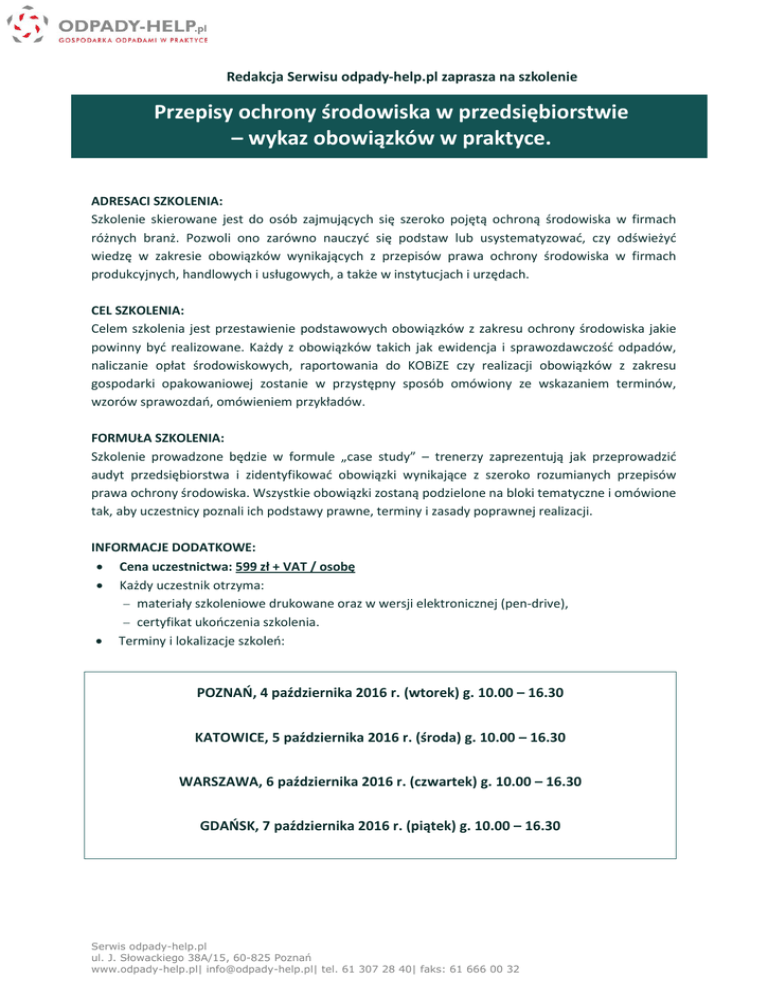 Redakcja Serwisu odpady-help.pl zaprasza na szkolenie Przepisy ochrony środowiska w przedsiębiorstwie – wykaz obowiązków w praktyce. ADRESACI SZKOLENIA: Szkolenie skierowane jest do osób zajmujących się szeroko pojętą ochroną środowiska w firmach różnych branż. Pozwoli ono zarówno nauczyć się podstaw lub usystematyzować, czy odświeżyć wiedzę w zakresie obowiązków wynikających z przepisów prawa ochrony środowiska w firmach produkcyjnych, handlowych i usługowych, a także w instytucjach i urzędach. CEL SZKOLENIA: Celem szkolenia jest przestawienie podstawowych obowiązków z zakresu ochrony środowiska jakie powinny być realizowane. Każdy z obowiązków takich jak ewidencja i sprawozdawczość odpadów, naliczanie opłat środowiskowych, raportowania do KOBiZE czy realizacji obowiązków z zakresu gospodarki opakowaniowej zostanie w przystępny sposób omówiony ze wskazaniem terminów, wzorów sprawozdań, omówieniem przykładów. FORMUŁA SZKOLENIA: Szkolenie prowadzone będzie w formule „case study” – trenerzy zaprezentują jak przeprowadzić audyt przedsiębiorstwa i zidentyfikować obowiązki wynikające z szeroko rozumianych przepisów prawa ochrony środowiska. Wszystkie obowiązki zostaną podzielone na bloki tematyczne i omówione tak, aby uczestnicy poznali ich podstawy prawne, terminy i zasady poprawnej realizacji. INFORMACJE DODATKOWE: Cena uczestnictwa: 599 zł + VAT / osobę Każdy uczestnik otrzyma: materiały szkoleniowe drukowane oraz w wersji elektronicznej (pen-drive), certyfikat ukończenia szkolenia. Terminy i lokalizacje szkoleń: POZNAŃ, 4 października 2016 r. (wtorek) g. 10.00 – 16.30 KATOWICE, 5 października 2016 r. (środa) g. 10.00 – 16.30 WARSZAWA, 6 października 2016 r. (czwartek) g. 10.00 – 16.30 GDAŃSK, 7 października 2016 r. (piątek) g. 10.00 – 16.30 Serwis odpady-help.pl ul. J. Słowackiego 38A/15, 60-825 Poznań www.odpady-help.pl| [email protected]| tel. 61 307 28 40| faks: 61 666 00 32 PROGRAM SZKOLENIA BLOK I – GOSPODARKA ODPADAMI 10.00 – 11.30 11.30 – 11.45 Klasyfikacja odpadów (odpady niebezpieczne, odpady komunalne) – praktyczne interpretacje oraz najczęstsze błędy. Kiedy odpady można przekazywać przedsiębiorstwom, a kiedy osobom fizycznym – przeniesienie odpowiedzialności za odpady. Jak i gdzie można magazynować odpady? Jakie decyzje powinien uzyskać wytwórca odpadów wg nowej ustawy o odpadach? Zasady ewidencji odpadów – kto i jak powinien ją prowadzić? Zasady poprawnego wystawiania KPO i prowadzenia KEO. Jakich danych żądać od odbiorców odpadów? Zwolnienia z ewidencji odpadów i ewidencja uproszczona. Jak poprawnie wypełnić formularz zbiorczego zestawienia o odpadach dla UM? Kary za nieprzestrzeganie przepisów dotyczących odpadów. Przerwa kawowa BLOK II – EMISJE ZANIECZYSZCZEŃ DO ATMOSFERY 11.45 – 13.00 13.00 – 13.45 Jak sprawdzić, czy w naszym zakładzie występuje emisja i jakich regulacji wymaga? Kto powinien naliczać opłaty środowiskowe? Zmiany w opłatach środowiskowych od 2017 r. – kogo dotyczą, jak będą składane sprawozdania? Rewolucja w systemie naliczania opłat środowiskowych od 2019 r. – zmiany terminów i sposobu naliczania opłat. Zwolnienia z opłat, opłaty podwyższone, zaległe opłaty i odsetki. Raport do KOBiZE – czy każda emisja wymaga raportowania? Rejestracja i raportowanie do KOBiZE zgodnie z projektowanym rozporządzeniem w sprawie zakresu raportu! Raport KOBIZE, a sprawozdania opłatowe do UM - jak są powiązane? Pozwolenie emisyjne i zgłoszenia – kogo dotyczą, jak sprawdzić czy są wymagane w naszym przypadku? CRO - nowy obowiązek właścicieli klimatyzatorów i urządzeń chłodniczych. Kary w za brak realizacji obowiązków względem emisji do powietrza. Przerwa obiadowa BLOK III – GOSPODARKA OPAKOWANIOWA 13.45 – 15.15 15.15 – 15.30 Czym jest opakowanie wg nowej ustawy, jakie wyróżniamy rodzaje opakowań? Nowe zasady rozliczania opakowań wielomateriałowych i po środkach niebezpiecznych. Jakie obowiązki mają producenci, importerzy i eksporterzy opakowań i produktów w opakowaniach? Jak realizować obowiązek odzysku / recyklingu w celu uniknięcia opłaty produktowej oraz publicznych kampanii edukacyjnych? Zwolnienia z obowiązku odzysku i recyklingu - pomoc de minimis – zmiany od 2017 r. Współpraca z organizacjami odzysku opakowań i izbami gospodarczymi – jakie obowiązki można im przekazać? Ewidencja opakowań – obowiązek przedsiębiorcy, a nie organizacji odzysku. Sprawozdawczość do urzędu marszałkowskiego. Kary w gospodarce opakowaniowej. Przerwa kawowa BLOK IV – GOSPODARKA WODNO-ŚCIEKOWA 15.30 – 16.30 Kto powinien posiadać pozwolenie wodnoprawne, a kto zgłoszenie? Jakich ścieków nie wolno odprowadzać do wód lub do ziemi? Jakie obowiązki ma właściciel separatora? Kiedy trzeba prowadzić badania wody i ścieków? Obowiązki w przypadku wprowadzania ścieków do kanalizacji. Opłaty środowiskowe za pobór wód, odprowadzanie ścieków bytowych, przemysłowych, wód opadowych. Dodatkowo w programie: Kalendarz specjalisty – terminy obowiązków na lata 2017 / 2018 Kontrole WIOŚ/ UM/ starosty – jak się przygotować do kontroli, prawa i obowiązki. PRELEGENT: Marta Stachowiak - Absolwentka Wydziału Rolnictwa i Bioinżynierii Uniwersytetu Przyrodniczego w Poznaniu na kierunku ochrona środowiska. Specjalista w zakresie prawa emisyjnego, ochrony powietrza i ocen oddziaływania przedsięwzięć na środowisko. Prelegentka na szkoleniach z zakresu prawnych aspektów ochrony środowiska (pozwolenia emisyjne, KOBIZE, opłaty środowiskowe, ewidencja i sprawozdawczość odpadów). Na co dzień pracuje w biurze ochrony środowiska prowadząc postępowania administracyjne oraz rozliczając obowiązki ewidencyjne i sprawozdawcze przedsiębiorców w ochronie środowiska wobec organów administracji publicznej. Autorka newslettera oraz porad dotyczących stosowan