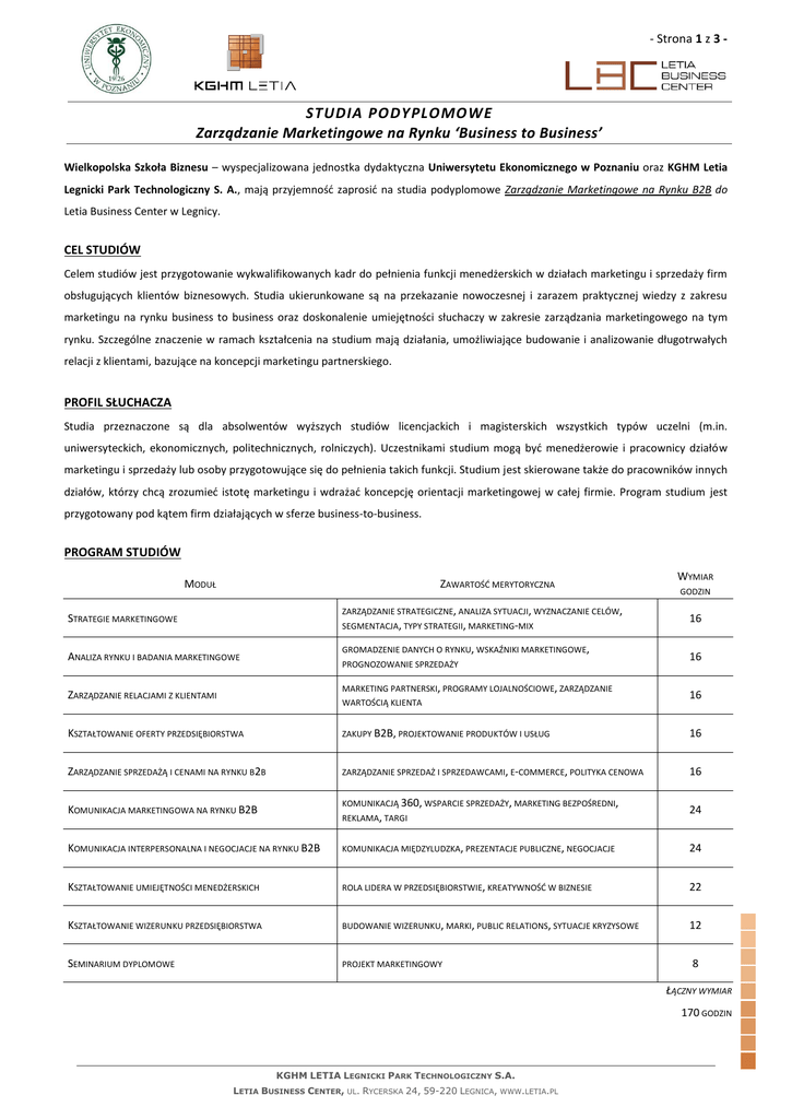 - Strona 1 z 3 - STUDIA PODYPLOMOWE Zarządzanie Marketingowe na Rynku ‘Business to Business’ Wielkopolska Szkoła Biznesu – wyspecjalizowana jednostka dydaktyczna Uniwersytetu Ekonomicznego w Poznaniu oraz KGHM Letia Legnicki Park Technologiczny S. A., mają przyjemność zaprosić na studia podyplomowe Zarządzanie Marketingowe na Rynku B2B do Letia Business Center w Legnicy. CEL STUDIÓW Celem studiów jest przygotowanie wykwalifikowanych kadr do pełnienia funkcji menedżerskich w działach marketingu i sprzedaży firm obsługujących klientów biznesowych. Studia ukierunkowane są na przekazanie nowoczesnej i zarazem praktycznej wiedzy z zakresu marketingu na rynku business to business oraz doskonalenie umiejętności słuchaczy w zakresie zarządzania marketingowego na tym rynku. Szczególne znaczenie w ramach kształcenia na studium mają działania, umożliwiające budowanie i analizowanie długotrwałych relacji z klientami, bazujące na koncepcji marketingu partnerskiego. PROFIL SŁUCHACZA Studia przeznaczone są dla absolwentów wyższych studiów licencjackich i magisterskich wszystkich typów uczelni (m.in. uniwersyteckich, ekonomicznych, politechnicznych, rolniczych). Uczestnikami studium mogą być menedżerowie i pracownicy działów marketingu i sprzedaży lub osoby przygotowujące się do pełnienia takich funkcji. Studium jest skierowane także do pracowników innych działów, którzy chcą zrozumieć istotę marketingu i wdrażać koncepcję orientacji marketingowej w całej firmie. Program studium jest przygotowany pod kątem firm działających w sferze business-to-business. PROGRAM STUDIÓW MODUŁ ZAWARTOŚĆ MERYTORYCZNA ZARZĄDZANIE STRATEGICZNE, ANALIZA SYTUACJI, WYZNACZANIE CELÓW, STRATEGIE MARKETINGOWE SEGMENTACJA, TYPY STRATEGII, MARKETING-MIX GROMADZENIE DANYCH O RYNKU, WSKAŹNIKI MARKETINGOWE, ANALIZA RYNKU I BADANIA MARKETINGOWE PROGNOZOWANIE SPRZEDAŻY MARKETING PARTNERSKI, PROGRAMY LOJALNOŚCIOWE, ZARZĄDZANIE ZARZĄDZANIE RELACJAMI Z KLIENTAMI WARTOŚCIĄ KLIENTA WYMIAR GODZIN 16 16 16 KSZTAŁTOWANIE OFERTY PRZEDSIĘBIORSTWA ZAKUPY B2B, PROJEKTOWANIE PRODUKTÓW I USŁUG 16 ZARZĄDZANIE SPRZEDAŻĄ I CENAMI NA RYNKU B2B ZARZĄDZANIE SPRZEDAŻ I SPRZEDAWCAMI, E-COMMERCE, POLITYKA CENOWA 16 KOMUNIKACJĄ 360, WSPARCIE SPRZEDAŻY, MARKETING BEZPOŚREDNI, KOMUNIKACJA MARKETINGOWA NA RYNKU B2B REKLAMA, TARGI 24 KOMUNIKACJA INTERPERSONALNA I NEGOCJACJE NA RYNKU B2B KOMUNIKACJA MIĘDZYLUDZKA, PREZENTACJE PUBLICZNE, NEGOCJACJE 24 KSZTAŁTOWANIE UMIEJĘTNOŚCI MENEDŻERSKICH ROLA LIDERA W PRZEDSIĘBIORSTWIE, KREATYWNOŚĆ W BIZNESIE 22 KSZTAŁTOWANIE WIZERUNKU PRZEDSIĘBIORSTWA BUDOWANIE WIZERUNKU, MARKI, PUBLIC RELATIONS, SYTUACJE KRYZYSOWE 12 SEMINARIUM DYPLOMOWE PROJEKT MARKETINGOWY 8 ŁĄCZNY WYMIAR 170 GODZIN KGHM LETIA LEGNICKI PARK TECHNOLOGICZNY S.A. LETIA BUSINESS CENTER, UL. RYCERSKA 24, 59-220 LEGNICA, WWW.LETIA.PL - Strona 2 z 3 WYKŁADOWCY Zajęcia w ramach studiów są prowadzone przez doświadczonych wykładowców Uniwersytetu Ekonomicznego w Poznaniu. Do prowadzenia zajęć dobrane są wyłącznie osoby, które łączą pracę akademicką ze współpracą z biznesem w charakterze doradców, ekspertów, trenerów lub równolegle prowadzą własne firmy. Dzięki temu posiadają umiejętność przekładania wiedzy teoretycznej na praktyczne rozwiązania w zakresie marketingu business-to-business. Prowadzący zajęcia są regularnie poddawani ocenie, co pozwala utrzymać wysoki poziom korzyści dla uczestników studiów. METODYKA STUDIÓW Studia bazują na zajęciach warsztatowych, podczas których analizowane są działania firmy z rynku B2B, dyskusjach, wykładach, grupowym i indywidualnym rozwiązywaniu problemów oraz warsztatach komputerowych. Część zajęć o charakterze teoretycznym może być prowadzona w formie e-learningu (nie więcej niż 15% modułu). WARUNKI ZALICZENIA STUDIÓW Ukończenie studiów jest możliwe po spełnieniu następujących wymogów: zaliczenie przedmiotów, które nie kończą się egzaminami, zdanie egzaminów elektronicznych z przedmiotów: Strategie marketingowe, Zarządzanie relacjami z klientami, Komunikacja marketingowa, Kształtowanie oferty przedsiębiorstwa, Analiza rynku i badania marketingowe, osobiste zaprezentowanie projektu wykonanego w ramach seminarium. SEMINARIUM DYPLOMOWE W trakcie seminarium uczestnicy studiów opracowują przykładowe projekty marketingowe np. wyznaczenie strategii marketingowej, opracowanie programu lojalnościowego, dokonanie oceny efektywności działań promocyjnych. Celem seminarium jest opracowanie projektu biznesowego, który będzie oceniany na egzaminie końcowym. Projekt dotyczy rozwiązania problemu marketingowego w przedsiębiorstwie wybranym przez uczestników studiów. Seminarium jest prowadzone w formie e-learningu. KORZYŚCI UKOŃCZENIA STUDIÓW Umiejętność planowania strategii marketingowej z uwzględnieniem specyficznych działań kierowanych do klientów biznesowych; Wiedza na temat najnowszych koncepcji zarządzania marketingowego B2B, szczególnie nawiązywania i umacniania relacji z klientami biznesowymi; Kompetencje menadżerskie w zakresie przywództwa, pracy kreatywnej, negocjacji, prezentacji publicznych, analizy danych; Wsparcie zmiany pozycji zawodowej – badania wśród absolwentów wskazują, że 36% zmieniło pracę na lepszą, 43% wykonuje ważniejsze zadania, a płaca wzrosła przeciętnie o 37%*. * (W lipcu 2014 roku w stosunku do okresu przed studiami; wyniki badania losów absolwentów Studiów Podyplomowych Zarządzanie Marketingowe na Rynku B2B, lipiec 2014, n=51). ATUTY STUDIÓW dyplom prestiżowej uczelni publicznej, doskonała jakość zajęć, dostępność materiałów do zajęć oraz ocen z egzaminów na platformie e-learningu, doświadczeni Wykładowcy, aktywne metody zajęć, angażujące uczestników warsztaty i treningi umiejętności, promocyjna cena i dogodny dla słuchacza system płatności, dogodne godziny zajęć, pr