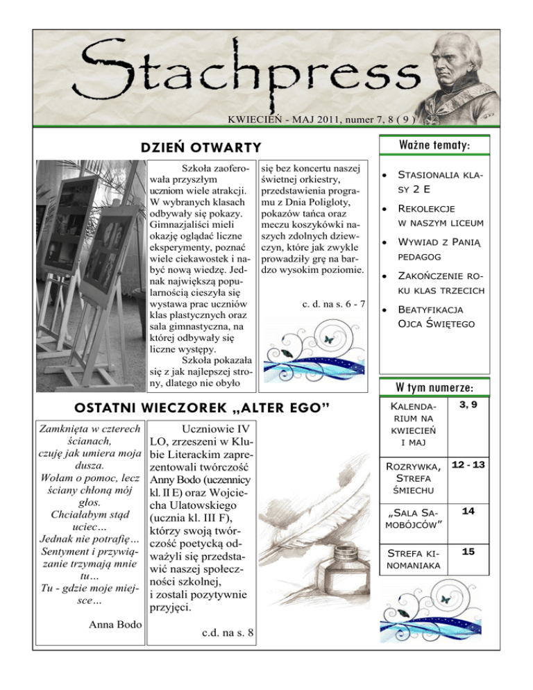 KWIECIEŃ - MAJ 2011, numer 7, 8 ( 9 ) Ważne tematy: DZIEŃ OTWARTY Szkoła zaoferowała przyszłym uczniom wiele atrakcji. W wybranych klasach odbywały się pokazy. Gimnazjaliści mieli okazję oglądać liczne eksperymenty, poznać wiele ciekawostek i nabyć nową wiedzę. Jednak największą popularnością cieszyła się wystawa prac uczniów klas plastycznych oraz sala gimnastyczna, na której odbywały się liczne występy. Szkoła pokazała się z jak najlepszej strony, dlatego nie obyło się bez koncertu naszej świetnej orkiestry, przedstawienia programu z Dnia Poligloty, pokazów tańca oraz meczu koszykówki naszych zdolnych dziewczyn, które jak zwykle prowadziły grę na bardzo wysokim poziomie. STASIONALIA SY 2 E REKOLEKCJE W NASZYM LICEUM WYWIAD RO- KU KLAS TRZECICH c. d. na s. 6 - 7 BEATYFIKACJA OJCA ŚWIĘTEGO W tym numerze: Uczniowie IV LO, zrzeszeni w Klubie Literackim zaprezentowali twórczość Anny Bodo (uczennicy kl. II E) oraz Wojciecha Ulatowskiego (ucznia kl. III F), którzy swoją twórczość poetycką odważyli się przedstawić naszej społeczności szkolnej, i zostali pozytywnie przyjęci. KWIECIEŃ c.d. na s. 8 PANIĄ ZAKOŃCZENIE KALENDA- Anna Bodo Z PEDAGOG OSTATNI WIECZOREK „ALTER EGO” Zamknięta w czterech ścianach, czuję jak umiera moja dusza. Wołam o pomoc, lecz ściany chłoną mój głos. Chciałabym stąd uciec… Jednak nie potrafię… Sentyment i przywiązanie trzymają mnie tu… Tu - gdzie moje miejsce… KLA- 3, 9 RIUM NA I MAJ ROZRYWKA, 12 - 13 STREFA ŚMIECHU „SALA SAMOBÓJCÓW” 14 STREFA 15 KI- NOMANIAKA STACHPRESS ZESPÓŁ REDAKCYJNY Opiekun gazetki Pani Beata Kuzko Udostępnianie pracowni i sprzętu informatycznego Pani Magdalena Nowosielska Pan Sebastian Biesiada Wydruk gazetki Pan Jarosław Jednas Oprawa graficzna Magdalena Czajka Artykuły prasowe Magdalena Czajka (2 b) Maciej Dec (1 f) Weronika Frankiewicz (1 d) Agnieszka Kłonica (1 b) Vanessa Koczkodon (2 b) Paulina Musianek (2 b) Patrycja Radzikowska (1 b) Ewelina Syrytczyk (2 b) Magda Szymańska (2 b) Sylwia Wolna (1 b) Wywiady Magdalena Czajka (2 b) Weronika Frankiewicz (1 d) Vanessa Koczkodon (2 b) Fotografia Paulina Musianek (2 b) Natalia Wasiluk (1 b) Rozrywka Maja Raczkowska (2 b) Kontakt: Nasz adres: IV LO im. Stanisława Staszica ul. Akademicka 8a 21 - 500 Biała Podlaska e-mail gazetki: [email protected] Strona szkoły: staszicbiala.pl REKOLEKCJE W STASZICU Dnia 7 kwietnia 2011 r. o godzinie 8:30 na hali sportowej IV LO im. Stanisława Staszica odbyło się nabożeństwo rekolekcyjne. Uczniowie naszego liceum przybyli na tę uroczystość, zajmując miejsca na trybunach. Obecne również było grono pedagogiczne. Każdy, kto czuł potrzebę, mógł przystąpić do sakramentu pokuty. Przygotowaniem tego wydarzenia zajęli się wikariusze uczący w naszej szkole - ks. Krzysztof Danieluk i ks. Łukasz Kulik. Podczas mszy świętej czynny udział brał chór szkolny, przygotowany do tego dnia przez pana prof. Mieczysława Zielińskiego. W trakcie Eucharystii służba liturgiczna, na którą złożyli się chętni uczniowie, czytała fragment Pisma Świętego oraz modlitwę wiernych. Psalm zaśpiewała Sylwia Klimczuk z klasy II c. Obecni również byli ministranci. Posługę tę pełnili uczniowie z naszej szkoły. Duchowny, który prowadził uroczystość, Wojciech Hackiewicz, wygłosił bardzo ciekawe i pouczające kazanie związane z życiem współczesnej młodzieży. Uwrażliwiał do wierności Bogu i ojczyźnie. Agnieszka Kłonica Sylwia Wolna ZAKOŃCZENIE ROKU KLAS TRZECICH 29 kwietnia 2011 roku o godzinie 11:45 na hali sportowej IV LO im. Stanisława Staszica odbyło się uroczyste zakończenie roku szkolnego klas III z udziałem dyrekcji szkoły, grona pedagogicznego, w szczególności wychowawców klas maturalnych, przedstawicieli Rady Rodziców, Samorządu Uczniowskiego oraz pracowników szkoły. Uroczystość uświetniła część artystyczna (słowno - muzyczna) przygotowana przez pana Piotra Kalisza, Mieczysława Zielińskiego oraz główną panią reżyser - Henrykę Czarnacką. Podczas akademii dokonano przekazania sztandaru następcom z klas drugich, wręczono świadectwa z biało - czerwonym paskiem, nagrody i wyróżnienia za dobre wyniki w nauce, stuprocentową frekwencję, udział w kołach zainteresowań, konkursach, olimpiadach, wystąpieniach publicznych, reprezentowaniu szkoły oraz zawodach sportowych. Szczególną nagrodę wręczył pan dyrektor Waldemar Mazur dwóm uczniom wytypowanym przez dyrekcję, grono pedagogiczne, SU i wychowawców. Jest to medal Mistrza Postawy Staszicowskiej przyznawany w klasie maturalnej osobie, wykazującej się szczególną pracą na rzecz szkoły i samego siebie. To wyjątkowe wyróżnienie otrzymali: - Paulina Szarek z klasy III a, wychowanka pani prof. Małgorzaty Górak - Tomasz Ciemlicki z klasy III c, wychowanek pani prof. Bożeny Kłoczewskiej W pożegnaniu klas maturalnych nie obyło się bez nostalgii, wspomnień, refleksji i łez… Magdalena Czajka Str. 2 KWIECIEŃ - MAJ 2011, numer 7, 8 (9) KWIETNIOWE KALENDARIUM Pn. 4 Wt. 5 Śr. 6 Święto Wojsko- Dzień Leśnika wej Służby i Drzewiarza Zdrowia, Dzień Trzeźwości, Międzynarodowy Dzień Wiedzy o Minach i Działań Zapobiegających Minom (ONZ) Czw. Pt. So. 1 2 Prima aprilis, Międzynarodowy Dzień Ptaków Międzynarodowy Dzień Książki dla Dzieci 7 8 9 Światowy Dzień Zdrowia (ONZ), Dzień Pamięci o Holokauście Międzynarodowy Dzień Romów 15 Nd. 3 10 Dzień Służby Zdrowia 11 12 13 14 Światowy Dzień Osób z Chorobą Parkinsona, Dzień Radia, Ogólnopolski Dzień Walki z Bezrobociem Międzynarodowy Dzień Lotnictwa i Kosmonautyki, Dzień czekolady Światowy Dzień Pamięci Ofiar Katynia Dzień Ludzi Bez- Międzynarodowy Święto Sapera domnych Dzień Kombatanta Niedziela Palmowa 18 19 20 21 22 23 24 Międzynarodowy Dzień Wolnej Prasy Wielki Czwartek Wielki Piątek, Dzień Ziemi Wielka Sobota, Światowy Dzień Książki i Praw Au