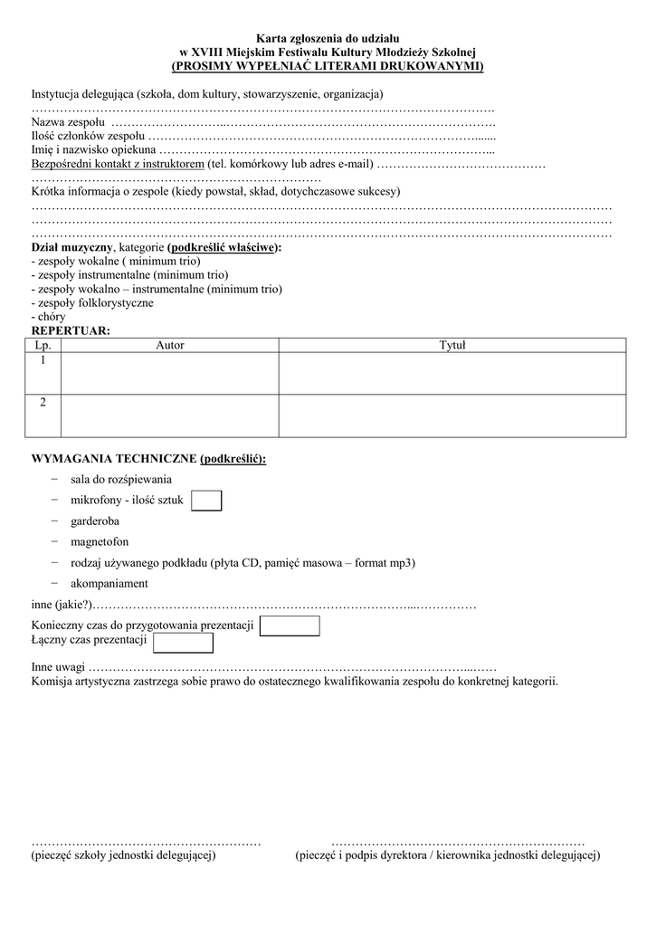 Karta zgłoszenia do udziału w XVIII Miejskim Festiwalu Kultury Młodzieży Szkolnej (PROSIMY WYPEŁNIAĆ LITERAMI DRUKOWANYMI) Instytucja delegująca (szkoła, dom kultury, stowarzyszenie, organizacja) ……………………………………………………………………………………………………. Nazwa zespołu ………………………..…………………………………………………………. Ilość członków zespołu ………………………………………………………………………....... Imię i nazwisko opiekuna ………………………………………………………………………... Bezpośredni kontakt z instruktorem (tel. komórkowy lub adres e-mail) …………………………………… ……………………………………………………………… Krótka informacja o zespole (kiedy powstał, skład, dotychczasowe sukcesy) ……………………………………………………………………………………………………………………………… ……………………………………………………………………………………………………………………………… ……………………………………………………………………………………………………………………………… Dział muzyczny, kategorie (podkreślić właściwe): - zespoły wokalne ( minimum trio) - zespoły instrumentalne (minimum trio) - zespoły wokalno – instrumentalne (minimum trio) - zespoły folklorystyczne - chóry REPERTUAR: Lp. Autor Tytuł 1 2 WYMAGANIA TECHNICZNE (podkreślić): − sala do rozśpiewania − mikrofony - ilość sztuk − garderoba − magnetofon − rodzaj używanego podkładu (płyta CD, pamięć masowa – format mp3) − akompaniament inne (jakie?)……………………………………………………………………...…………… Konieczny czas do przygotowania prezentacji Łączny czas prezentacji Inne uwagi …………………………………………………………………………………...…… Komisja artystyczna zastrzega sobie prawo do ostatecznego kwalifikowania zespołu do konkretnej kategorii. ………………………………………………… (pieczęć szkoły jednostki delegującej) ……………………………………………………… (pieczęć i podpis dyrektora / kierownika jednostki delegującej)