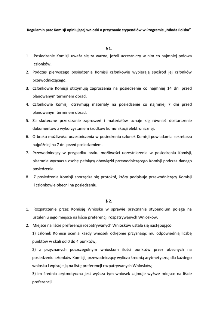 Regulamin prac Komisji opiniującej wnioski o przyznanie stypendiów w Programie „Młoda Polska” § 1. 1. Posiedzenie Komisji uważa się za ważne, jeżeli uczestniczy w nim co najmniej połowa członków. 2. Podczas pierwszego posiedzenia Komisji członkowie wybierają spośród jej członków przewodniczącego. 3. Członkowie Komisji otrzymują zaproszenia na posiedzenie co najmniej 14 dni przed planowanym terminem obrad. 4. Członkowie Komisji otrzymują materiały na posiedzenie co najmniej 7 dni przed planowanym terminem obrad. 5. Za skuteczne przekazanie zaproszeń i materiałów uznaje się również dostarczenie dokumentów z wykorzystaniem środków komunikacji elektronicznej. 6. O braku możliwości uczestniczenia w posiedzeniu członek Komisji powiadamia sekretarza najpóźniej na 7 dni przed posiedzeniem. 7. Przewodniczący w przypadku braku możliwości uczestniczenia w posiedzeniu Komisji, pisemnie wyznacza osobę pełniącą obowiązki przewodniczącego Komisji podczas danego posiedzenia. 8. Z posiedzenia Komisji sporządza się protokół, który podpisuje przewodniczący Komisji i członkowie obecni na posiedzeniu. § 2. 1. Rozpatrzenie przez Komisję Wniosku w sprawie przyznania stypendium polega na ustaleniu jego miejsca na liście preferencji rozpatrywanych Wniosków. 2. Miejsce na liście preferencji rozpatrywanych Wniosków ustala się następująco: 1) członek Komisji ocenia każdy wniosek odrębnie przyznając mu odpowiednią liczbę punktów w skali od 0 do 4 punktów; 2) z przyznanych poszczególnym wnioskom ilości punktów przez obecnych na posiedzeniu członków Komisji, przewodniczący wylicza średnią arytmetyczną dla każdego wniosku i wpisuje ją na listę preferencji rozpatrywanych Wniosków; 3) im średnia arytmetyczna jest wyższa tym wniosek zajmuje wyższe miejsce na liście preferencji. 3. Formułując własną ocenę wniosku, o której mowa w pkt 1, członek Komisji bierze pod uwagę następujące elementy: 1) dotychczasowe osiągnięcia twórcze Wnioskodawcy; 2) wartość artystyczną projektu stypendialnego; 3) jakość rekomendacji; 4) znaczenie realizacji projektu stypendialnego 4. Do protokołu mogą zostać zgłoszone dodatkowe uwagi i rekomendacje poszczególnych członków Komisji. § 3. 1. Rozstrzygnięcia Komisji podejmowane są w głosowaniu jawnym, większością głosów członków obecnych na posiedzeniu. 2. W przypadku równej liczby głosów decyduje głos przewodniczącego. 3. Członków Komisji obowiązuje bezstronność wobec każdego z opiniowanych wniosków. 4. Członkiem Komisji nie może być osoba przystępująca do konkursu albo będąca małżonkiem takiej osoby lub jej krewnym albo powinowatym, albo pozostająca wobec niej w takim stosunku prawnym lub faktycznym, że może to budzić uzasadnione wątpliwości co do jej obiektywizmu i bezstronności. 5. Przepisy ust. 1-4 stosuje się odpowiednio do rozstrzygnięć Komisji podejmowanych w trybie obiegowym. § 4. 1. Pracami Komisji kieruje przewodniczący, przy pomocy sekretarza, w osobie pracownika Narodowego Centrum Kultury nie będącego członkiem Komisji. 2. W razie nieobecności przewodniczącego jego obowiązki pełni inny członek Komisji upoważniony pisemnie przez przewodniczącego. 3. Do obowiązków przewodniczącego należy: 1) prowadzenie posiedzeń; 2) podawanie koncepcji i wniosków pod głosowanie; 3) akceptowanie protokołów z posiedzeń; 4) rozstrzyganie kwestii spornych. 4. Do obowiązków sekretarza należy: 1) zawiadamianie o terminach posiedzeń i porządku obrad; 2) sporządzanie protokołów z posiedzeń i przedstawianie ich do akceptacji przewodniczącemu; 3) organizowanie spraw proceduralnych (w tym przygotowanie materiałów na posiedzenia) oraz zapewnienie przepływu informacji między Komisją a komórką organizacyjną Ministerstwa Kultury i Dziedzictwa Narodowego, właściwą w sprawach prowadzenia zadań związanych z przyznawaniem przez Ministra stypendiów twórczych i stypendiów na przedsięwzięcia związane z upowszechnianiem kultury. 5. Sekretarz nie bierze udziału w głosowaniach.