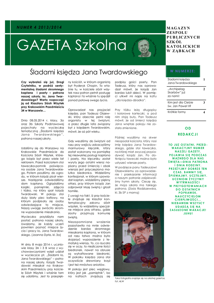 N U ME R 4 2 0 1 3 / 2 0 1 4 V O L UM E 1 , I SS UE 1 GAZETA Szkolna Śladami księdza Jana Twardowskiego Czy wybrałeś się już, Drogi Czytelniku, w podróż sentymentalną śladami skromnego kapłana i poety – patrona naszej szkoły, ks. Jana Twardowskiego? Warto rozpocząć ją od Klasztoru Sióstr Wizytek przy Krakowskim Przedmieściu 34 w Warszawie… Dnia 08.05.2014 r. klasy, 3a oraz 3b Szkoły Podstawowej pojechały na w ycieczkę tematyczną „Śladami księdza Ja n a Tw ar d o w s k i e go ”, patrona naszej szkoły. Udaliśmy się do Warszawy na Krakowskie Przedmieście do Kościoła Sióstr Wizytek, którego ksiądz był przez wiele lat rektorem. Przed kościołem stoi ławeczka-pomnik poświęcona osobie Jana Twardowskiego. Potem poszliśmy do ogrodu, w którym ksiądz pisał wiersze. Następnie odwiedziliśmy dom kapłana. Oglądaliśmy książki, pamiętniki, zdjęcia i łóżko, na który spał ksiądz Twardowski. W pokoju stoi duży biały piec kaflowy, na którym podpisały się osoby odwiedzające to miejsce. Naszą uwagę zwróciło skromne wyposażenie mieszkania. Wycieczka przybliżyła nam postać patrona naszej szkoły. Uważamy, że każdy uczeń powinien poznać miejsce życia i pracy ks. Jana Twardowskiego. (Joanna Dyrla, kl. 3a) W dniu 8 maja 2014 r. uczniowie klasy 3A i 3 B wraz z wychowawczyniami wzięli udział w wycieczce pt. „Śladami ks. Jana Twardowskiego” – patrona naszej szkoły. Ksiądz Twardowski mieszkał na Krakowskim Przedmieściu przy kościele Sióstr Wizytek i właśnie tam się udaliśmy. Jest to przepięk- ny kościół, w którym organistą był Fryderyk Chopin. To właśnie tu, w kościele sióstr wizytek nasz patron pełnił posługę kapłana i to właśnie tu spędził ponad połowę swego życia. podpisy gości poety. Pan Tadeusz, który nas oprowadzał mówił, że ksiądz Jan bardzo lubił dzieci. W pamięci utkwił mi napis na kaflu „dla księdza-dziadka”. Oprowadzał nas przyjaciel księdza, pan Tadeusz Olszewski, który obecnie pełni rolę organisty w tej świątyni, a przez długie lata związany był z księdzem Twardowskim, mówił, że aż pół wieku. Przy łóżku leżą długopisy i kolorowe karteczki, a pod nim stoją buty. Pan Tadeusz mówił, że od śmierci księdza Jana wnętrze pokoju nie zostało zmienione. Gdy weszliśmy do świątyni od razu przy wejściu zobaczyliśmy marmurowy klęcznik, który został wykonany na pamiątkę tej niezwykłej posługi kapłana i poety. Na klęczniku został wyryty jego ostatni wiersz napisany przed śmiercią i obok wiersza jest przyczepiona malutka biedronka. Widzieliśmy konfesjonał, w którym spowiadał kapłan, widzieliśmy piękny ołtarz, przy którym ksiądz Jan odprawiał Mszę świętą i głosił homilie. Z uwagi na fakt, iż przy kościele znajduje się klasztor kontemplacyjny zakonu sióstr wizytek, to widzieliśmy specjalne miejsce przy ołtarzu, gdzie siostry przyjmują komunię świętą. Później wyszliśmy na skwer nieopodal kościoła, który nosi imię księdza Jana Tw ardowskiego, gdzie stoi ławeczka, na której miał zwyczaj przysiadywać ksiądz Jan. Po dotknięciu ławeczki można było usłyszeć wiersze poety. W podzięce panu Tadeuszowi Olszewskiemu za oprowadzenie i przekazanie informacji o naszym patronie zaśpiewaliśmy hymn szkoły. Cieszę się, że moja szkoła ma takiego patrona. (Zosia Radziszewska, kl. 3b SP z mamą) Nieza pomni ane w rażenie pozostawiło na mnie odwiedzenie bardzo skromnego mieszkania kapłana, w którym od razu łatwo można było skojarzyć wyposażenie z tematyką wierszy. To, co rzucało się w oczy, to niezliczone ilości biedronek, nawet na obrusie są wyhaftowane biedronki. W pokoiku księdza Jana stoi oczywiście drewniany krzyż i jest też mnóstwo aniołów. W pokoju jest piec węglowy, który jest jak „pamiętnik”, bo na kaflach znajdują się Taka fotografia znajduje się na szkolnej gazetce, fot. ALW M AG A ZY N ZES P OŁU P UB LIC ZNY CH S ZK ÓŁ K ATOL ICK ICH W ZĄB K ACH W N U ME R Z E : Śladami księdza Jana Tw ardowskiego 1 „Archipelag Skarbów” już za nami! 2 Kim jest dla Ciebie św. Jan Paweł II? 3 Krótkie formy 4 OD RED AKC J I T O J UZ O S T A T N I , P RZE D W A K A C Y JN Y N UM ER N A S ZE J GA ZE T Y . P O J A W I A S I Ę PO DCZ A S W AŻ N EG O DL A N AS Ś W IĘ T A —D N I A P A T RO N A I D N I A R ODZ I N Y . P R Z EŻ Y JM Y DOB RZ E TE N C Z AS . B AWM Y S IĘ , Ś P I E WA J M Y , U CZ TU J M Y . U CZ N IO M Ż YC Z YM Y W Y T RW A ŁO ŚC I W P RZ Y GO TO W AN I A C H D O O S T A T N IC H P O P R AW E K , N A U CZ YC I EL OM C I E R PL IW OŚ C I … N I E B AW EM W SZ Y SC Y U D ADZ Ą S IĘ N A Z A S ŁUZ O NE W A K A C JE ! JU HU ! N UM E R 4 ST R ON A 2 S T RON A 2 Tajemniczy... pracownik szkoły Z kim tym razem rozmawiają Marysia Orzeszko i Delfina S z p o c i ń sk a z k l. VIb? Zgadnijcie sami! Co jest dla Pani ideałem szczęścia? Jaki talent najbardziej chciałby Pani mieć? Co ma dla Pani największą wartość? Najbardziej chciałabym umieć pięknie śpiewać. Rodzina i przyjaciele. Czego nie lubi Pani robić? Prasować. Co najbardziej Panią wyróżnia w naszej szkole? Moim ideałem jest zdrowie, a także moja rodzina. Często ktoś mnie szuka, bo np. coś zgubił i potrzebuje pomocy:) Czego boi się Pani najbardziej? Najbardziej boję się żab, ponieważ są niemiłe w dotyku. Zgadnij kto to, a odpowiedź prześlij nam! Co jest Pani zaletą? Ogromna cierpliwość. „Archipelag Skarbów” już za nami! fot. K. Jaszczak We wtorek i środę, 20 i 21 maja uczniowie naszego gimnazjum uczestniczyli w warsztatach „Archipelag Skarbów”. Warsztaty te dotyczyły tematów takich jak miłość, wolność i seks. Poruszały one trudne dla uczniów w wieku gimnazjalnym tematy weryfikowania, czy osoba, którą się kocha jest tą, z którą chce się związać, a także takich jak tworzenie swojego systemu wartości, doboru autorytetów i przyjaciół