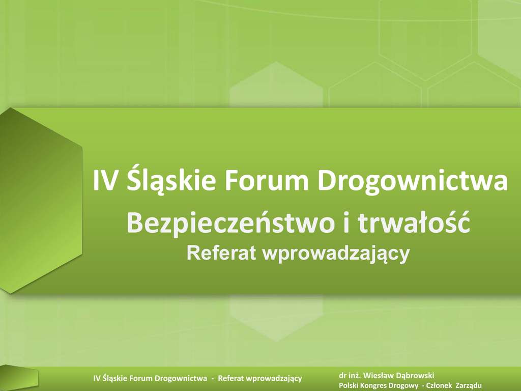 IV Śląskie Forum Drogownictwa Bezpieczeństwo i trwałość Referat wprowadzający IV Śląskie Forum Drogownictwa - Referat wprowadzający dr inż. Wiesław Dąbrowski Polski Kongres Drogowy - Członek Zarządu „Mobilność” - synonim XXI wieku 1. Mobilność, tj. skłonność do zmiany miejsca i wynikająca stąd potrzeba sprawnej komunikacji była, jest i będzie naturalną cechą i niezbywalnym prawem człowieka. 2. Mobilność odgrywa wielką rolę w naszym życiu: przyczynia się do zmniejszenia różnic społecznych, poprawy jakości życia oraz zmniejszenia bezrobocia. 3. Sieć drogowa z nawierzchniami stosownymi do wymagań ruchu ułatwia mobilność, działalność gospodarczą, inwestycyjną i rozwój społeczny. IV Śląskie Forum Drogownictwa dr inż. Wiesław Dąbrowski Polski Kongres Drogowy – Członek Zarządu 2 Aktualna sytuacja 1. Ciągły wzrost obciążenia ruchem nawierzchni drogowych w Polsce. 2. Dużo nowych inwestycji drogowych. 3. Rośnie szybko powierzchnia nawierzchni drogowych, które będą wymagały zabiegów utrzymaniowych i naprawczych. 4. Duże możliwości finansowania inwestycji drogowych, stosunkowo małe nakłady na utrzymanie i remonty. 5. Dostępność aktualnej wiedzy teoretycznej i praktycznej. 6. Duże możliwości wykonawcze przedsiębiorstw. IV Śląskie Forum Drogownictwa dr inż. Wiesław Dąbrowski Polski Kongres Drogowy – Członek Zarządu 3 Generalny problem drogownictwa Problemem jest zapewnienie Najniższych kosztów społecznych mobilności IV Śląskie Forum Drogownictwa dr inż. Wiesław Dąbrowski Polski Kongres Drogowy – Członek Zarządu 4 Czynniki kształtujące społeczne koszty mobilności 1. 2. 3. 4. Bezpieczeństwo ruchu dobre właściwości przeciwślizgowe nawierzchni. Zużycie energii możliwie małe opory toczenia, jasność nawierzchni. Obciążenie dla środowiska niska emisja CO2, niska emisja hałasu. Czas użytkowników drogi mała uciążliwość zabiegów utrzymaniowych i remontowych. Długie okresy użyteczności technicznej i ekonomicznej konstrukcji nawierzchni. IV Śląskie Forum Drogownictwa dr inż. Wiesław Dąbrowski Polski Kongres Drogowy – Członek Zarządu 5 Bezpieczeństwo i trwałość Transfer wiedzy podczas IV Śląskiego Forum 1. Propozycje nowego standardu oznakowania pionowego (zaproponowanego przez Federację Drogową Unii Europejskiej ERF) 2. Nawierzchnie drogowe z zastosowaniem asfaltów wysokomodyfikowanych W myśl dewizy: „Dążenie do najniższych kosztów mobilności jest społecznym celem i obowiązkiem drogownictwa”. IV Śląskie Forum Drogownictwa dr inż. Wiesław Dąbrowski Polski Kongres Drogowy – Członek Zarządu 6
