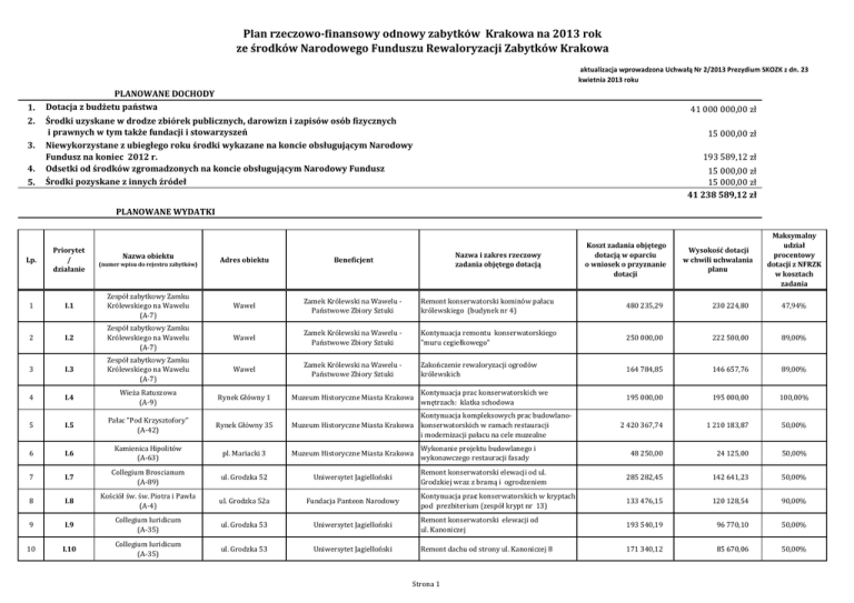 Plan rzeczowo-finansowy odnowy zabytków Krakowa na 2013 rok ze środków Narodowego Funduszu Rewaloryzacji Zabytków Krakowa aktualizacja wprowadzona Uchwałą Nr 2/2013 Prezydium SKOZK z dn. 23 kwietnia 2013 roku 1. 2. 3. 4. 5. PLANOWANE DOCHODY Dotacja z budżetu państwa 41 000 000,00 zł Środki uzyskane w drodze zbiórek publicznych, darowizn i zapisów osób fizycznych i prawnych w tym także fundacji i stowarzyszeń Niewykorzystane z ubiegłego roku środki wykazane na koncie obsługującym Narodowy Fundusz na koniec 2012 r. Odsetki od środków zgromadzonych na koncie obsługującym Narodowy Fundusz Środki pozyskane z innych źródeł 15 000,00 zł 193 589,12 zł 15 000,00 zł 15 000,00 zł 41 238 589,12 zł PLANOWANE WYDATKI Lp. Priorytet / działanie 1 I.1 2 Nazwa obiektu Nazwa i zakres rzeczowy zadania objętego dotacją Koszt zadania objętego dotacją w oparciu o wniosek o przyznanie dotacji Wysokość dotacji w chwili uchwalania planu Maksymalny udział procentowy dotacji z NFRZK w kosztach zadania Adres obiektu Beneficjent Zespół zabytkowy Zamku Królewskiego na Wawelu (A-7) Wawel Zamek Królewski na Wawelu Państwowe Zbiory Sztuki Remont konserwatorski kominów pałacu królewskiego (budynek nr 4) 480 235,29 230 224,80 47,94% I.2 Zespół zabytkowy Zamku Królewskiego na Wawelu (A-7) Wawel Zamek Królewski na Wawelu Państwowe Zbiory Sztuki Kontynuacja remontu konserwatorskiego "muru cegiełkowego" 250 000,00 222 500,00 89,00% 3 I.3 Zespół zabytkowy Zamku Królewskiego na Wawelu (A-7) Wawel Zamek Królewski na Wawelu Państwowe Zbiory Sztuki Zakończenie rewaloryzacji ogrodów królewskich 164 784,85 146 657,76 89,00% 4 I.4 Wieża Ratuszowa (A-9) Rynek Główny 1 Muzeum Historyczne Miasta Krakowa Kontynuacja prac konserwatorskich we wnętrzach: klatka schodowa 195 000,00 195 000,00 100,00% 5 I.5 Pałac "Pod Krzysztofory" (A-42) Rynek Główny 35 Kontynuacja kompleksowych prac budowlanoMuzeum Historyczne Miasta Krakowa konserwatorskich w ramach restauracji i modernizacji pałacu na cele muzealne 2 420 367,74 1 210 183,87 50,00% 6 I.6 Kamienica Hipolitów (A-63) pl. Mariacki 3 Muzeum Historyczne Miasta Krakowa 48 250,00 24 125,00 50,00% 7 I.7 Collegium Broscianum (A-89) ul. Grodzka 52 Uniwersytet Jagielloński Remont konserwatorski elewacji od ul. Grodzkiej wraz z bramą i ogrodzeniem 285 282,45 142 641,23 50,00% 8 I.8 Kościół św. św. Piotra i Pawła (A-4) ul. Grodzka 52a Fundacja Panteon Narodowy Kontynuacja prac konserwatorskich w kryptach pod prezbiterium (zespół krypt nr 13) 133 476,15 120 128,54 90,00% 9 I.9 Collegium Iuridicum (A-35) ul. Grodzka 53 Uniwersytet Jagielloński Remont konserwatorski elewacji od ul. Kanoniczej 193 540,19 96 770,10 50,00% 10 I.10 Collegium Iuridicum (A-35) ul. Grodzka 53 Uniwersytet Jagielloński Remont dachu od strony ul. Kanoniczej 8 171 340,12 85 670,06 50,00% (numer wpisu do rejestru zabytków) Wykonanie projektu budowlanego i wykonawczego restauracji fasady Strona 1 11 I.11 d. Pałac Arcybiskupów Gnieźnieńskich Urząd Skarbowy Kraków - Stare Miasto (A-429) 12 I.12 Pałac Wielopolskich (A-129) pl. Wszystkich Świętych 3-4 13 I.13 Dom Długosza Uniwersytet Papieski Jana Pawła II (A-51) ul. Kanonicza 25 Uniwersytet Papieski Jana Pawła II w Krakowie 14 I.14 Muzeum Archeologiczne w Krakowie d. Klasztor Karmelitów (A-90) ul. Senacka 3 Muzeum Archeologiczne w Krakowie 15 I.15 Collegium Witkowskiego (A-755) ul. Gołębia 13 Uniwersytet Jagielloński 16 I.16 Collegium Philologicum (A-313) ul. Gołębia 20 17 I.17 Collegium Novum (A-315) 18 I.18 19 Urząd Skarbowy Kraków - Stare Miasto Remont więźby dachowej z wymianą pokrycia dachowego - I etap 400 000,00 200 000,00 50,00% 810 827,65 405 413,83 50,00% Wykonanie projektu izolacji i napraw konstrukcyjnych elewacji południowej wraz z koniecznymi badaniami 87 916,09 43 958,05 50,00% Zakończenie prac związanych z zabezpieczeniem konstrukcyjnym obiektu 91 671,49 91 671,49 100,00% Kontynuacja remontu wnętrz - poziom suteren i piwnic 306 708,51 153 354,26 50,00% Uniwersytet Jagielloński Remont konserwatorski pomieszczeń biblioteki na parterze budynku 278 263,45 139 131,73 50,00% ul. Gołębia 24 Uniwersytet Jagielloński Remont konserwatorski portyku ze wzmocnieniem konstrukcyjnym posadowienia, wymianą posadzki i remontem schodów bocznych 177 800,00 88 900,00 50,00% Collegium Novum (A-315) ul. Gołębia 24 Uniwersytet Jagielloński Remont dachu - I etap 1 825 451,00 912 725,50 50,00% I.19 Collegium Novum (A-315) ul. Gołębia 24 Uniwersytet Jagielloński Remont konserwatorski posadzki ceramicznej holu wejściowego 278 363,00 139 181,50 50,00% 20 I.20 Collegium Kołłątaja (A-100) ul. św. Anny 6/ ul. Gołębia 9 Uniwersytet Jagielloński Kontynuacja remontu kompleksowego w obrębie dziedzińca od ul. św. Anny 576 246,22 288 123,11 50,00% 21 I.21 Collegium Nowodworskiego (A-101) ul. św. Anny 12 Uniwersytet Jagielloński Collegium Medicum Naprawa konstrukcji więźby dachowej 243 701,74 121 850,87 50,00% 22 I.22 Gmach Muzeum XX Czartoryskich (A-107) ul. św. Jana 19 Fundacja XX Czartoryskich Prace konserwatorskie przy zabytkowych elementach kamiennych i metalowych 98 787,39 87 920,78 89,00% 23 I.23 Gmach Muzeum XX Czartoryskich (A-107) ul. św. Jana 19 Fundacja XX Czartoryskich Prace remontowo-konserwatorskie przy wewnętrznej attyce dziedzińca 118 143,17 59 071,59 50,00% 24 I.24 Gmach Muzeum XX Czartoryskich (A-107) ul. św. Jana 19 Fundacja XX Czartoryskich Kontynuacja konserwacji drewnianych elementów zabytkowych w pałacu i oficynie 249 083,49 221 684,31 89,00% 25 I.25 Kamienica Jordanowska (A-543) ul. Szpitalna 24 Parafia Prawosławna pw. Zaśnięcia NMP w Krakowie Projekt remontu konserwatorskiego piwnicy z przeznaczeniem na Centrum Sztuki Sakralnej 117 123,00 105 410,70 90,00% I.26 Budynek Miniatura Teatru im. Juliusza Słowackiego (A-946) pl. św. Ducha 2 Teatr im. Juliusza Słowackiego w Krakowie Zakończenie remontu konserwatorskiego pokrycia dachowego wraz