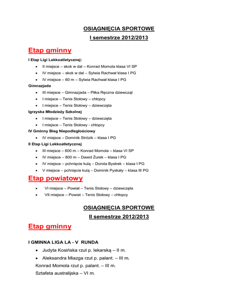 OSIĄGNIĘCIA SPORTOWE I semestrze 2012/2013 Etap gminny I Etap Ligi Lekkoatletycznej: II miejsce – skok w dal – Konrad Momola klasa VI SP IV miejsce – skok w dal – Sylwia Rachwał klasa I PG IV miejsce – 60 m – Sylwia Rachwał klasa I PG Gimnazjada III miejsce – Gimnazjada – Piłka Ręczna dziewcząt I miejsce – Tenis Stołowy – chłopcy I miejsce – Tenis Stołowy – dziewczęta Igrzyska Młodzieży Szkolnej I miejsce – Tenis Stołowy – dziewczęta I miejsce – Tenis Stołowy - chłopcy IV Gminny Bieg Niepodległościowy IV miejsce – Dominik Strózik – klasa I PG II Etap Ligi Lekkoatletycznej III miejsce – 600 m – Konrad Momola – klasa VI SP IV miejsce – 800 m – Dawid Żurek – klasa I PG IV miejsce – pchnięcie kulą – Dorota Bystrek – klasa I PG V miejsce – pchnięcie kulą – Dominik Pyskaty – klasa III PG Etap powiatowy VI miejsce – Powiat – Tenis Stołowy – dziewczęta VII miejsce – Powiat – Tenis Stołowy – chłopcy OSIĄGNIĘCIA SPORTOWE II semestrze 2012/2013 Etap gminny I GMINNA LIGA LA - V RUNDA Judyta Kosińska rzut p. lekarską – II m. Aleksandra Miazga rzut p. palant. – III m. Konrad Momola rzut p. palant. – III m. Sztafeta australijska – VI m. I GMINNA LIGA LA - III RUNDA Baw się z nami – IX miejsce I GMINNA LIGA LA – FINAŁ- VII miejsce Judyta Kosińska rzut p. lekarską – I m. Sylwia Rachwał skok w dal – I m. Dorota Bystrek pchnięcie kulą – II m. Konrad Momola bieg 600m – II m. skok w dal – IV m. rzut p. palant. – IV m. Dawid Żurek bieg 800m – IV m. Aleksandra Miazga rzut p. palant. – IV m. IX GMINNA SPARTAKIADA SPORTOWO - LEKKOATLETYCZNA – XI miejsce Kinga Szela Bieg 60m – III m. Natalia Skórska Skok w dal – II m. Paulina Miela Bieg przełajowy – III m. Strzały do bramki – IV m. Wiktoria Kosińska Rzut p. lek. – IV m. Sylwia Rachwał Bieg 400m – I m. Bieg przełajowy – II m. Kinga Żurek DART – I m. Weronika Synowiecka DART – III m. Dominik Strózik Cross rowerowy – IV m. -Sebastian Gulis Rzuty do kosza – IV m. TURNIEJ SIATKARSKI O PUCHAR DYREKTORA ZESPOŁU SZKÓŁ W ZAWADZIE Uczniowie gimnazjum III miejsce GIMNAZJADA PIŁKA SIATKOWA DZIEWCZĄT Uczennice gimnazjum V miejsce Etap powiatowy POWIATOWE IGRZYSKA MŁODZIEŻY SZKOLNEJ TENIS STOŁOWY CHŁOPCÓW Sebastian Świętoń, Arkadiusz Strzałka V miejsce POWIATOWA GIMNAZJADA TENIS STOŁOWY DZIEWCZĄT Judyta Kosińska, Wiktoria Kosińska VIII miejsce