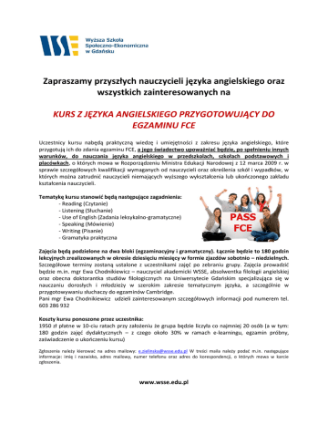 Zapraszamy przyszłych nauczycieli języka angielskiego oraz wszystkich zainteresowanych na KURS Z JĘZYKA ANGIELSKIEGO PRZYGOTOWUJĄCY DO EGZAMINU FCE Uczestnicy kursu nabędą praktyczną wiedzę i umiejętności z zakresu języka angielskiego, które przygotują ich do zdania egzaminu FCE, a jego świadectwo upoważniać będzie, po spełnieniu innych warunków, do nauczania języka angielskiego w przedszkolach, szkołach podstawowych i placówkach, o których mowa w Rozporządzeniu Ministra Edukacji Narodowej z 12 marca 2009 r. w sprawie szczegółowych kwalifikacji wymaganych od nauczycieli oraz określenia szkół i wypadków, w których można zatrudnić nauczycieli niemających wyższego wykształcenia lub ukończonego zakładu kształcenia nauczycieli. Tematykę kursu stanowić będą następujące zagadnienia: - Reading (Czytanie) - Listening (Słuchanie) - Use of English (Zadania leksykalno-gramatyczne) - Speaking (Mówienie) - Writing (Pisanie) - Gramatyka praktyczna Zajęcia będą podzielone na dwa bloki (egzaminacyjny i gramatyczny). Łącznie będzie to 180 godzin lekcyjnych zrealizowanych w okresie dziesięciu miesięcy w formie zjazdów sobotnio – niedzielnych. Szczegółowe terminy zostaną ustalone z uczestnikami zajęć po zebraniu grupy. Zajęcia prowadzić będzie m.in. mgr Ewa Chodnikiewicz – nauczyciel akademicki WSSE, absolwentka filologii angielskiej oraz obecna doktorantka studiów filologicznych na Uniwersytecie Gdańskim specjalizująca się w nauczaniu dorosłych i młodzieży w szerokim zakresie tematycznym języka, a szczególnie w przygotowywaniu słuchaczy do egzaminów Cambridge. Pani mgr Ewa Chodnikiewicz udzieli zainteresowanym szczegółowych informacji pod numerem tel. 603 286 932 Koszty kursu ponoszone przez uczestnika: 1950 zł płatne w 10-ciu ratach przy założeniu że grupa będzie liczyła co najmniej 20 osób (a w tym: 180 godzin zajęć dydaktycznych – z czego około 30% w ramach e-learningu, egzamin próbny, zaświadczenie o ukończeniu kursu) Zgłoszenia należy kierować na adres mailowy: [email protected] W treści maila należy podać m.in. następujące informacje: imię i nazwisko, adres mailowy, numer telefonu oraz adres do korespondencji, o których mowa w karcie zgłoszenia. www.wsse.edu.pl