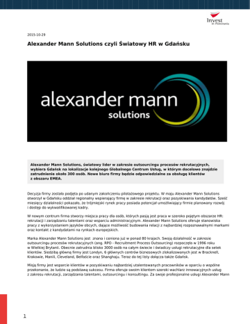 2015-10-29 Alexander Mann Solutions czyli Światowy HR w Gdańsku Alexander Mann Solutions, światowy lider w zakresie outsourcingu procesów rekrutacyjnych, wybiera Gdańsk na lokalizacje kolejnego Globalnego Centrum Usług, w którym docelowo znajdzie zatrudnienie około 300 osób. Nowe biuro firmy będzie odpowiedzialne za obsługę klientów z obszaru EMEA. Decyzja firmy została podjęta po udanym zakończeniu pilotażowego projektu. W maju Alexander Mann Solutions otworzył w Gdańsku oddział regionalny wspierający firmę w zakresie rekrutacji oraz pozyskiwania kandydatów. Sześć miesięcy działalności pokazało, że trójmiejski rynek pracy posiada potencjał umożliwiający firmie planowany rozwój i dostęp do wykwalifikowanej kadry. W nowym centrum firma stworzy miejsca pracy dla osób, których pasją jest praca w szeroko pojętym obszarze HR: rekrutacji i zarządzaniu talentami oraz wsparciu administracyjnym. Alexander Mann Solutions oferuje stanowiska pracy z wykorzystaniem języków obcych, dające możliwość budowania relacji z najbardziej rozpoznawalnymi markami oraz kontakt z kandydatami na rynkach europejskich. Marka Alexander Mann Solutions jest znana i ceniona już w ponad 80 krajach. Swoją działalność w zakresie outsourcingu procesów rekrutacyjnych (ang. RPO - Recruitment Process Outsourcing) rozpoczęła w 1996 roku w Wielkiej Brytanii. Obecnie zatrudnia blisko 3000 osób na całym świecie i świadczy usługi rekrutacyjne dla setek klientów. Siedzibą główną firmy jest Londyn, 6 głównych centrów biznesowych zlokalizowanych jest w Bracknell, Krakowie, Manili, Cleveland, Belfaście oraz Shanghaju. Teraz do tej listy dołącza także Gdańsk. Misją firmy jest wsparcie klientów w pozyskiwaniu najbardziej utalentowanych pracowników w oparciu o wspólne przekonanie, że ludzie są podstawą sukcesu. Firma oferuje swoim klientom szeroki wachlarz innowacyjnych usług z zakresu rekrutacji, zarządzania talentami, outsourcingu i konsultingu. Za swoje profesjonalne usługi Alexander Mann 1 Solutions sześciokrotnie otrzymał nagrodę "Inwestor w Kapitał Ludzki". Z kolei nowatorski program firmy, dotyczący promocji otwartej komunikacji pomiędzy pracownikami, został wyróżniony nagrodą Komunikatywny Pracodawca. W 2013 roku Alexander Mann Solutions zdobył także nagrody: „Best Employer of the Year – BPO/Outsourcing” oraz „Best BPO firm of the year”. W 2014 oraz 2015 Alexander Mann Solutions otrzymał wyróżnienie Great Place to Work. Istniejące Centrum w Krakowie zapewnia wsparcie operacyjne dla ponad 45 klientów w 24 krajach w obszarze EMEA. Klientami są ogólnoświatowe, marki z różnych sektorów, miedzy innymi: bankowości inwestycyjnej, przemysłu obronnego, energetyki, sektora paliwowego, IT. Alexander Mann Solutions dostarcza również swoje usługi dla 15 klientów z sektora BPO/SSC czy bankowości w Polsce m.in. na terenie Wrocławia, Łodzi i Warszawy. Nowa siedziba w Gdańsku da możliwość zatrudnienia zarówno osobom z doświadczeniem w branży, jak i rozpoczynającym swoją karierę absolwentom wszystkich kierunków. W przypadku odpowiedniego klimatu inwestycyjnego gdański oddział planuje zatrudnienie około 100 osób do końca 2015 roku. „Do tej pory lokalny sektor nowoczesnych usług biznesowych nie posiadał firmy, która działałaby na taką skalę w zakresie outsourcingu procesów rekrutacyjnych. Decyzja AMS o otwarciu w Gdańsku nowego centrum pokazuje jak wielu pracowników w regionie posiada kwalifikacje niezbędne w wymagających, ale jednocześnie bardzo atrakcyjnych projektach rekrutacyjnych prowadzonych dla klientów firmy na całym świecie. Inwestycja AMS niewątpliwie wpłynie również na zwiększenie atrakcyjności inwestycyjnej całego regionu.”– mówi Marcin Grzegory, Project Manager – sektor BPO/SSC w Invest in Pomerania Pomysł otwarcia oddziału w Gdańsku był od samego początku aktywnie wspierany przez inicjatywę Invest in Pomerania. Szczególną rolę w procesie decyzyjnym odegrały: Agencja Rozwoju Pomorza oraz Gdańska Agencja Rozwoju Gospodarczego (InvestGDA). Projekt został zrealizowany we współpracy z CBRE - największą na świecie firmą doradczą w sektorze nieruchomości komercyjnych i nowych strategii miejsc pracy. Nowa siedziba Alexander Mann Solutions będzie się mieścić w kompleksie Alchemia - wielofunkcyjnym i najnowocześniejszym obiekcie biurowym Trójmiasta. Oficjalne otwarcie biura planowane jest na luty 2016 roku. 2
