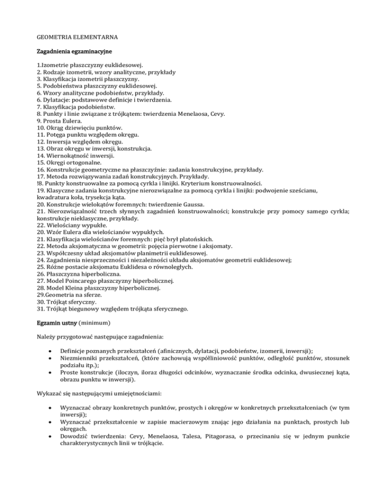 GEOMETRIA ELEMENTARNA Zagadnienia egzaminacyjne 1.Izometrie płaszczyzny euklidesowej. 2. Rodzaje izometrii, wzory analityczne, przykłady 3. Klasyfikacja izometrii płaszczyzny. 5. Podobieństwa płaszczyzny euklidesowej. 6. Wzory analityczne podobieństw, przykłady. 6. Dylatacje: podstawowe definicje i twierdzenia. 7. Klasyfikacja podobieństw. 8. Punkty i linie związane z trójkątem: twierdzenia Menelaosa, Cevy. 9. Prosta Eulera. 10. Okrąg dziewięciu punktów. 11. Potęga punktu względem okręgu. 12. Inwersja względem okręgu. 13. Obraz okręgu w inwersji, konstrukcja. 14. Wiernokątność inwersji. 15. Okręgi ortogonalne. 16. Konstrukcje geometryczne na płaszczyźnie: zadania konstrukcyjne, przykłady. 17. Metoda rozwiązywania zadań konstrukcyjnych. Przykłady. !8. Punkty konstruowalne za pomocą cyrkla i linijki. Kryterium konstruowalności. 19. Klasyczne zadania konstrukcyjne nierozwiązalne za pomocą cyrkla i linijki: podwojenie sześcianu, kwadratura koła, trysekcja kąta. 20. Konstrukcje wielokątów foremnych: twierdzenie Gaussa. 21. Nierozwiązalność trzech słynnych zagadnień konstruowalności; konstrukcje przy pomocy samego cyrkla; konstrukcje nieklasyczne, przykłady. 22. Wielościany wypukłe. 20. Wzór Eulera dla wielościanów wypukłych. 21. Klasyfikacja wielościanów foremnych: pięć brył platońskich. 22. Metoda aksjomatyczna w geometrii: pojęcia pierwotne i aksjomaty. 23. Współczesny układ aksjomatów planimetrii euklidesowej. 24. Zagadnienia niesprzeczności i niezależności układu aksjomatów geometrii euklidesowej; 25. Różne postacie aksjomatu Euklidesa o równoległych. 26. Płaszczyzna hiperboliczna. 27. Model Poincarego płaszczyzny hiperbolicznej. 28. Model Kleina płaszczyzny hiperbolicznej. 29.Geometria na sferze. 30. Trójkąt sferyczny. 31. Trójkąt biegunowy względem trójkąta sferycznego. Egzamin ustny (minimum) Należy przygotować następujące zagadnienia: Definicje poznanych przekształceń (afinicznych, dylatacji, podobieństw, izomerii, inwersji); Niezmienniki przekształceń, (które zachowują współliniowość punktów, odległość punktów, stosunek podziału itp.); Proste konstrukcje (iloczyn, iloraz długości odcinków, wyznaczanie środka odcinka, dwusiecznej kąta, obrazu punktu w inwersji). Wykazać się następującymi umiejętnościami: Wyznaczać obrazy konkretnych punktów, prostych i okręgów w konkretnych przekształceniach (w tym inwersji); Wyznaczać przekształcenie w zapisie macierzowym znając jego działania na punktach, prostych lub okręgach. Dowodzić twierdzenia: Cevy, Menelaosa, Talesa, Pitagorasa, o przecinaniu się w jednym punkcie charakterystycznych linii w trójkącie.