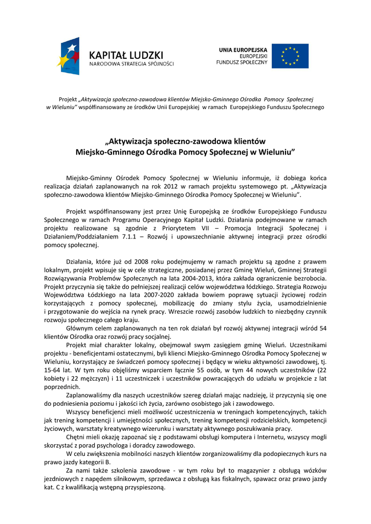 Projekt „Aktywizacja społeczno-zawodowa klientów Miejsko-Gminnego Ośrodka Pomocy Społecznej w Wieluniu” współfinansowany ze środków Unii Europejskiej w ramach Europejskiego Funduszu Społecznego „Aktywizacja społeczno-zawodowa klientów Miejsko-Gminnego Ośrodka Pomocy Społecznej w Wieluniu” Miejsko-Gminny Ośrodek Pomocy Społecznej w Wieluniu informuje, iż dobiega końca realizacja działań zaplanowanych na rok 2012 w ramach projektu systemowego pt. „Aktywizacja społeczno-zawodowa klientów Miejsko-Gminnego Ośrodka Pomocy Społecznej w Wieluniu”. Projekt współfinansowany jest przez Unię Europejską ze środków Europejskiego Funduszu Społecznego w ramach Programu Operacyjnego Kapitał Ludzki. Działania podejmowane w ramach projektu realizowane są zgodnie z Priorytetem VII – Promocja Integracji Społecznej i Działaniem/Poddziałaniem 7.1.1 – Rozwój i upowszechnianie aktywnej integracji przez ośrodki pomocy społecznej. Działania, które już od 2008 roku podejmujemy w ramach projektu są zgodne z prawem lokalnym, projekt wpisuje się w cele strategiczne, posiadanej przez Gminę Wieluń, Gminnej Strategii Rozwiązywania Problemów Społecznych na lata 2004-2013, która zakłada ograniczenie bezrobocia. Projekt przyczynia się także do pełniejszej realizacji celów województwa łódzkiego. Strategia Rozwoju Województwa Łódzkiego na lata 2007-2020 zakłada bowiem poprawę sytuacji życiowej rodzin korzystających z pomocy społecznej, mobilizację do zmiany stylu życia, usamodzielnienie i przygotowanie do wejścia na rynek pracy. Wreszcie rozwój zasobów ludzkich to niezbędny czynnik rozwoju społecznego całego kraju. Głównym celem zaplanowanych na ten rok działań był rozwój aktywnej integracji wśród 54 klientów Ośrodka oraz rozwój pracy socjalnej. Projekt miał charakter lokalny, obejmował swym zasięgiem gminę Wieluń. Uczestnikami projektu - beneficjentami ostatecznymi, byli klienci Miejsko-Gminnego Ośrodka Pomocy Społecznej w Wieluniu, korzystający ze świadczeń pomocy społecznej i będący w wieku aktywności zawodowej, tj. 15-64 lat. W tym roku objęliśmy wsparciem łącznie 55 osób, w tym 44 nowych uczestników (22 kobiety i 22 mężczyzn) i 11 uczestniczek i uczestników powracających do udziału w projekcie z lat poprzednich. Zaplanowaliśmy dla naszych uczestników szereg działań mając nadzieję, iż przyczynią się one do podniesienia poziomu i jakości ich życia, zarówno osobistego jak i zawodowego. Wszyscy beneficjenci mieli możliwość uczestniczenia w treningach kompetencyjnych, takich jak trening kompetencji i umiejętności społecznych, trening kompetencji rodzicielskich, kompetencji życiowych, warsztaty kreatywnego wizerunku i warsztaty aktywnego poszukiwania pracy. Chętni mieli okazję zapoznać się z podstawami obsługi komputera i Internetu, wszyscy mogli skorzystać z porad psychologa i doradcy zawodowego. W celu zwiększenia mobilności naszych klientów zorganizowaliśmy dla podopiecznych kurs na prawo jazdy kategorii B. Za nami także szkolenia zawodowe - w tym roku był to magazynier z obsługą wózków jezdniowych z napędem silnikowym, sprzedawca z obsługą kas fiskalnych, spawacz oraz prawo jazdy kat. C z kwalifikacją wstępną przyspieszoną. Wsparciem objęliśmy także otoczenie naszych klientów. Z okazji Dnia Dziecka uczestnicy projektu wraz z dziećmi wzięli udział w wycieczce kulturalno-integracyjnej do Parku Jurajskiego w Krasiejowie i Ogrodu Zoologicznego w Opolu. W Krasiejowie uczestnicy wycieczki poznali prawie 70 gatunków wymarłych gadów i płazów, wzięli udział w warsztatach plastyczno-paleontologicznych, a najmłodsi bawili się na placu zabaw, który okazał się idealnym miejscem umożliwiającym bezpieczne ujście dziecięcej energii. Niewątpliwą atrakcją był także seans w kinie 5D. W Opolu natomiast uczestnicy mogli poznać tajniki życia dzikich zwierząt i pod opieką dorosłych wzbogacić swój świat przebywając w mini zoo, w którym mogli dotykać i karmić młode zwierzęta. We wrześniu liczna grupa uczestników i osób z ich najbliższego otoczenia brała udział w wyjeździe do Łodzi i uczestniczyła w spektaklu teatralnym. Dwadzieścioro dzieci uczestników projektu mogło również wyjechać na letnie kolonie w Międzyzdrojach. Proponując naszym klientom tak różnorodny szereg oddziaływań szkoleniowych i integracyjnych wierzymy, że pozwolą one naszym klientom na nowo złapać wiatr w żagle, by wykrzesać wewnętrzne siły, przydatne do wyzwalania się z apatii, zniechęcenia i bezsilności, i podjąć wysiłek własnego rozwoju. Obecnie prowadzimy działania związane z rekrutacją beneficjentów do udziału w projekcie w 2013 roku a wszystkim tegorocznym uczestnikom serdecznie dziękujemy za czynny udział w projekcie i życzymy powodzenia w poszukiwaniu pracy i realizacji życiowych celów. Miejsko-Gminny Ośrodek Pomocy Społecznej w Wieluniu - realizator projektu