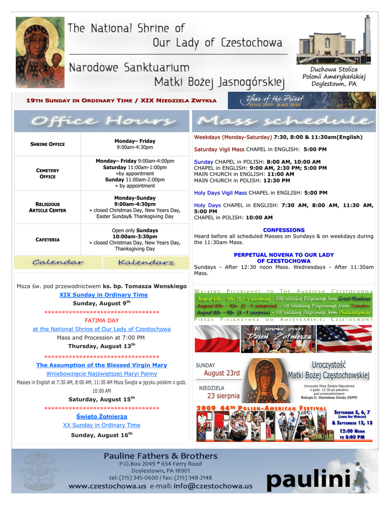 19TH SUNDAY IN ORDINARY TIME / XIX NIEDZIELA ZWYKŁA SHRINE OFFICE Monday– Friday 9:00am-4:30pm CEMETERY OFFICE Monday– Friday 9:00am-4:00pm Saturday 11:00am-1:00pm »by appointment Sunday 11:00am-2:00pm » by appointment RELIGIOUS ARTICLE CENTER Monday-Sunday 9:00am-4:30pm » closed Christmas Day, New Years Day, Easter Sunday& Thanksgiving Day CAFETERIA Open only Sundays 10:00am-3:30pm » closed Christmas Day, New Years Day, Thanksgiving Day Msza św. pod przewodnictwem ks. bp. Tomasza Wenskiego XIX Sunday in Ordinary Time Sunday, August 9th ««««««««««««««««»»»»»»»»»»»»»»»»» FATIMA DAY at the National Shrine of Our Lady of Czestochowa Mass and Procession at 7:00 PM Thursday, August 13th ««««««««««««««««»»»»»»»»»»»»»»»»» The Assumption of the Blessed Virgin Mary Wniebowzięcie Najświętszej Maryi Panny Masses in English at 7:30 AM, 8:00 AM, 11:30 AM Msza Święta w języku polskim o godz. 10:00 AM Saturday, August 15th ««««««««««««««««»»»»»»»»»»»»»»»»» Święto Żołnierza XX Sunday in Ordinary Time Sunday, August 16th Weekdays (Monday(Monday-Saturday) 7:30, 8:00 & 11:30am(English) Saturday Vigil Mass CHAPEL in ENGLISH: 5:00 PM Sunday CHAPEL in POLISH: 8:00 AM, 10:00 AM CHAPEL in ENGLISH: 9:00 AM, 2:30 PM; 5:00 PM MAIN CHURCH in ENGLISH: 11:00 AM MAIN CHURCH in POLISH: 12:30 PM Holy Days Vigil Mass CHAPEL in ENGLISH: 5:00 PM Holy Days CHAPEL in ENGLISH: 7:30 AM, 8:00 AM, 11:30 AM, 5:00 PM CHAPEL in POLISH: 10:00 AM CONFESSIONS Heard before all scheduled Masses on Sundays & on weekdays during the 11:30am Mass. PERPETUAL NOVENA TO OUR LADY OF CZESTOCHOWA Sundays - After 12:30 noon Mass. Wednesdays - After 11:30am Mass. Jesus invites the people to a new level of existence. They are to live in relationship to Him as the bread come down from heaven. However, just like Moses in the desert, Jesus must face the harshness of the human heart. The Israelites murmured against Moses. They even wanted to return to the bondage of Egypt. They were stiff-necked and rebellious. Here we go again, Jesus has said, “I am the bread that came down from heaven.” The crowd responds: “Is this not Jesus, the son of Joseph? Do we not know his father and mother? How can he claim to have come down from heaven?” The Fourth Gospel is prominent in capturing the divinity of Christ. However, we see in this episode a human moment in Jesus’ relationship to his own who will not accept him. He says to the crowd, “stop your murmuring (Gossiping)”. Murmuring (gossiping) is not just bad mouthing someone or rejecting what another says. In a wider sense, it is destructive of the human heart and community. Murmuring (gossiping) is a willful disbelief in the power of God to do what he said He would do, a refusal to believe the words of Jesus. Murmuring (gossiping) is a refusal to submit to the authority of God. To murmur is to undermine the plan of God and sow seeds of alienation and division. To murmur is a very dangerous person to him and to others. He weakens community life and provokes discontent among others. He especially tempts the weak to give into their passions. In the Rule of St. Benedict he uses some of the harshest words for the one who gives into murmuring (gossiping). The Christian community should be united in peace, humility weakness and charity. The one who gives into murmuring (gossiping), and cause to others likewise, destroys basic peace and rebels against God and the community superiors. Peace is the great gift to the community of believers. But the murmurer destroys the bonds of peace and love. Murmuring is a scandal, a grave offense. St. Paul, writing to the Ephesians, reminds them and us: “Do nothing to sadden the Holy Spirit with whom you were sealed against the day of redemption.” The Holy Spirit in John dwells within the community. The Spirit is one of joy and peace. Jesus has been raised form the dead. The Spirit has been given to us. We can eat daily the bread of eternal life for the “long journey” toward God. But we can also turn from God and sadden the Spirit by placing our own will and desires above loving God and serving the needs of the community. In a word, we give into murmuring. Murmuring is at the heart “of all bitterness,” all passion and anger, harsh words, slander malice of every kind.” How do we overcome murmuring in our hearts and communities? Daily life is hard, but it is the only one we have. We like the prophet Elijah in our first reading need to be strengthened for the journey. We need to follow the example of Jesus, and let God be our heavenly Father. We need the strength to make His will our own in loving obedience. The Eucharist is our spiritual nourishment as we journey toward that new Jerusalem. To eat the flesh and drink the blood of Jesus helps us to grow into mature children of God. We replace childish, willful murmuring (gossiping) with kindness, compassion and mutual forgiveness. We extend to others the peace and acceptance given to us in Christ. We are to stop our daily murmuring (gossiping) and “Follow the way of love, even as Christ loved us. He gave Himself for us as an offering to God, a gift of pleasing fragrance.” Eliasz na pustyni. Pustynia to zawsze wyjątkowy czas. A w całym Izraelu odejście od wiary w Jedynego Boga. Królowa Izabel utrzymuje setki fałszywych proroków, którzy deprabują naród. Krajem rządzi Achab, który chcąc posiąść winnice sąsiada, zabija go. I w takiej właśnie sytuacji staje Eliasz, który podejmuje próbę walki z całą tą sytuacją. Jak ogień, chce rozpalić wiarą serca rodaków, wytępia fałszywych proroków, walczy o życie swojego narodu. W końcu jednak ogarnia go zniechęcenie. Zmęczony, znienawidzony przez królową, prześladowany przez nią, idzie na pustynię i chce tam umrzeć, mówiąc Bogu, że ta walka już nie ma sensu i on nie ma już siły. Wtedy jednak przychodzi anioł, bud