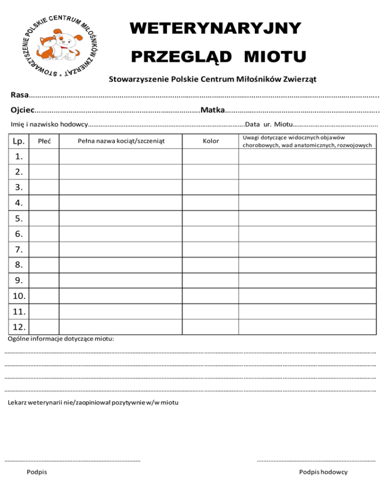 WETERYNARYJNY PRZEGLĄD MIOTU Stowarzyszenie Polskie Centrum Miłośników Zwierząt Rasa………………………………………………………………………………………………………………………………………………….. Ojciec…………………………………………………………………….Matka……………………………………………………………….. Imię i nazwisko hodowcy…………………………………………………………………………….Data ur. Miotu………………………………........... Lp. Płeć Pełna nazwa kociąt/szczeniąt Kolor Uwagi dotyczące widocznych objawów chorobowych, wad anatomicznych, rozwojowych 1. 2. 3. 4. 5. 6. 7. 8. 9. 10. 11. 12. Ogólne informacje dotyczące miotu: ………………………………………………………………………………………………………………………………………………………………………………………………………… ………………………………………………………………………………………………………………………………………………………………………………………………………… ………………………………………………………………………………………………………………………………………………………………………………………………………… ………………………………………………………………………………………………………………………………………………………………………………………………………… Lekarz weterynarii nie/zaopiniował pozytywnie w/w miotu ………………………………………………………………………… Podpis …….………………………………………………………… Podpis hodowcy