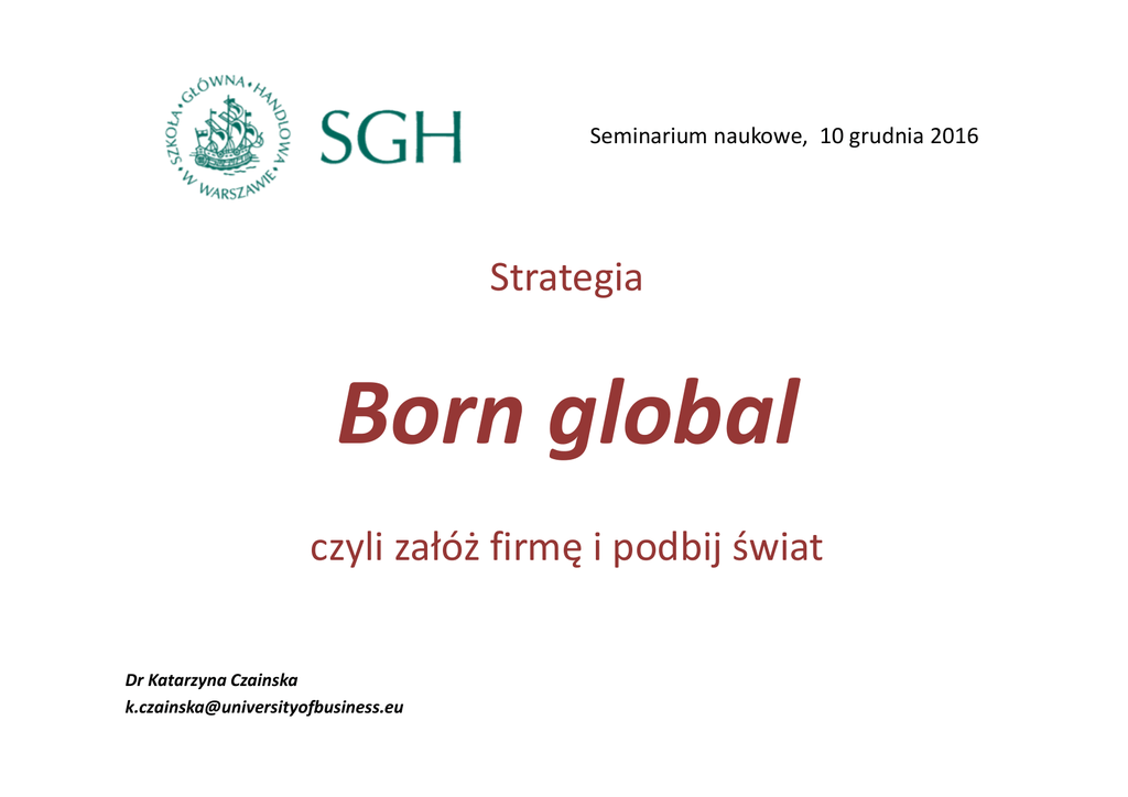 Seminarium naukowe, 10 grudnia 2016 Strategia Born global czyli załóż firmę i podbij świat Dr Katarzyna Czainska [email protected] Tradycyjny model internacjonalizacji przedsiębiorstw Cykl życia organizacji + eksport + import + oddziały lokalne Strategia born global Born global = E-commerce + business network + social networks E-commerce + born global Klienci, Dostawcy Inwestorzy Partnerzy Pracownicy …… Networking + born global Klienci, Dostawcy Inwestorzy Partnerzy Pracownicy …… Marketing w born global Klienci, Dostawcy Inwestorzy Partnerzy Pracownicy …… Interkulturowość w born global Klienci, Dostawcy Inwestorzy Partnerzy Pracownicy …… Zarządzanie w born global „Czynniki kształtujące kulturę organizacyjną przedsiębiorstw wielonarodowościowych”, Wydawnictwo Naukowe UAM, Poznań 2013 Zarządzanie w born global Część diagnostyczna aplikacji udostępniona jest za darmo na facebooku w 8 wersjach językowych: polskiej angielskiej duńskiej francuskiej holenderskiej hiszpańskiej niemieckiej włoskiej 10 grudnia 2016 Dr Katarzyna Czainska Dziękuję bardzo!
