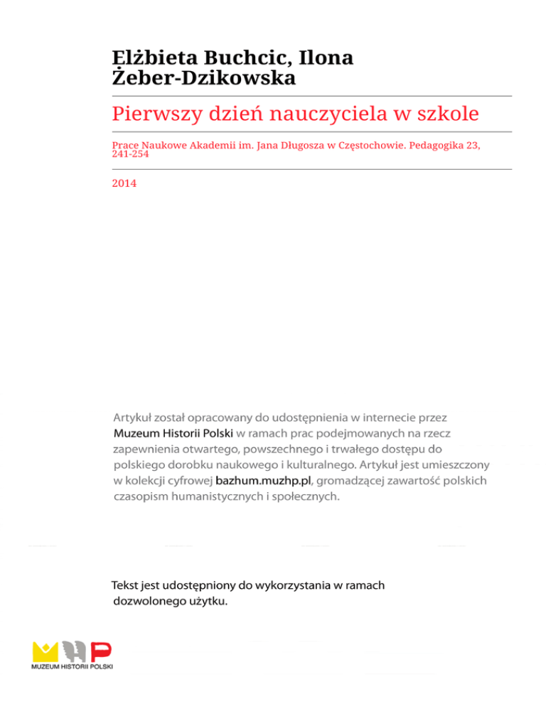 Elżbieta Buchcic, Ilona Żeber-Dzikowska Pierwszy dzień nauczyciela w szkole Prace Naukowe Akademii im. Jana Długosza w Częstochowie. Pedagogika 23, 241-254 2014 PRACE NAUKOWE Akademii im. Jana Długosza w Częstochowie Pedagogika 2014, t. XXIII, s. 241–254 http://dx.doi.org/10.16926/p.2014.23.18 Elżbieta BUCHCIC Ilona ŻEBER-DZIKOWSKA Pierwszy dzień nauczyciela w szkole Słowa kluczowe: szkoła, nauczyciel, profesjonalizm. Czy to nie cudowne, że możesz mieć wpływ na sukces drugiego człowieka. I czy to nie straszne, że możesz być przeszkodą w drodze do jego sukcesu?1 Nauczycielom społeczeństwo zawsze stawiało wysokie wymagania. Niewątpliwie oczekiwania formułowane wobec nich – w sposób jawny i niejawny – mają swój aspekt aksjologiczny i etyczny, ponieważ są to wymiary niepoddające się konwencjonalnym opisom, kategoryzacjom i ocenom. Wymagania te to działania charakterystyczne dla światłych przewodników i tłumaczy, swoistych pośredników między światem obowiązujących wartości a szkołą i uczniem2. Oczekujemy zatem, że nawet intuicyjnie artykułowane powinności grona pedagogicznego zostaną transformowane w konkretne działania i przyniosą wymierne efekty. Nakłada się na to tendencja do przypisywania temu zawodowi zadań często niemożliwych do realizacji, które powinno podjąć całe społeczeństwo3. 1. Przygotowanie zawodowe początkujących nauczycieli Przeobrażenia dokonujące się we współczesnym świecie są przemianami o nowej jakości i szkoła też powinna przybrać inny, nowy kształt, dlatego od1 2 3 J. Białobrzeska, Zostań nawiedzoną nauczycielką, czyli jak uczyć, żeby nauczyć, Didasko, Warszawa 2006, s. 12 H. Kwiatkowska, Potrzeba nowego usytuowania nauczyciela w kulturze, a problem nauczycielskiej tożsamości, [w:] Rozwój pedagogiki ogólnej. Inspiracje i ograniczenia kulturowe oraz poznawcze, red. A. Bogaj, IBE, Akademia Świętokrzyska, Warszawa – Kielce 2001, s. 73–74 T. Lewowicki, Niektóre tendencje w zakresie kształcenia nauczycieli, „Ruch Pedagogiczny” 1985, nr 5, s. 3. 242 Elżbieta BUCHCIC, Ilona ŻEBER-DZIKOWSKA miennie należy postrzegać również nauczyciela. Dziś ma on inne zadania do spełnienia niż jeszcze nawet 20 lat temu. Obecnie musi nauczać trudnej sztuki uczenia się, gromadzenia informacji, ich interpretowania, selekcjonowania, przekształcania, porządkowania, a przede wszystkim zastosowania. Oprócz tego młodzież – jak nigdy dotąd – oczekuje od profesorów wsparcia egzystencjalnego, uczenia o tym, jak żyć w skomplikowanym świecie, jak być sobą przy naporze unifikujących zabiegów mediów i grupy rówieśniczej, podczas presji mód młodzieżowych i powszechnej fascynacji marką. Ilekroć analizuje się niedomogi zawodowego przygotowania pedagogów, tylekroć podkreśla się przewagę kształcenia technicznego nad praktycznym, czyniąc z tego zarzut pod kątem ich kształcenia. Zwłaszcza nowicjusze, oceniając własne kwalifikacje, wskazują na niedostatek pragmatycznego wymiaru. Domagają się więc od uczelni gotowych sposobów reagowania w konkretnych sytuacjach pedagogicznych. Pragną być wyposażeni w niezawodne procedury działania. Współczesny wychowawca musi być otwarty na to, co dzieje się w otoczeniu społecznym, a także na problemy, z którymi boryka się „globalna wioska”. Dziś edukacja nie może być oderwana od kontekstu kulturowo-społecznego i jego przemian, wychowawca winien zatem umieć „czytać”, interpretować, a nade wszystko rozumieć procesy, które wykraczają daleko poza otoczenie szkoły. Potrzebna jest refleksja nad kształceniem pedagogów, świadomość – do jakiej pracy jest on przygotowywany. Osoby kończące specjalizację nauczycielską twierdzą, że uzyskane w toku studiów kwalifikacje nie przystają do współczesnych wymagań pracy dydaktycznej, a zwłaszcza pracy wychowawczej. W dużej mierze uczą się oni tego, co nie ułatwia zrozumienia współczesnej szkoły, a zwłaszcza interpretowania odmiennej sytuacji edukacyjnej i egzystencjonalnej dzisiejszej młodzieży. Mimo bogatej refleksji teoretycznej, dotyczącej kształcenia, praktyka edukacyjna pozostaje zapóźniona, cechuje ją tradycjonalizm. Przygotowanie zawodowe, nawet najlepsze miesiąc temu, może okazać się niewystarczające dzisiaj. Dydaktyk nigdy nie może spocząć na laurach, stale powinien rozwijać swoją osobowość, poszerzać swoje horyzonty. Istnieje dość powszechne przekonanie, że w procesie nauczania i wychowania główną rolę odgrywa nauczyciel. Efekty pracy zależą od wielu czynników, a istotną ich grupę stanowią te, które związane są z jego osobą. Zdaniem D. Cichy współczesne wychowanie zmierza do wszechstronnego rozwoju człowieka. Wszystkie elementy jego osobowości są wynikiem długotrwałego, ciągłego procesu wychowania i kształcenia, które w pracy szkoły powinny stanowić integralną całość oraz możliwie w największym stopniu integrować poszczególne dziedziny wiedzy, by ukazać scalony obraz świata. Spełnienie tych oczekiwań wymaga umiejętnego łączenia treści, metod, form pracy w zakresie wszystkich przedmiotów nauczania, ponieważ dziecko doświadcza, przeżywa, poznaje scaloną rzeczywistość poprzez aktywne działanie i bezpośredni kontakt ze światem4. 4 D. Cichy i in., Program nauczania zintegrowanego w klasach 1–3 szkoły podstawowej, Wyd. Juka, Warszawa 1999, s. 8. Pierwszy dzień nauczyciela w szkole 243 Dlatego od współczesnego nauczyciela oczekuje się i wymaga, że sprosta zmianom, jakie się ciągle dokonują w celach, treściach, metodach, formach oraz organizacji procesu kształcenia i wychowania. Jest to możliwe jedynie przy umiejętnym korzystaniu ze zorganizowanych form doskonalenia zawodowego i stałym samokształceniu5. Prawidłowo przygotowany do realizacji funkcji i obowiązków zawodowych nauczyciel powinien pomagać wychowankom w zrozumieniu złożonej i zmi